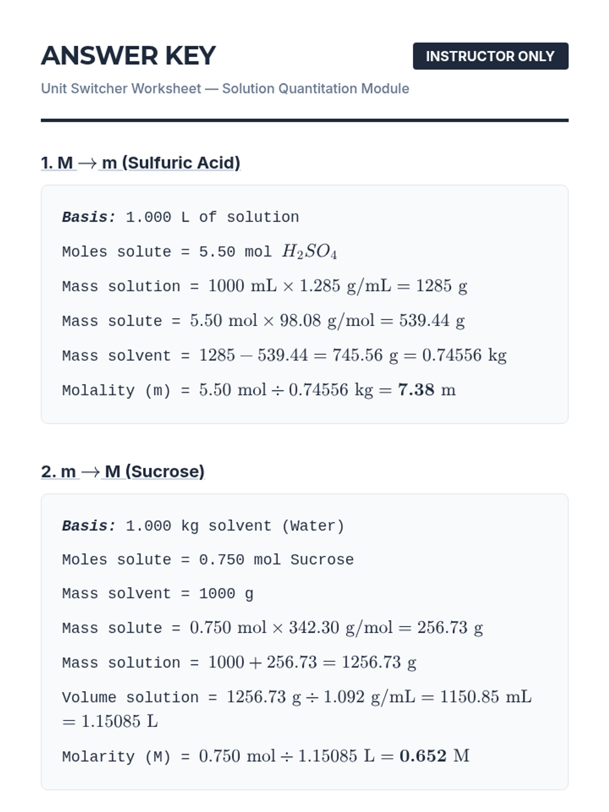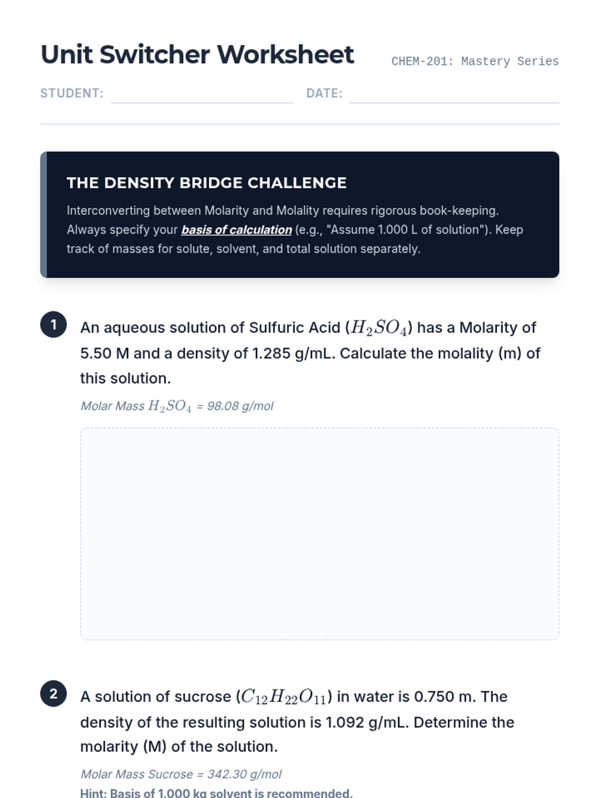 Advanced interconversion between molarity and molality using solution density as the quantitative bridge between mass and volume.