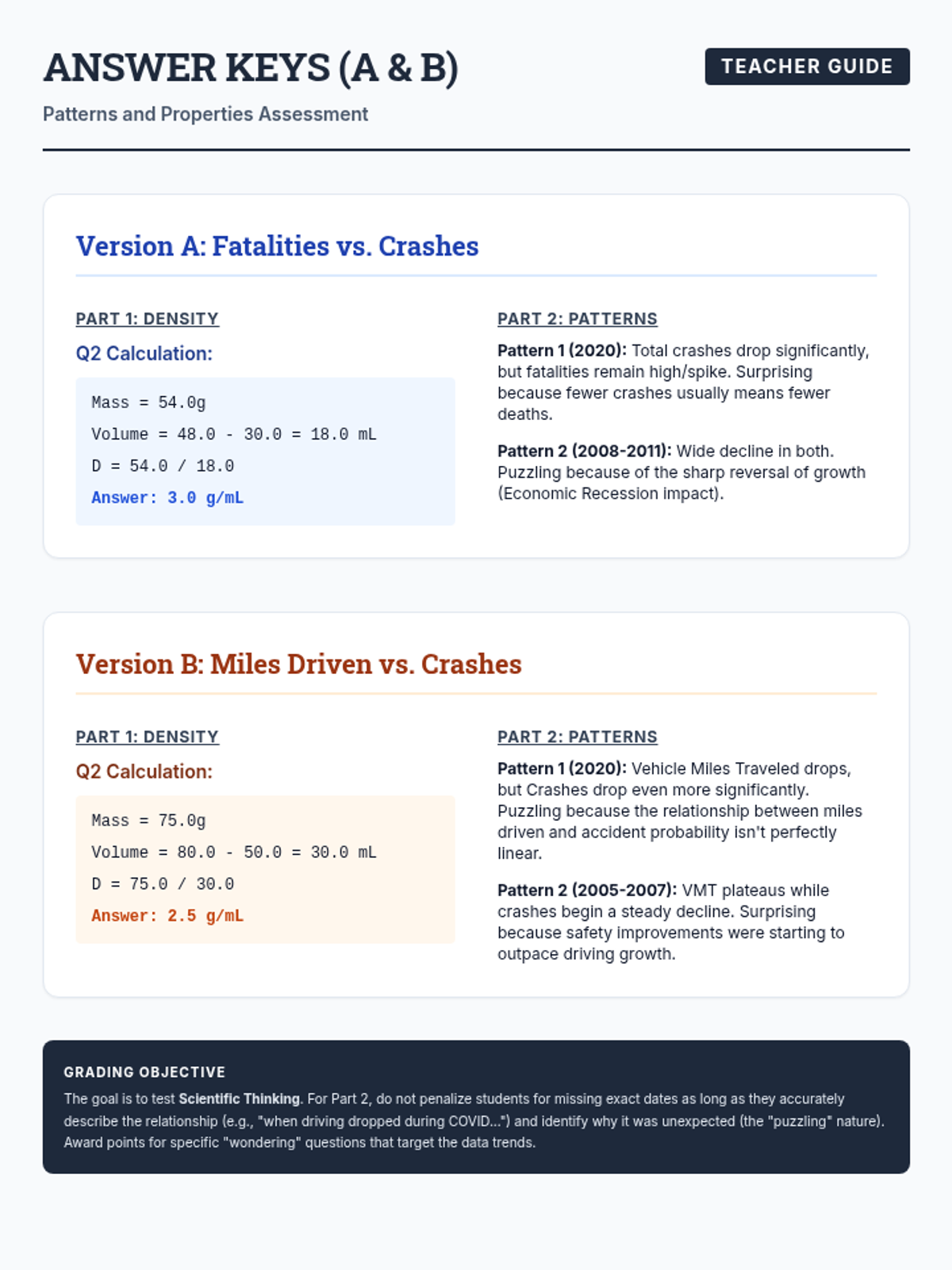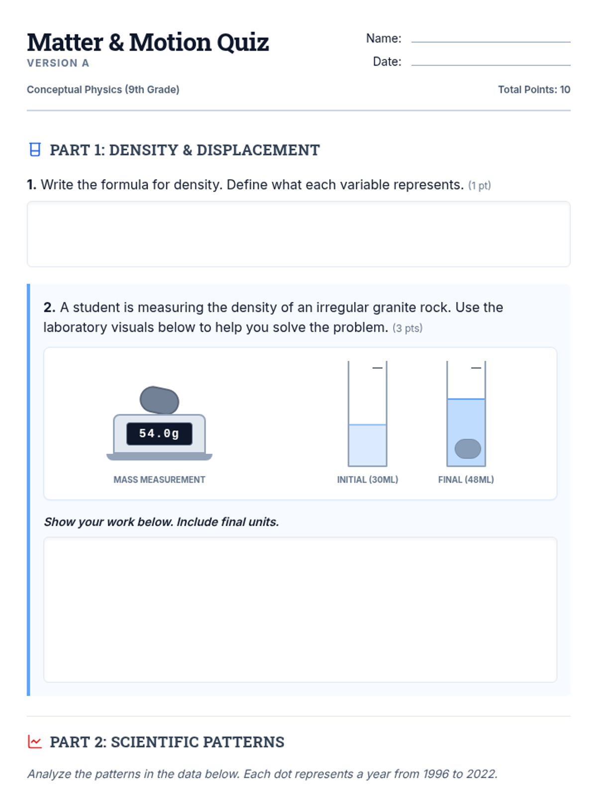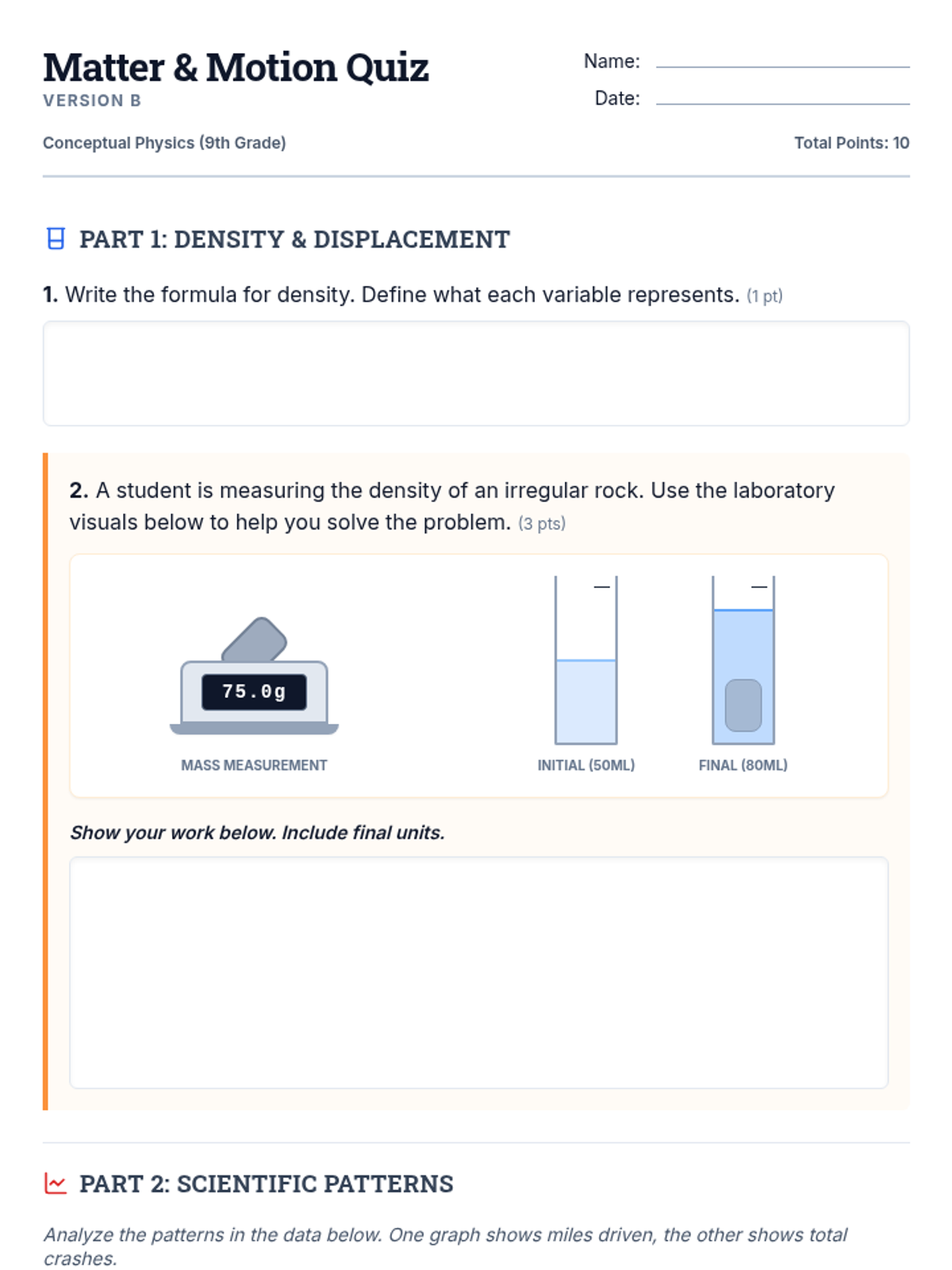 A conceptual physics assessment focusing on the density of matter through water displacement and the analysis of real-world traffic data to identify scientific patterns and anomalies.