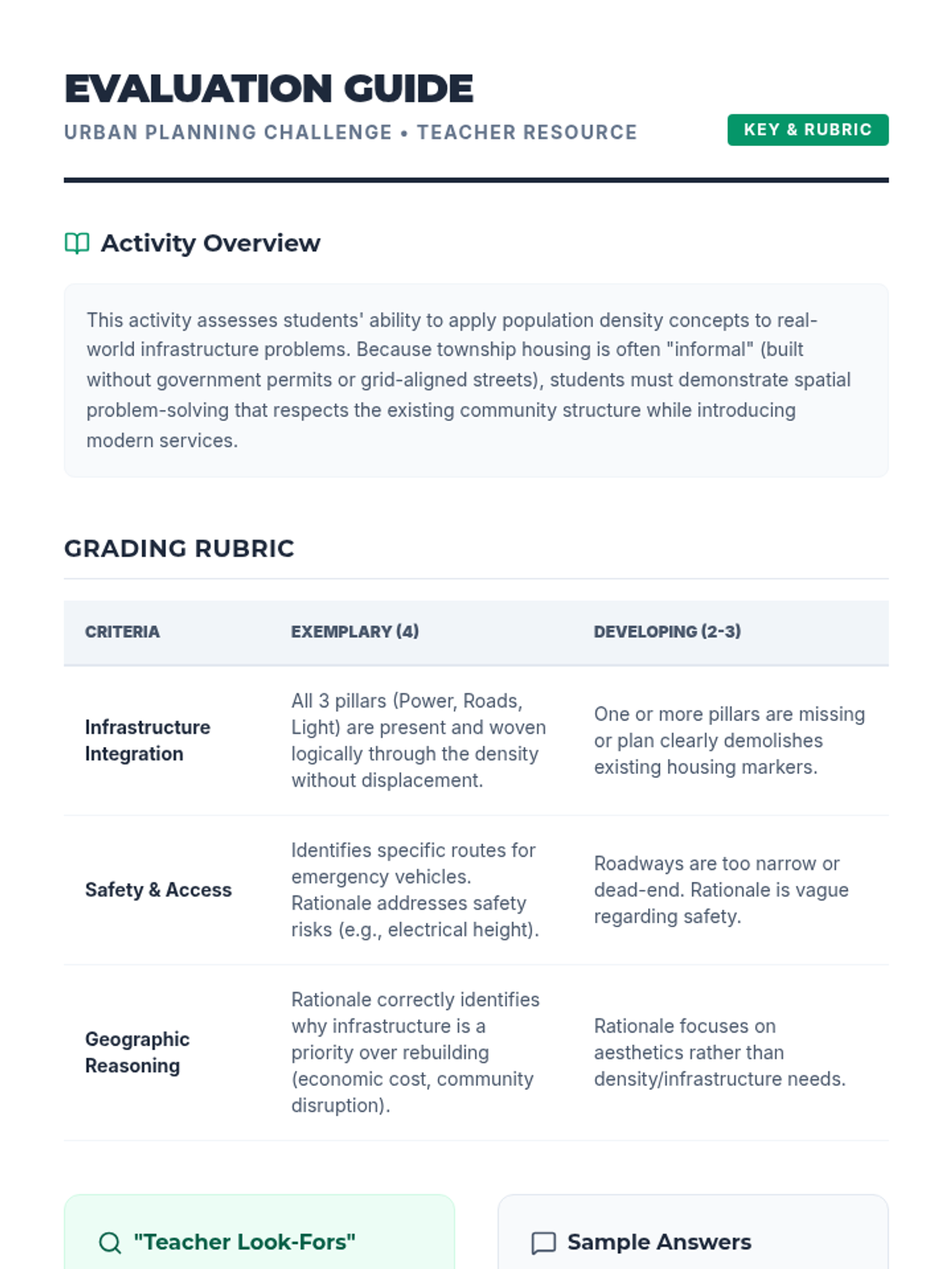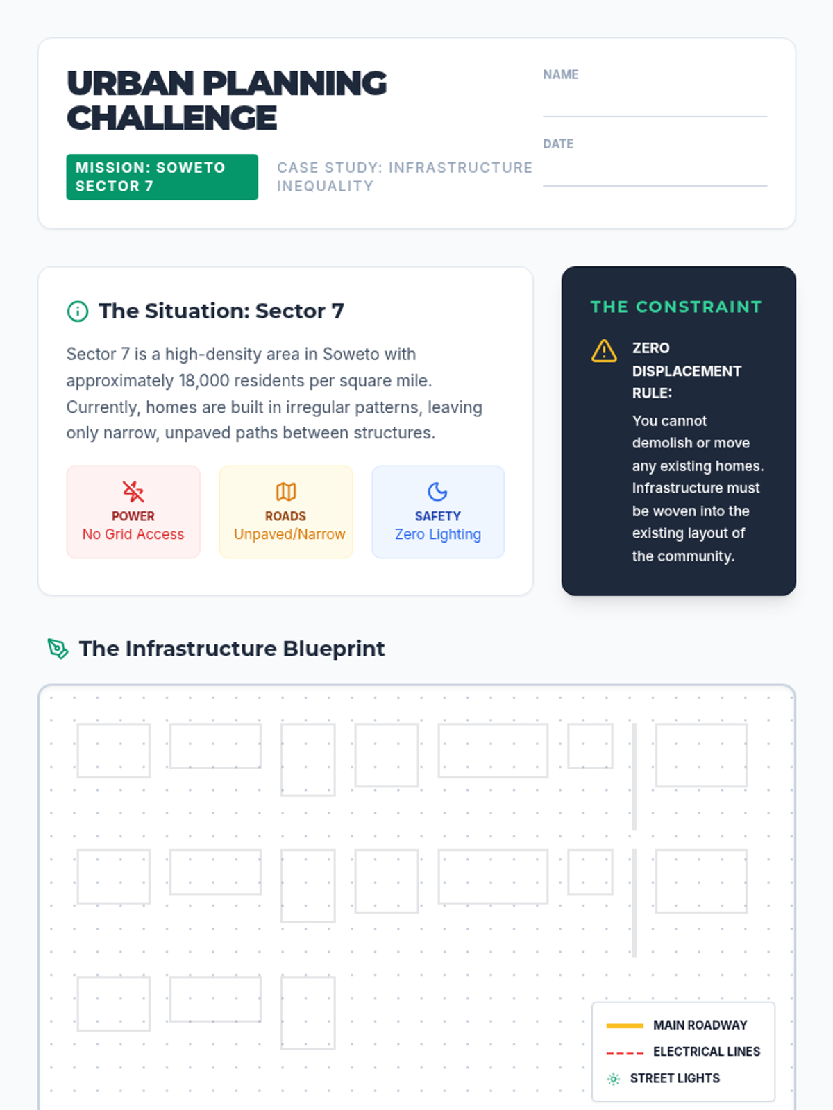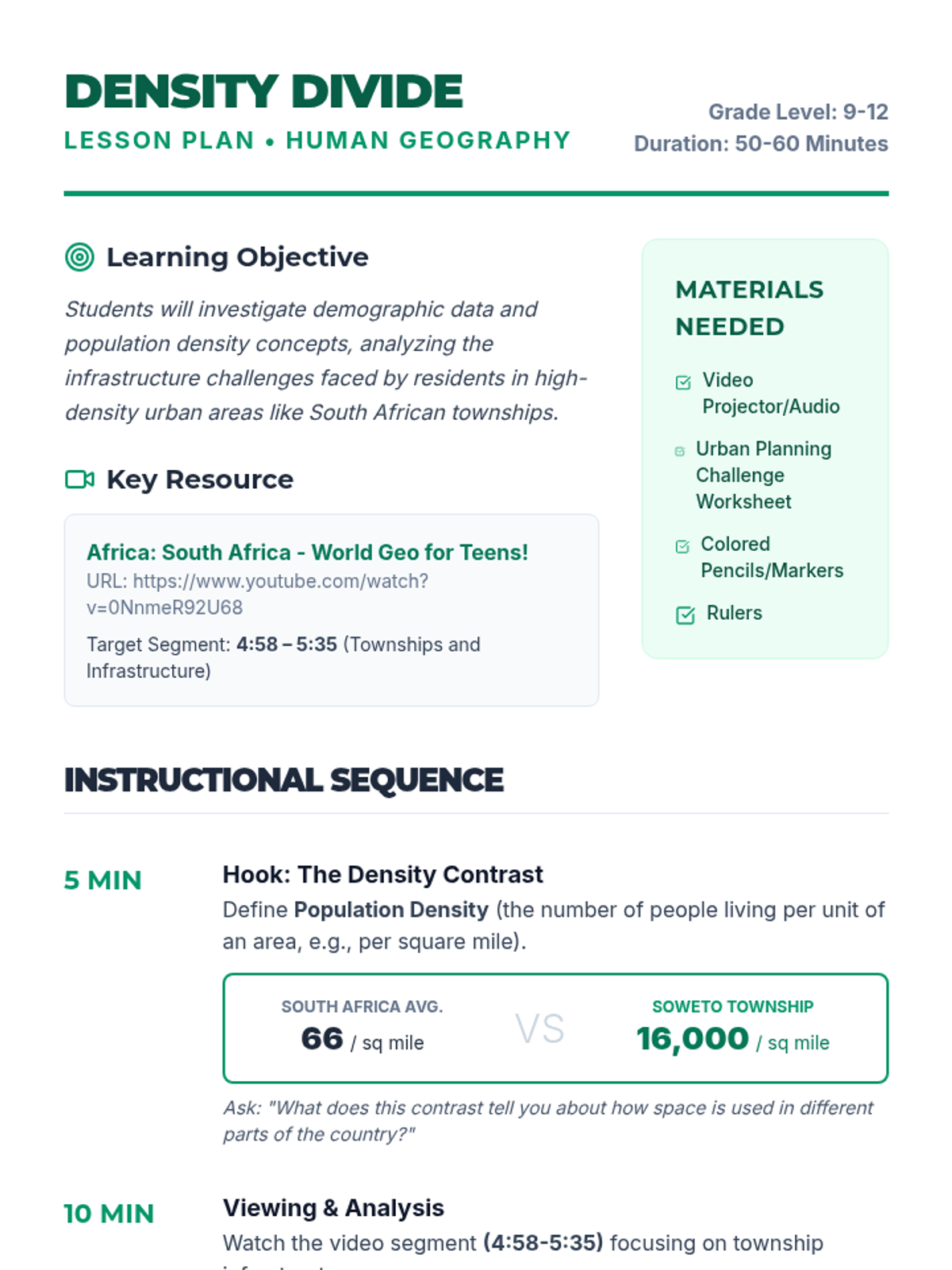 This lesson explores population density and infrastructure challenges through the lens of South African townships, culminating in an urban planning design challenge.