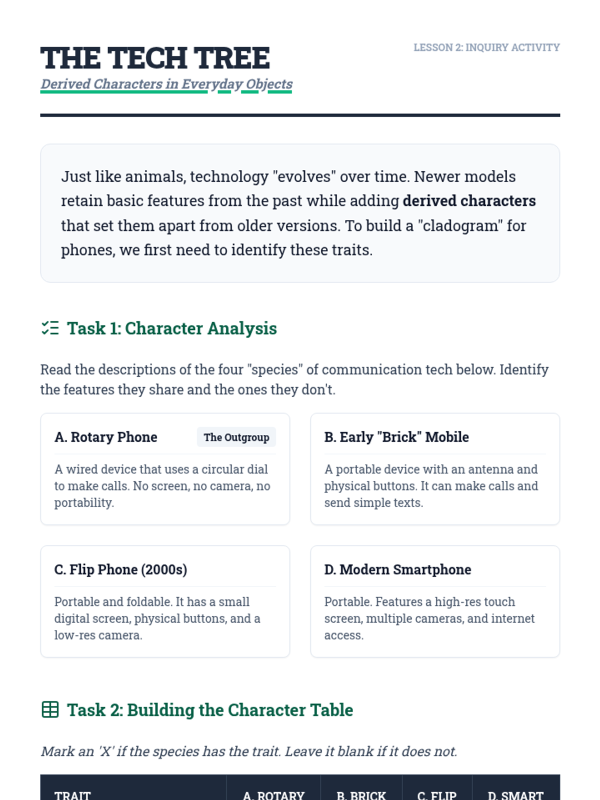 Introduction to the vocabulary of cladistics, focusing on derived characters and outgroups using everyday technology as a hook.