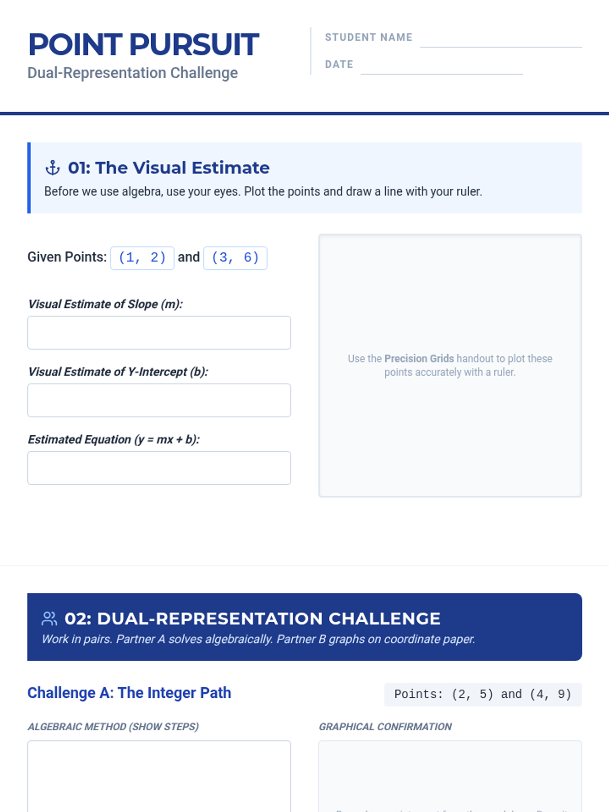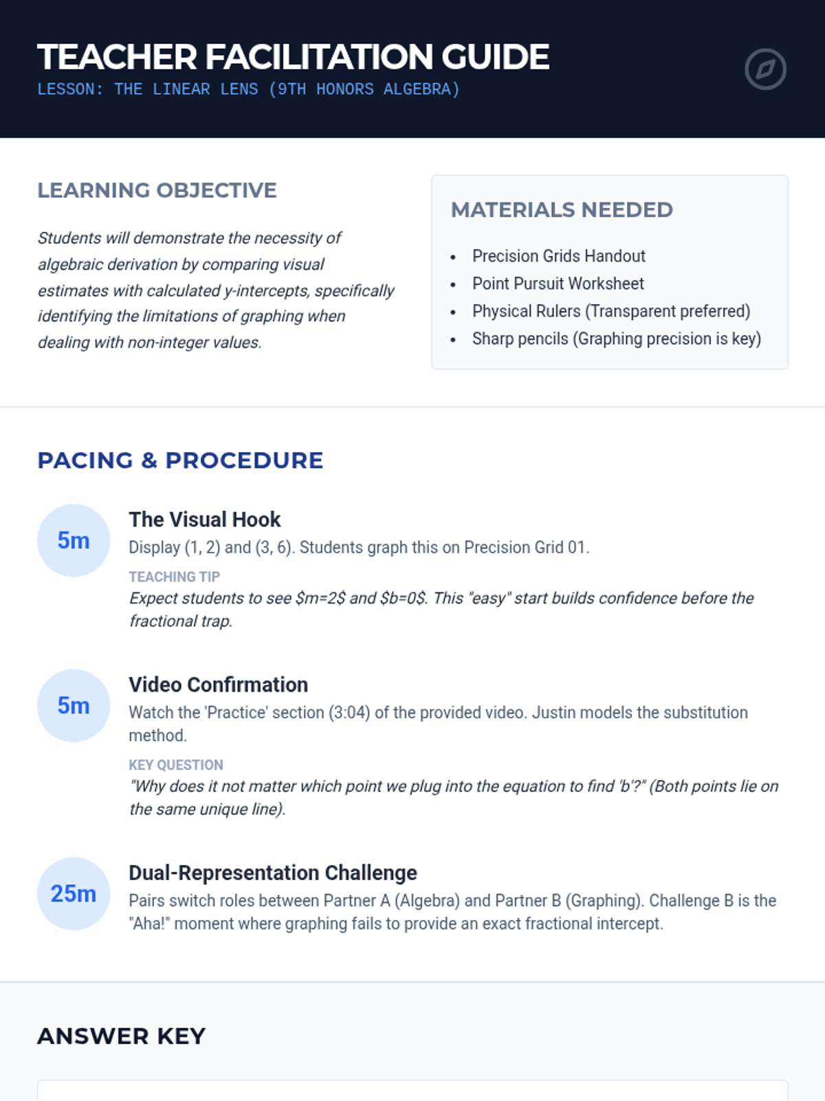 In this 9th Grade Honors Algebra lesson, students bridge the gap between visual graphing and algebraic derivation. They will discover that while graphing is intuitive, algebraic precision is necessary for complex linear equations with fractional intercepts.
