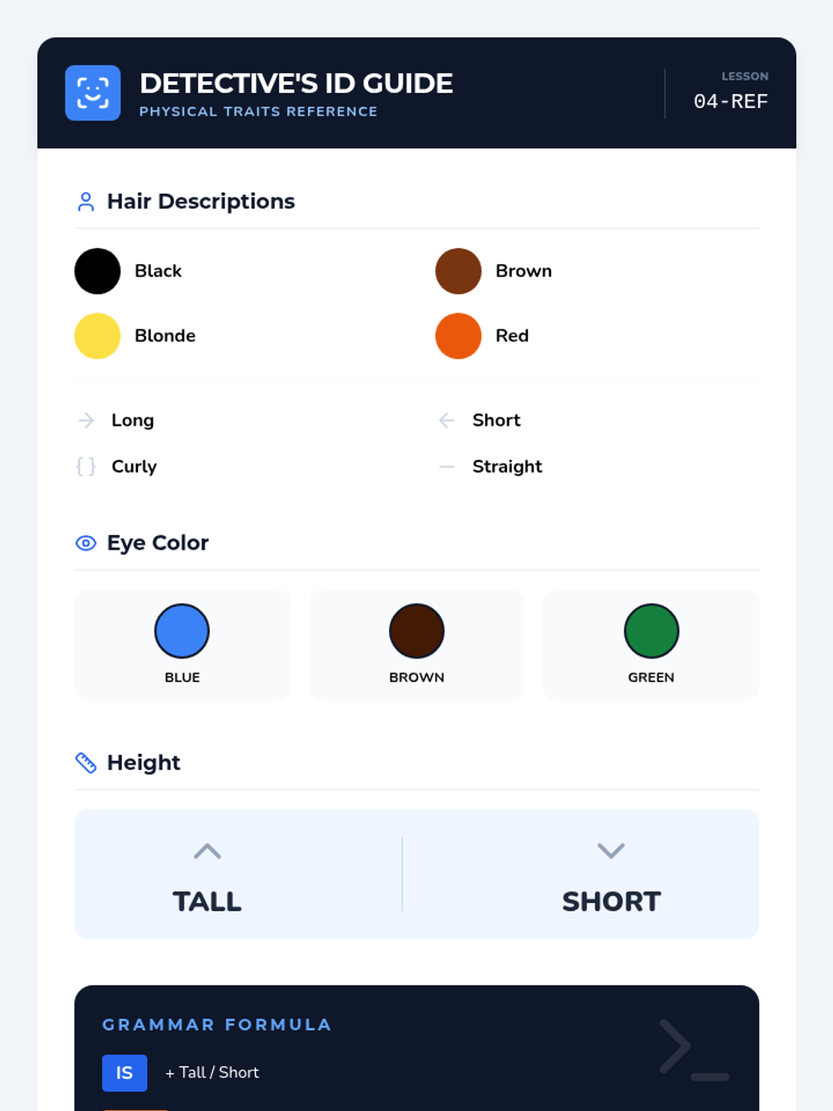 Extends descriptive skills to people, covering hair color, eye color, and height through 'Wanted' poster projects.