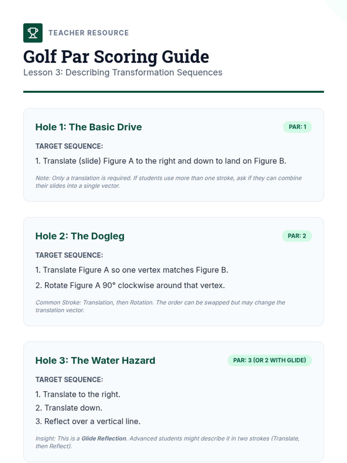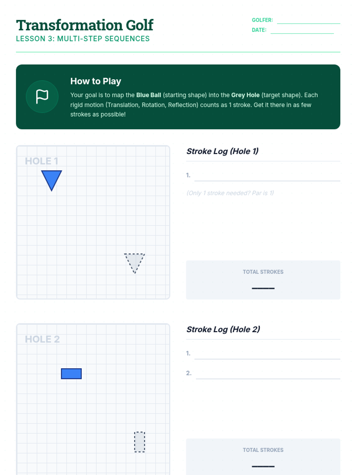 Students describe multi-step sequences of transformations to map one figure onto another in a 'Transformation Golf' challenge.