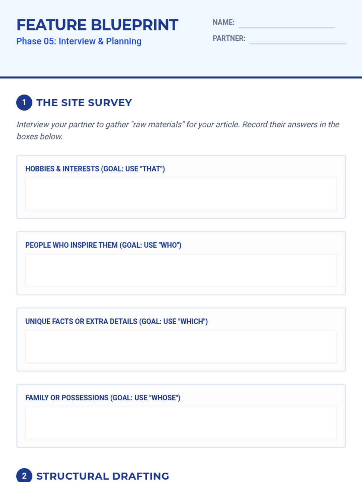 The capstone project where students write a descriptive feature article using their new relative pronoun skills.