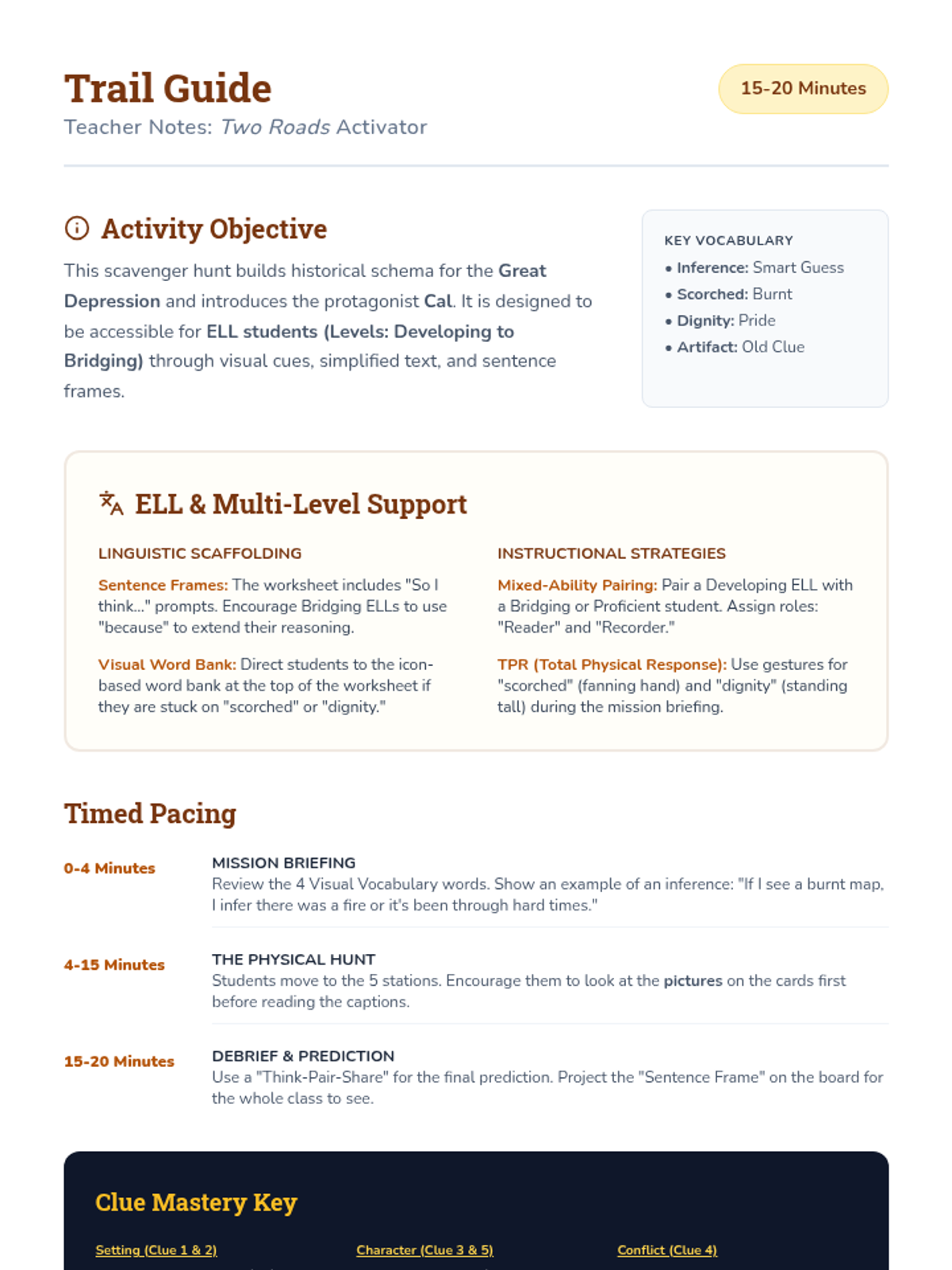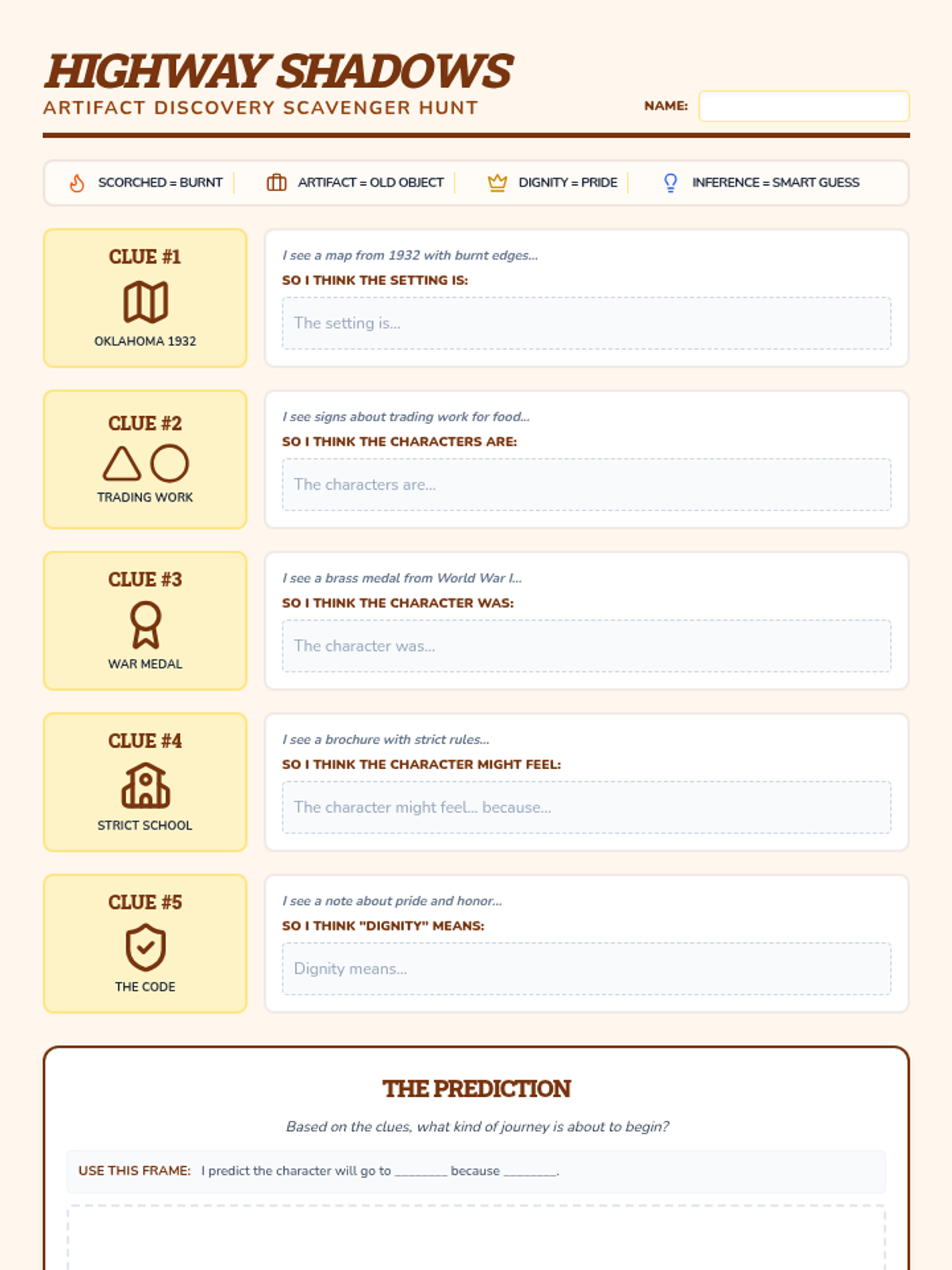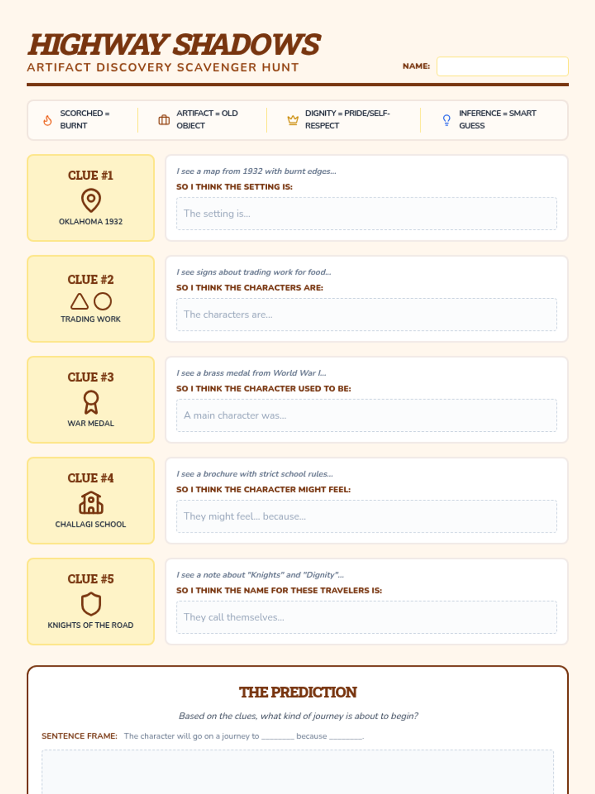 A pre-reading activator for 'Two Roads' by Gary D. Schmidt, focusing on building historical context and making initial inferences about characters and setting through a clue-based scavenger hunt.