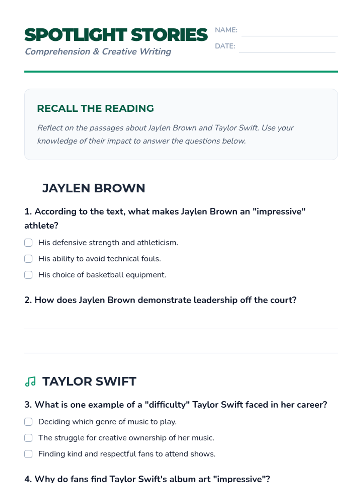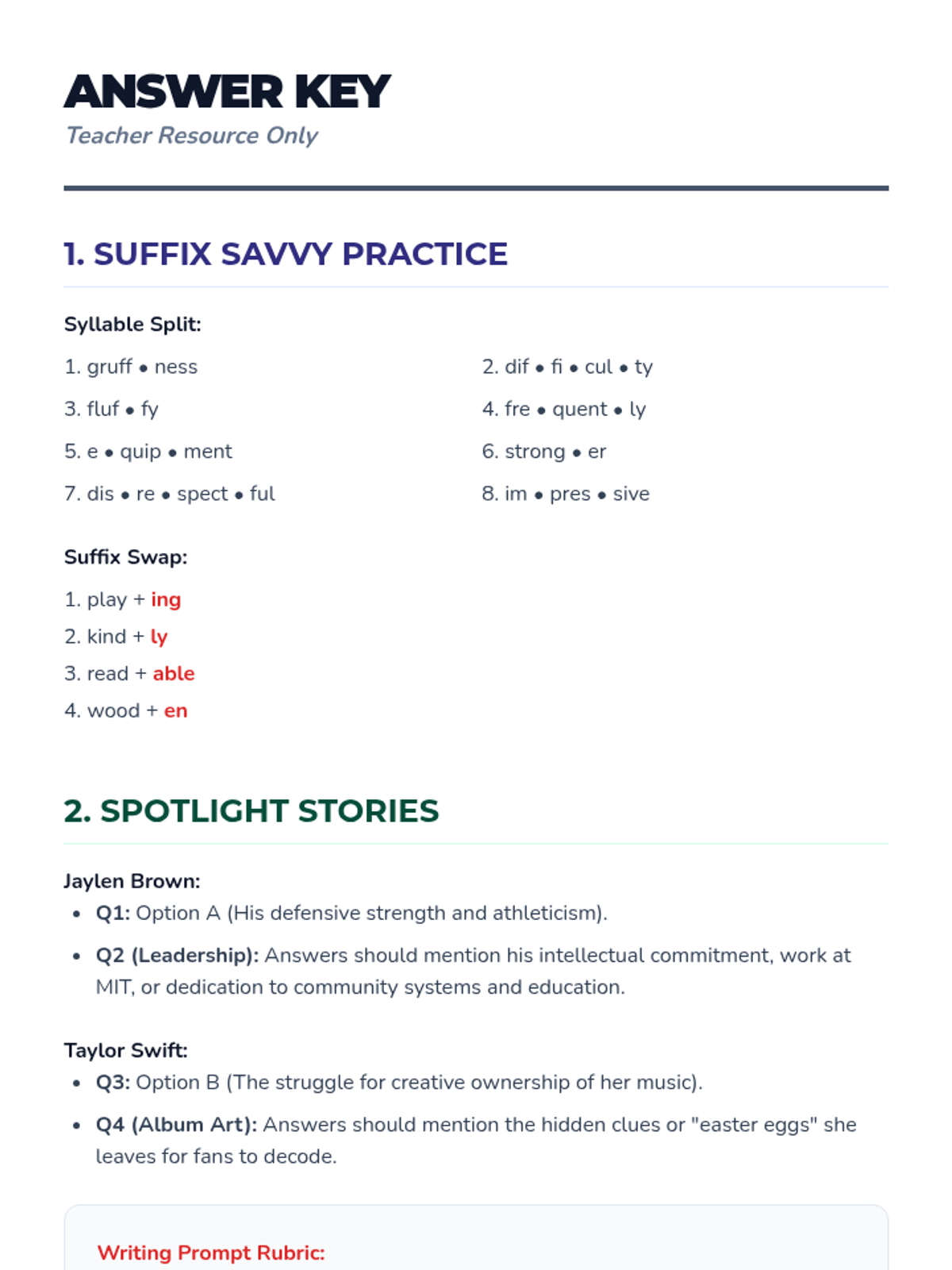 A comprehensive lesson focusing on common suffixes, their meanings, and application through specific vocabulary and descriptive reading passages about contemporary figures.