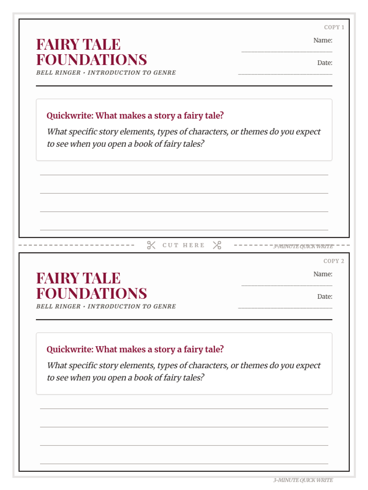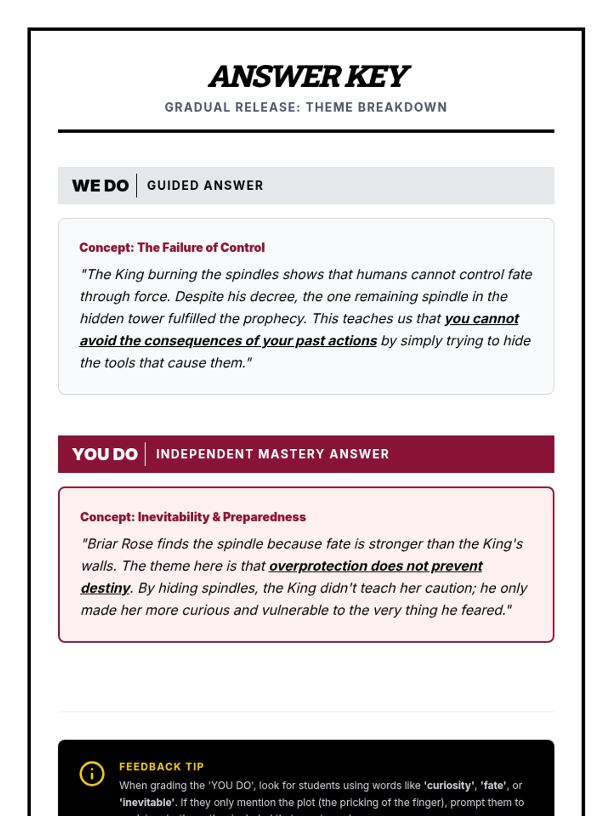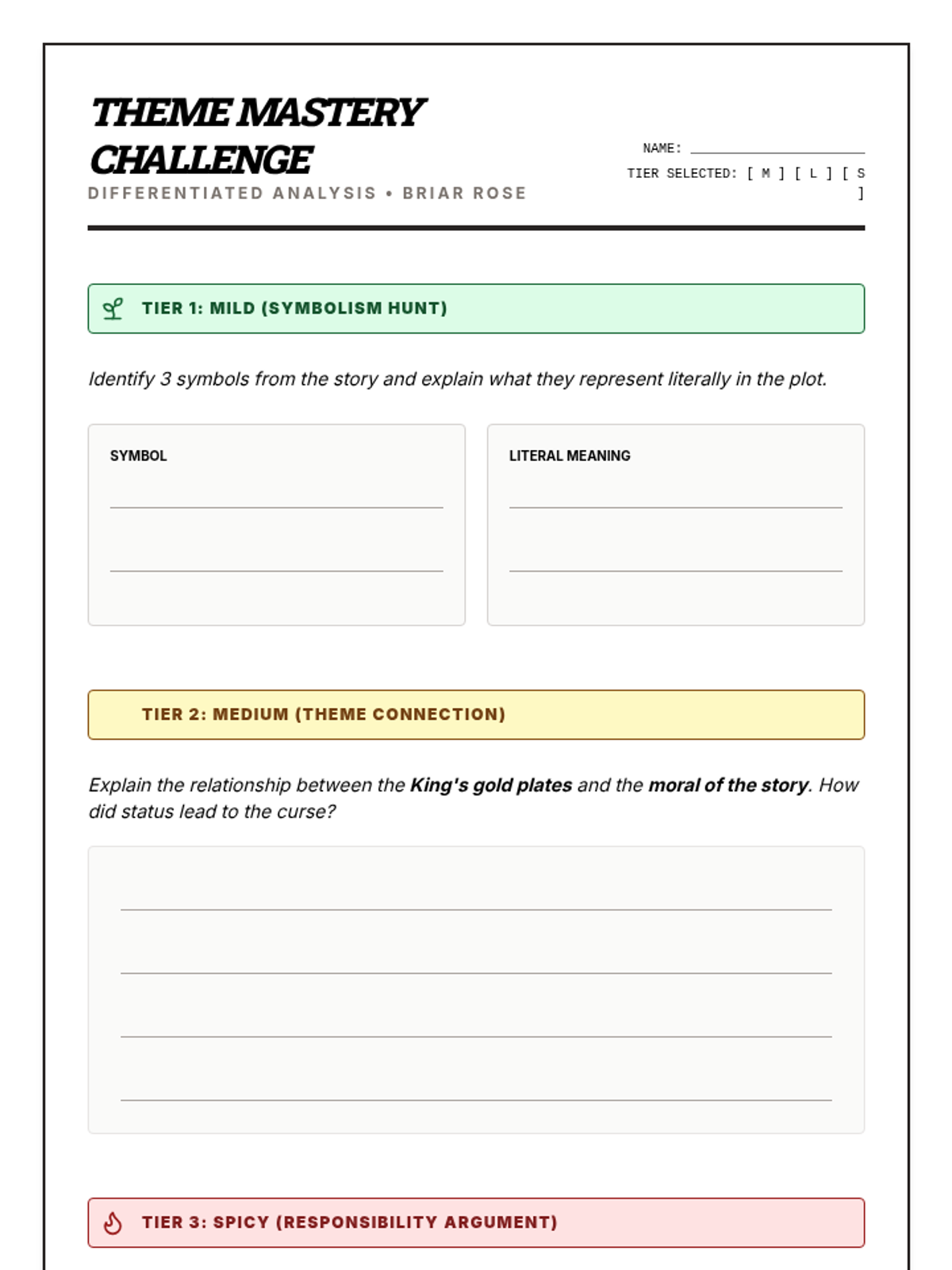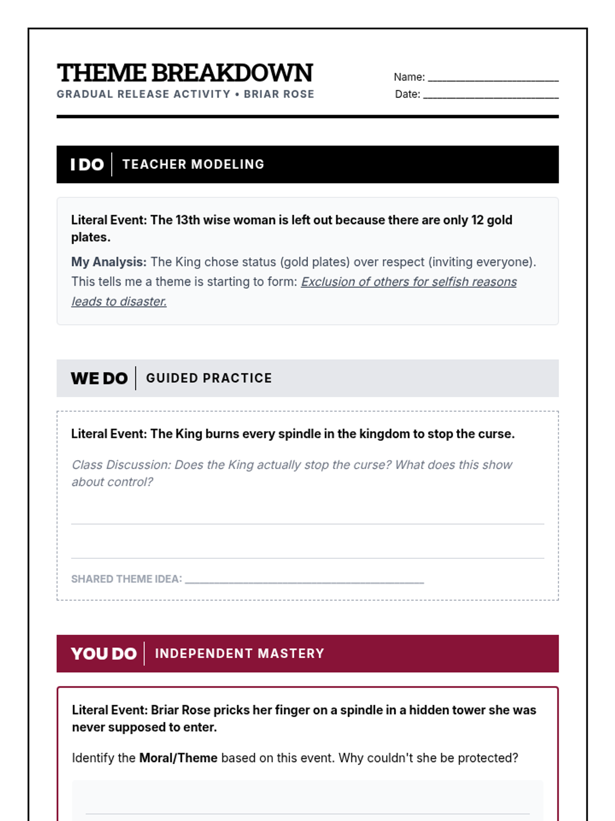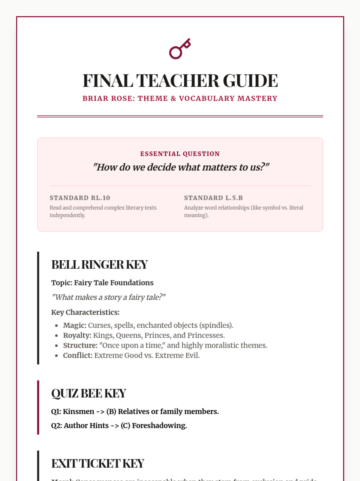A quick exploration of theme and moral within the classic Brothers Grimm tale 'Briar Rose', featuring a focused bell ringer and exit ticket.