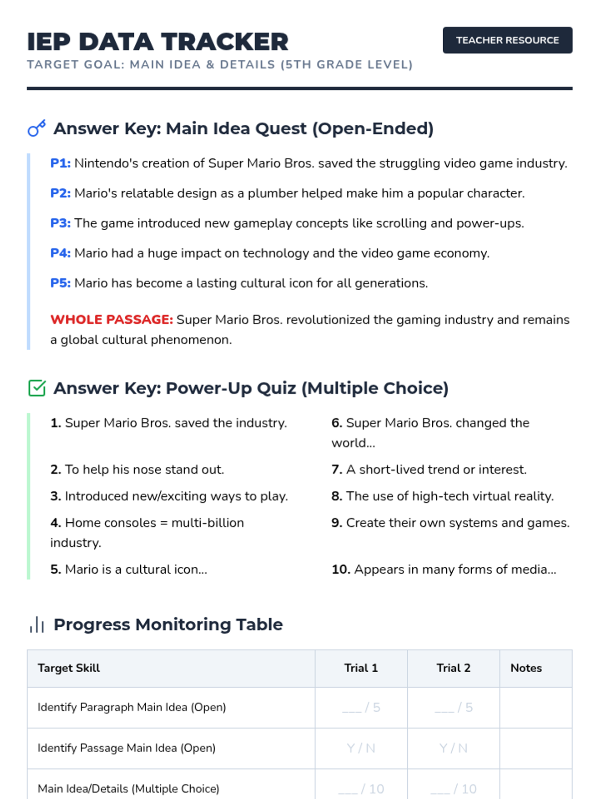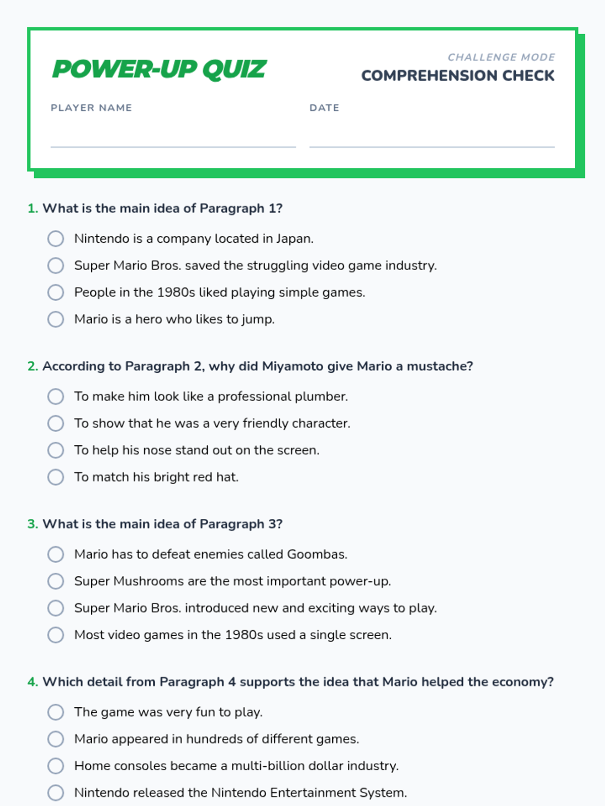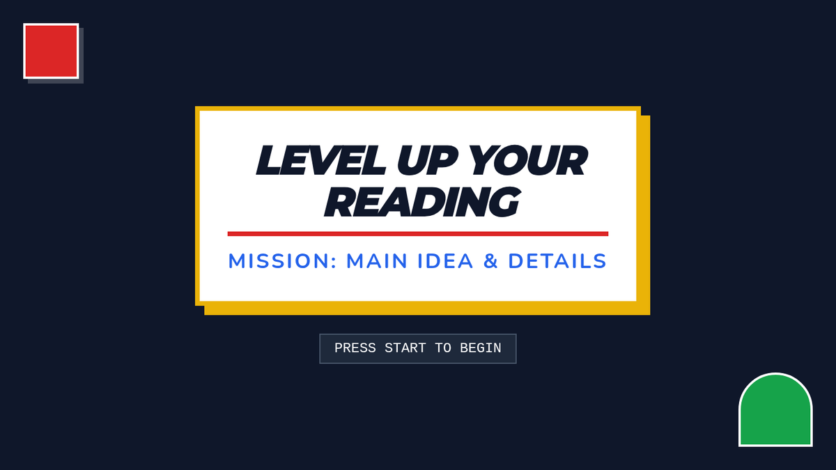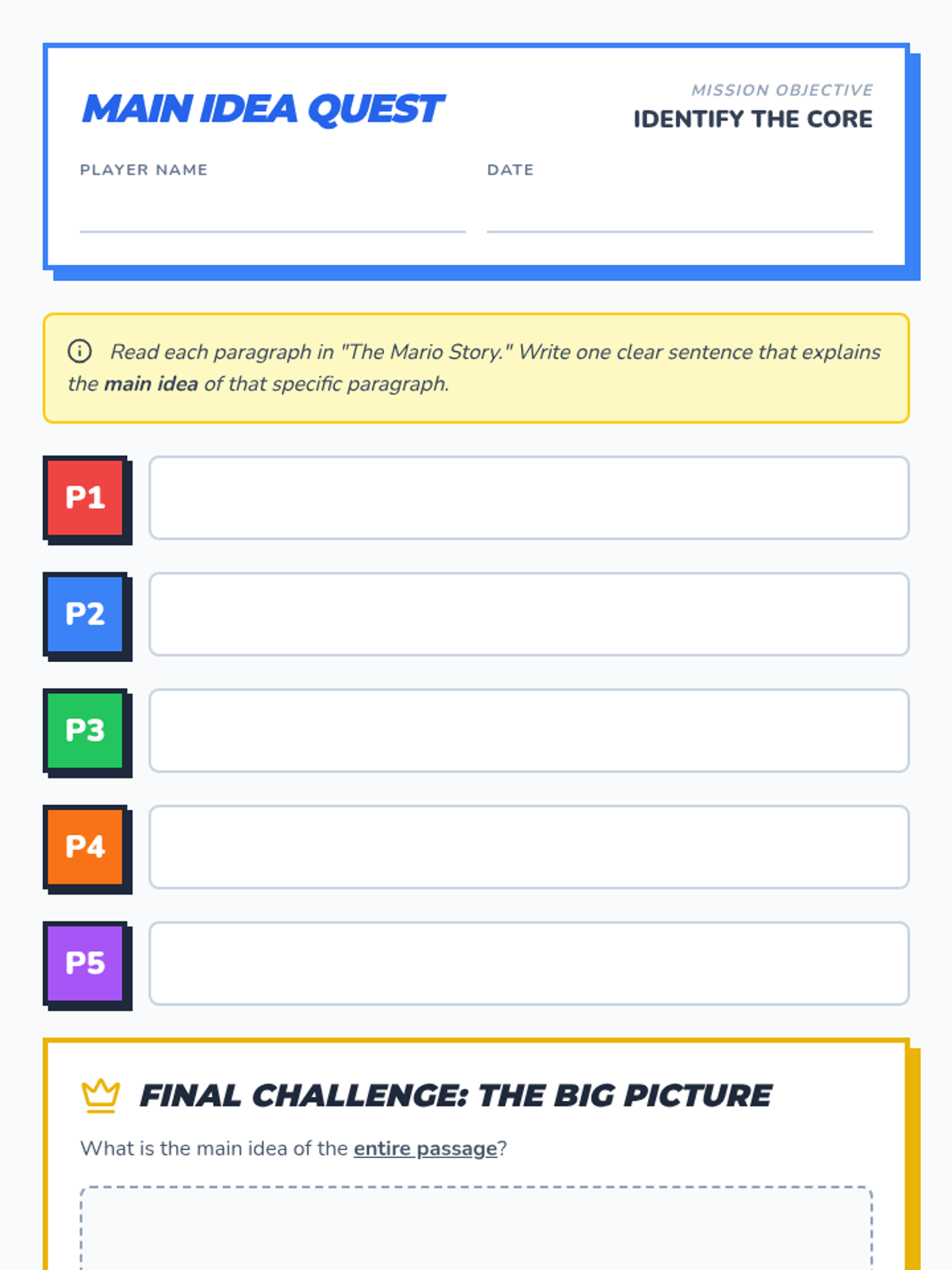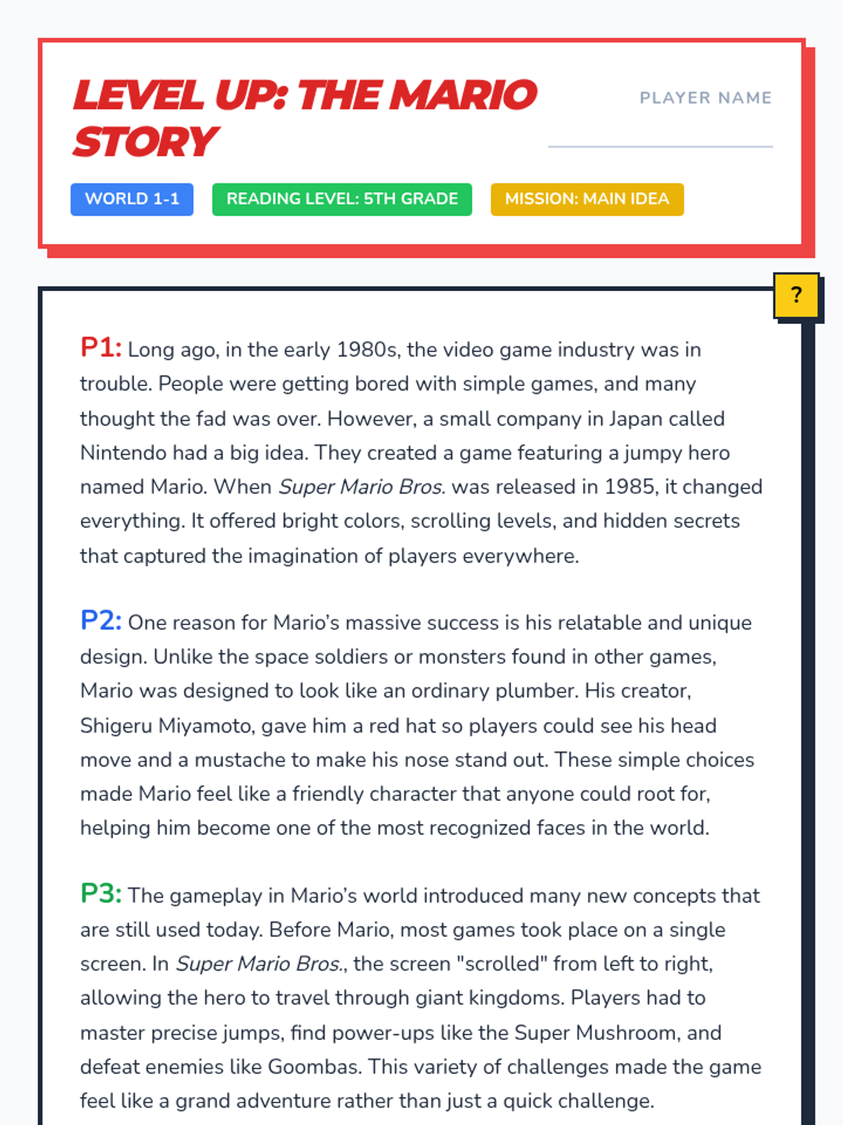 A 5th-grade reading comprehension lesson focused on identifying the main idea of paragraphs and a whole passage using the history and impact of Super Mario Bros.