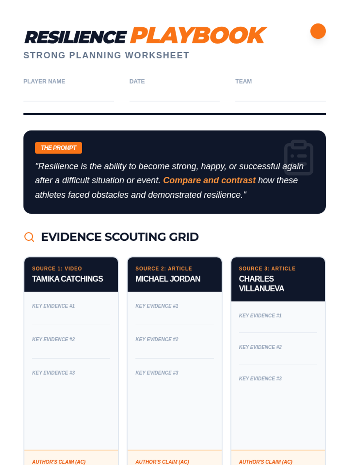 This lesson guides students through the process of analyzing three distinct sources—a video and two articles—to plan a 4-paragraph research essay on the theme of resilience. Students will learn to identify key evidence, craft author's claims, and strategically group sources for effective comparison and contrast.