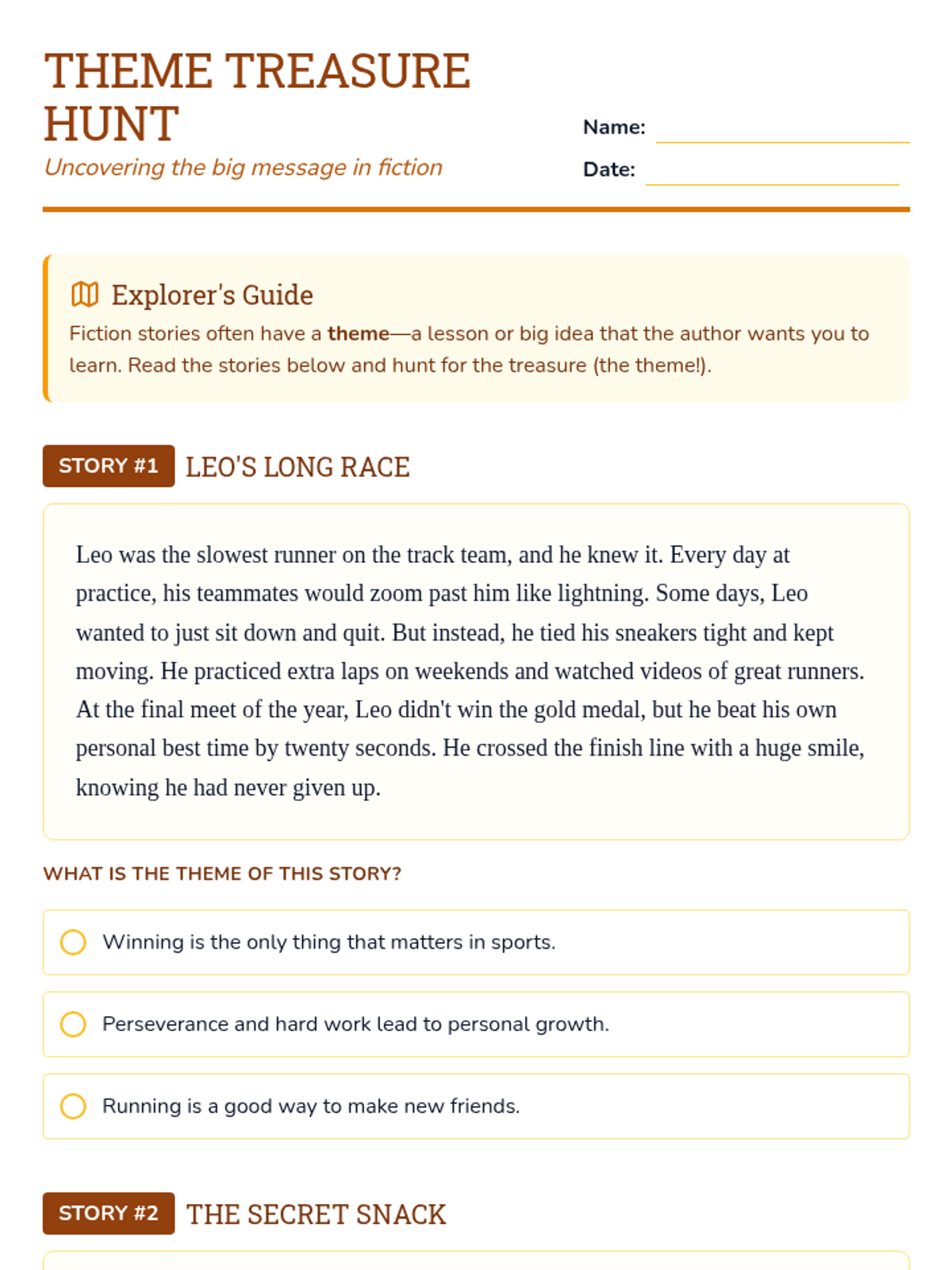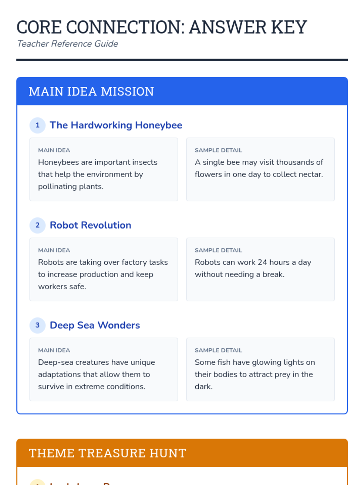 A lesson focused on distinguishing between main ideas in informational paragraphs and central themes in short fictional stories. Students will practice identifying key details and synthesizing them into a core message.