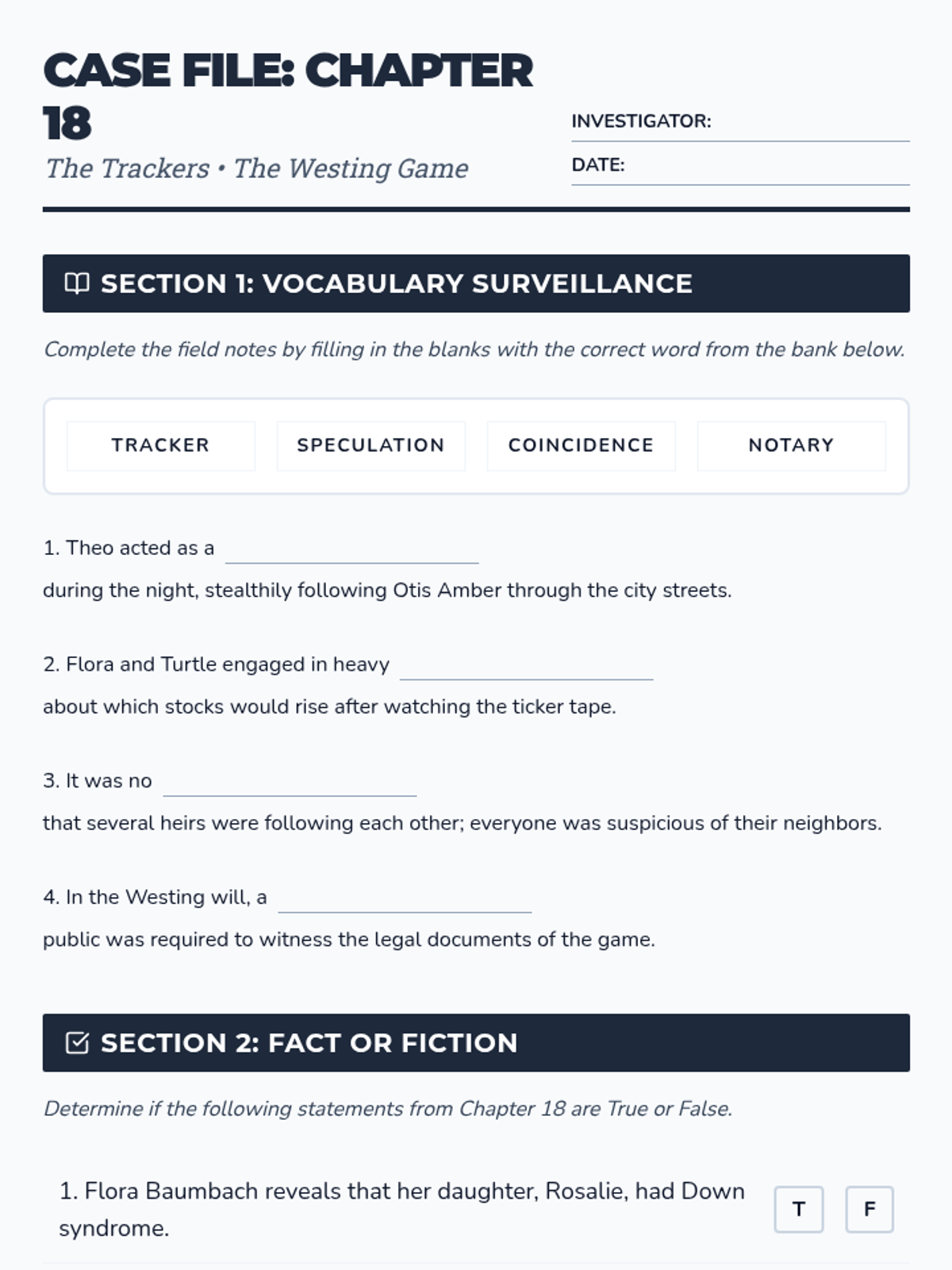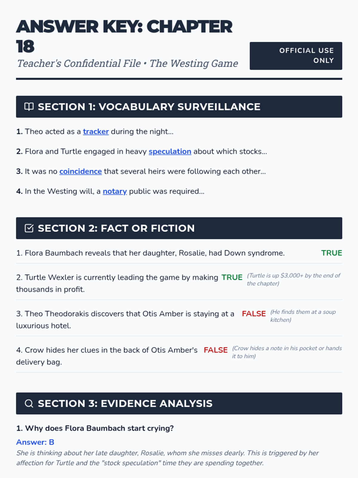 A lesson focusing on Chapter 18 of 'The Westing Game', exploring the themes of surveillance, hidden identities, and the burgeoning relationship between Turtle Wexler and Flora Baumbach.