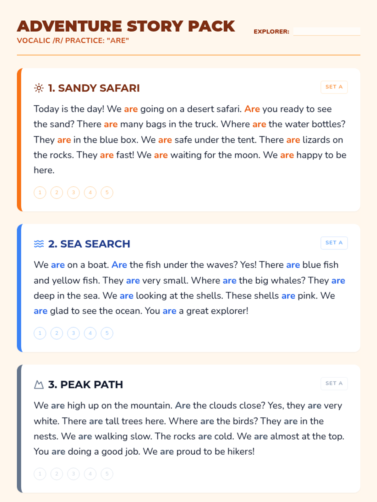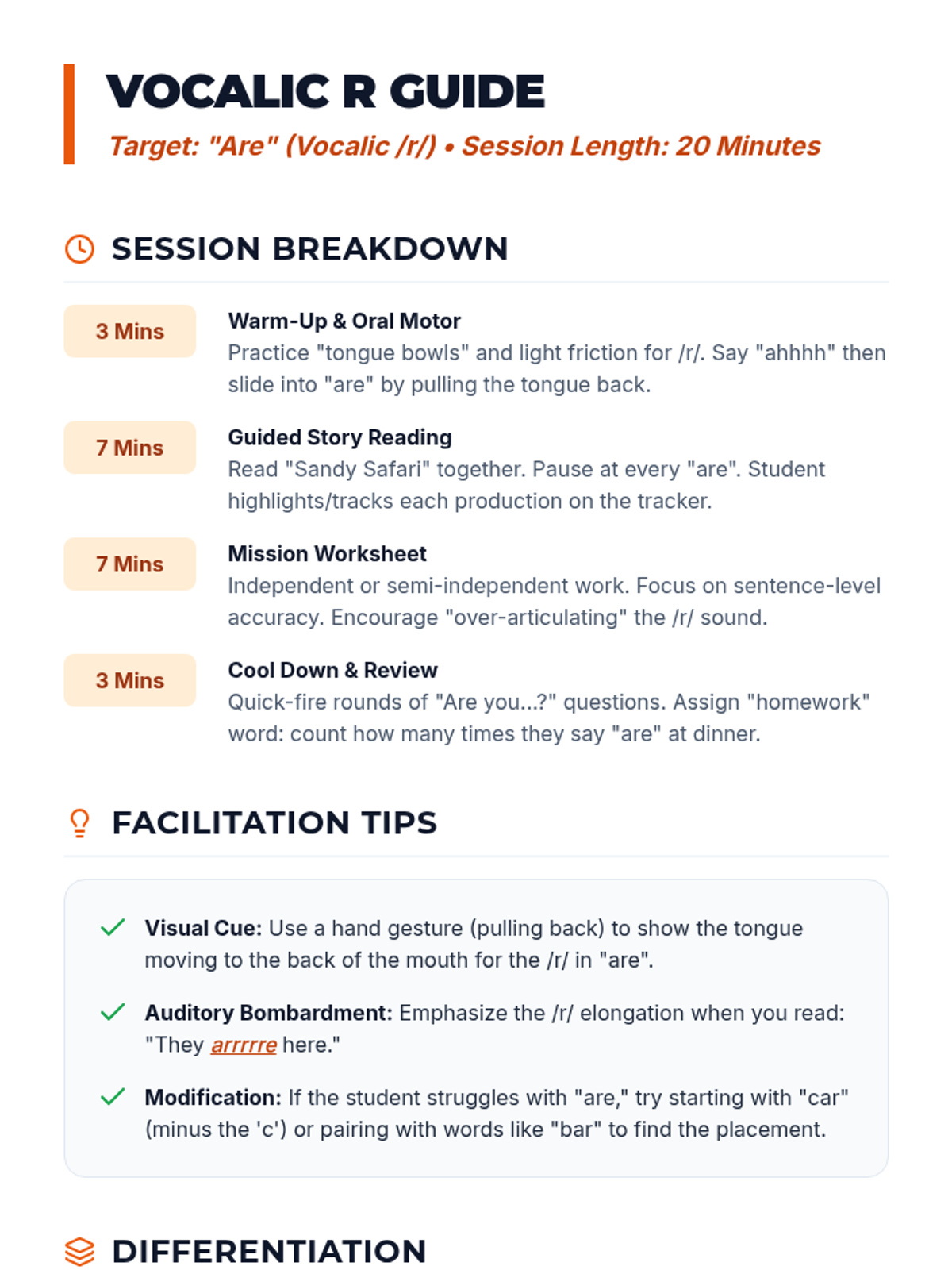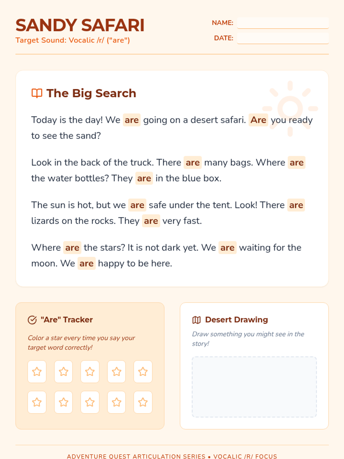 A 20-minute articulation session focused on the vocalic /r/ sound through the high-frequency word 'are', designed for 4th-grade students reading at a 2nd-3rd grade level.