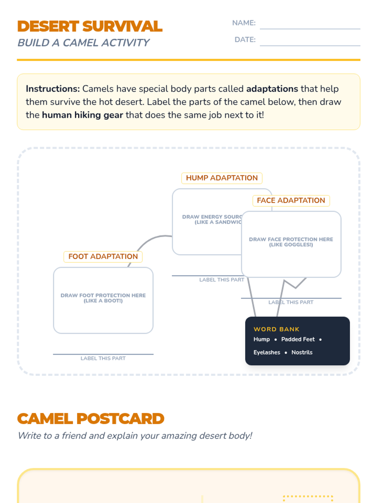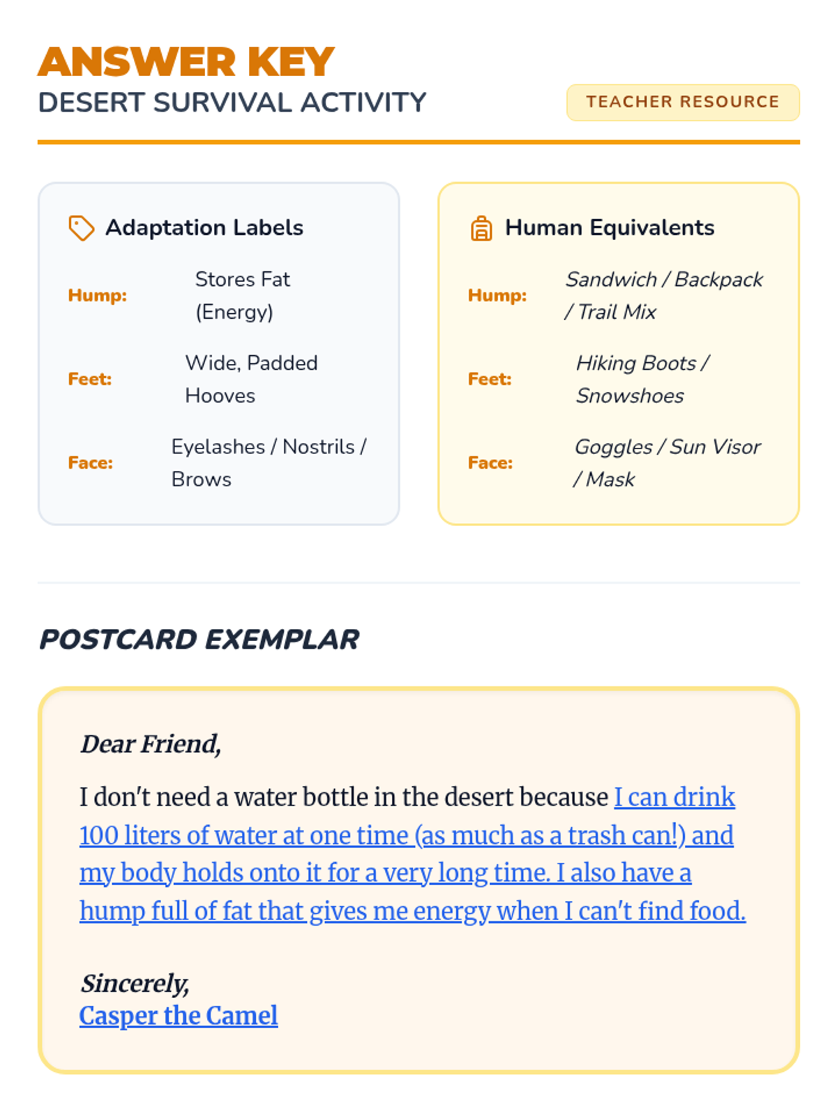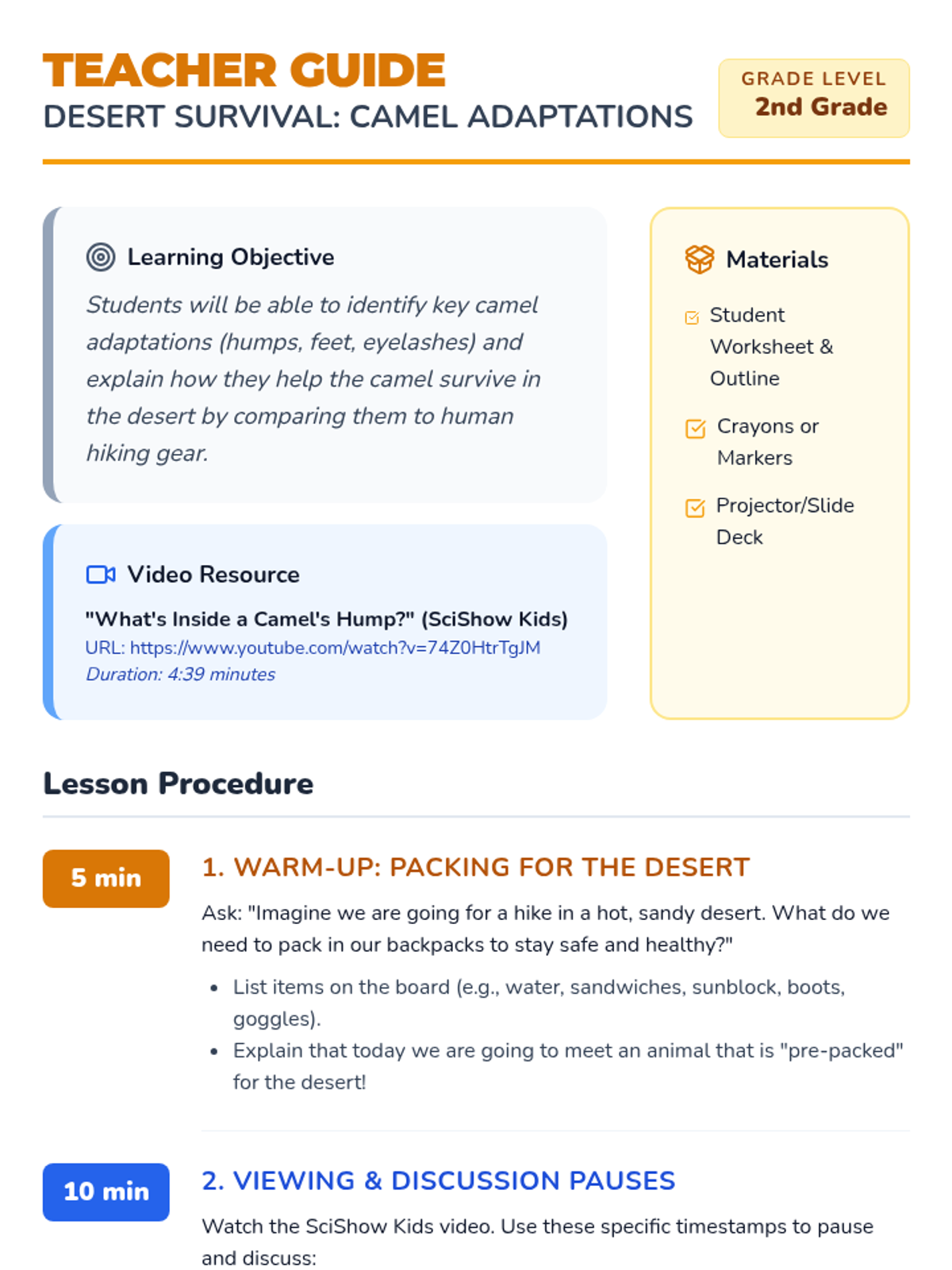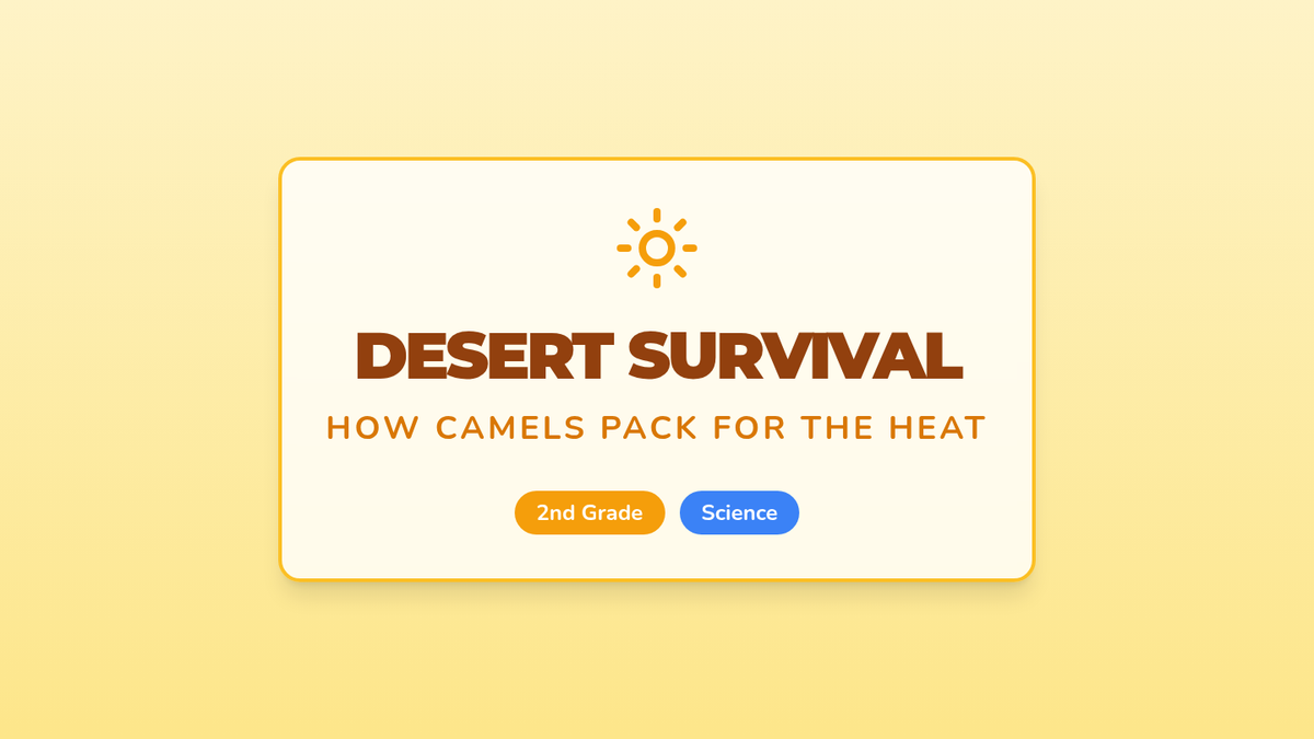 A 2nd-grade science lesson exploring how camels are physically adapted to survive in harsh desert environments, using analogies between camel body parts and human hiking gear.