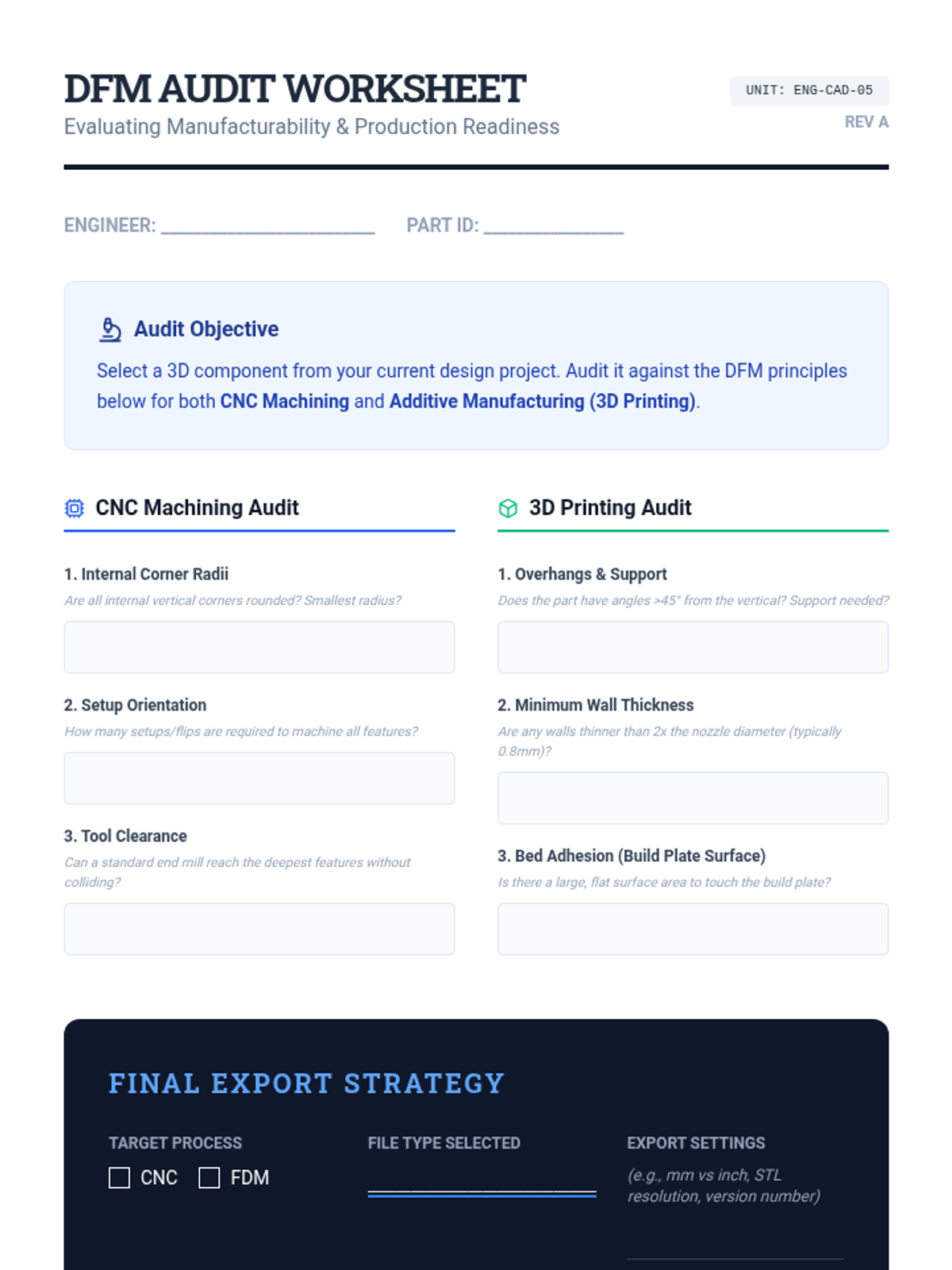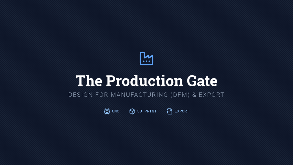 Students audit their designs for manufacturability, learning to optimize models for CNC machining and 3D printing while selecting appropriate export formats for various manufacturing workflows.