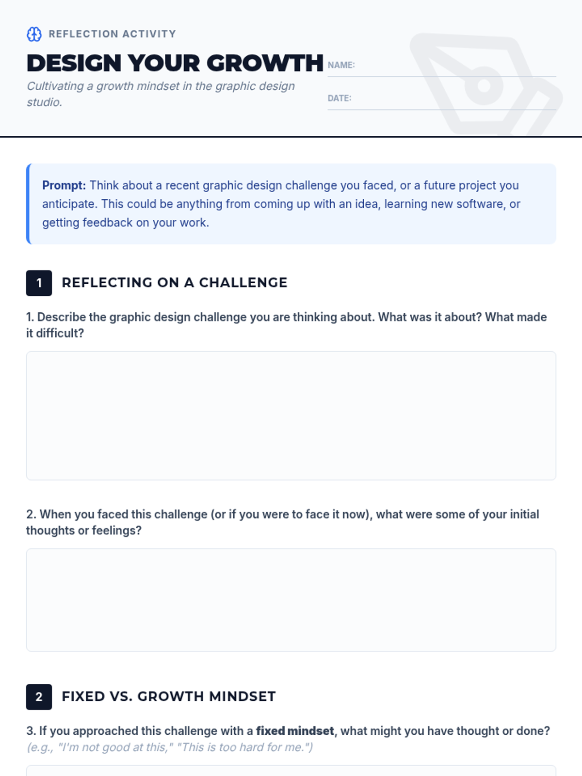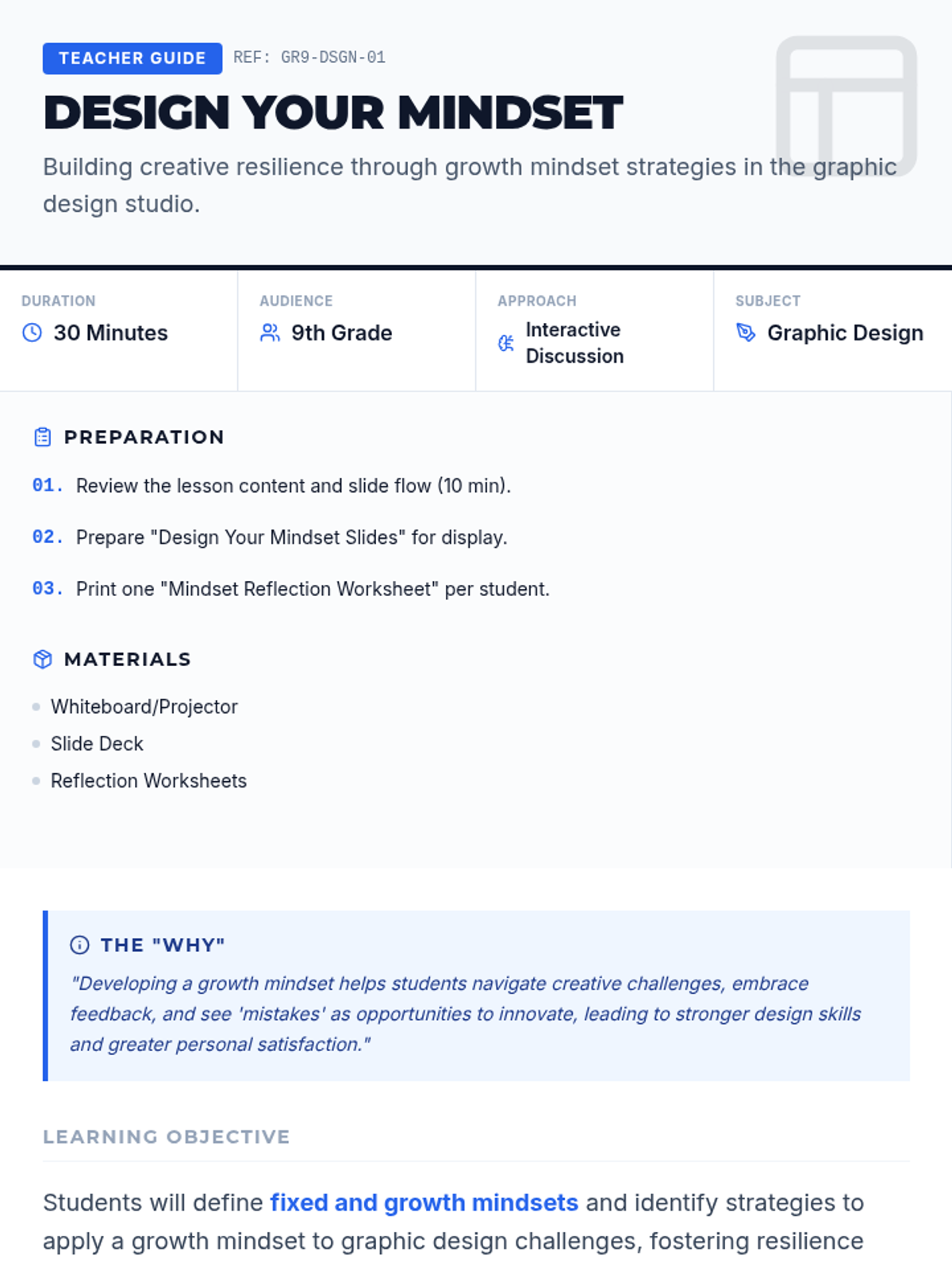 A 30-minute lesson for 9th-grade students exploring growth mindset within the context of graphic design, helping them build resilience and creative confidence.