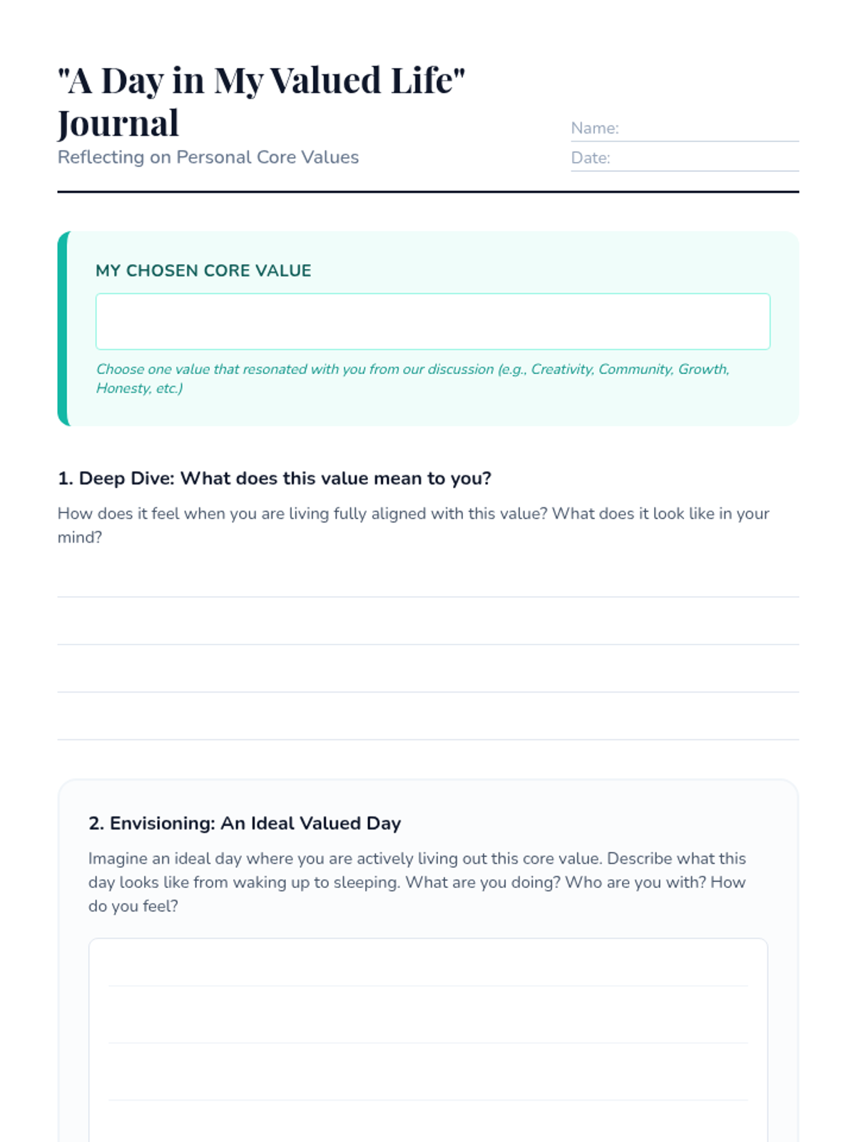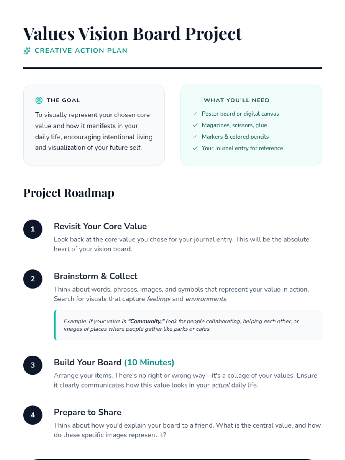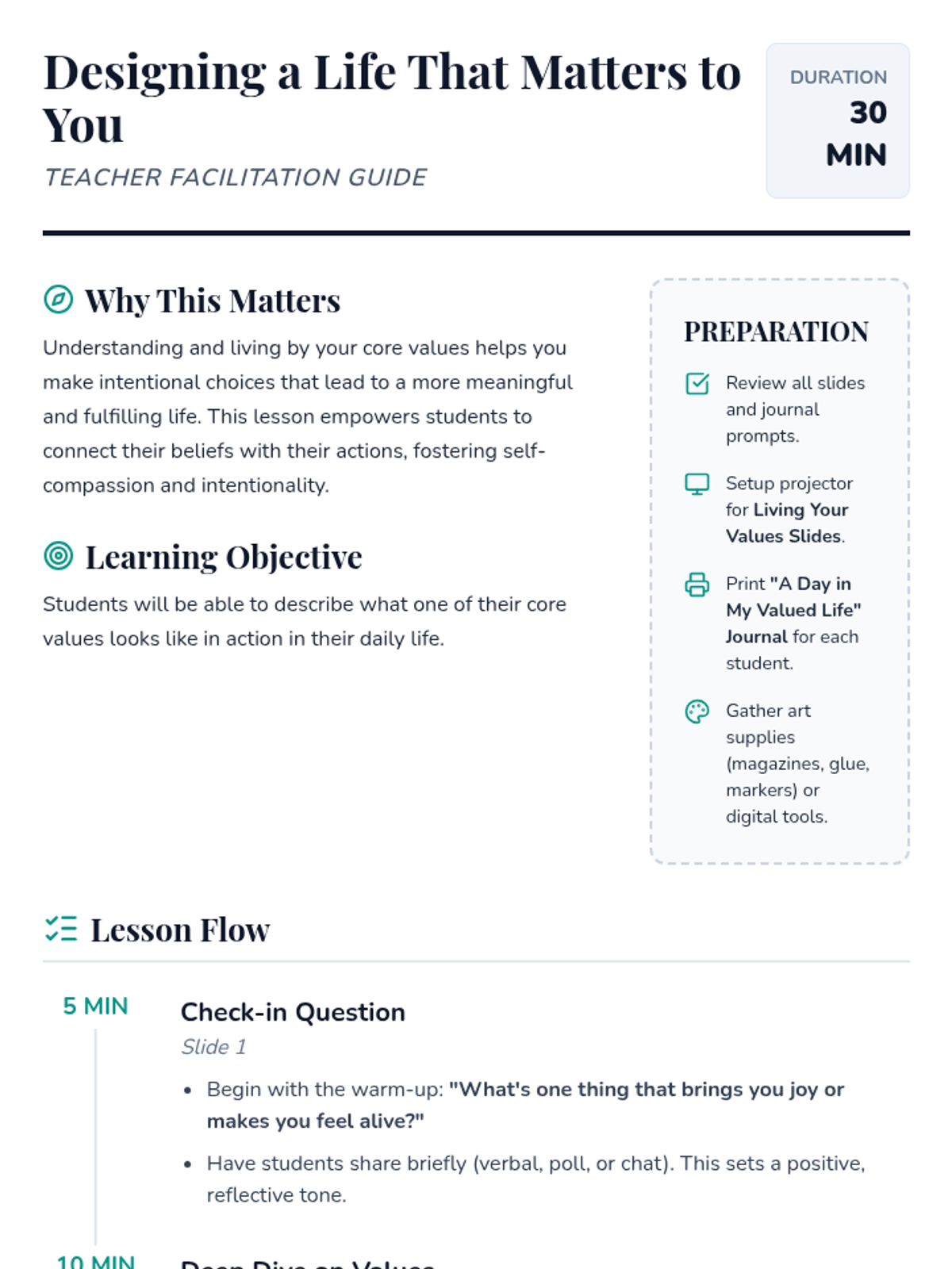 A 30-minute lesson for 9th-11th grade students to identify core values and envision how to integrate them into daily life through journaling and a mini-vision board project.