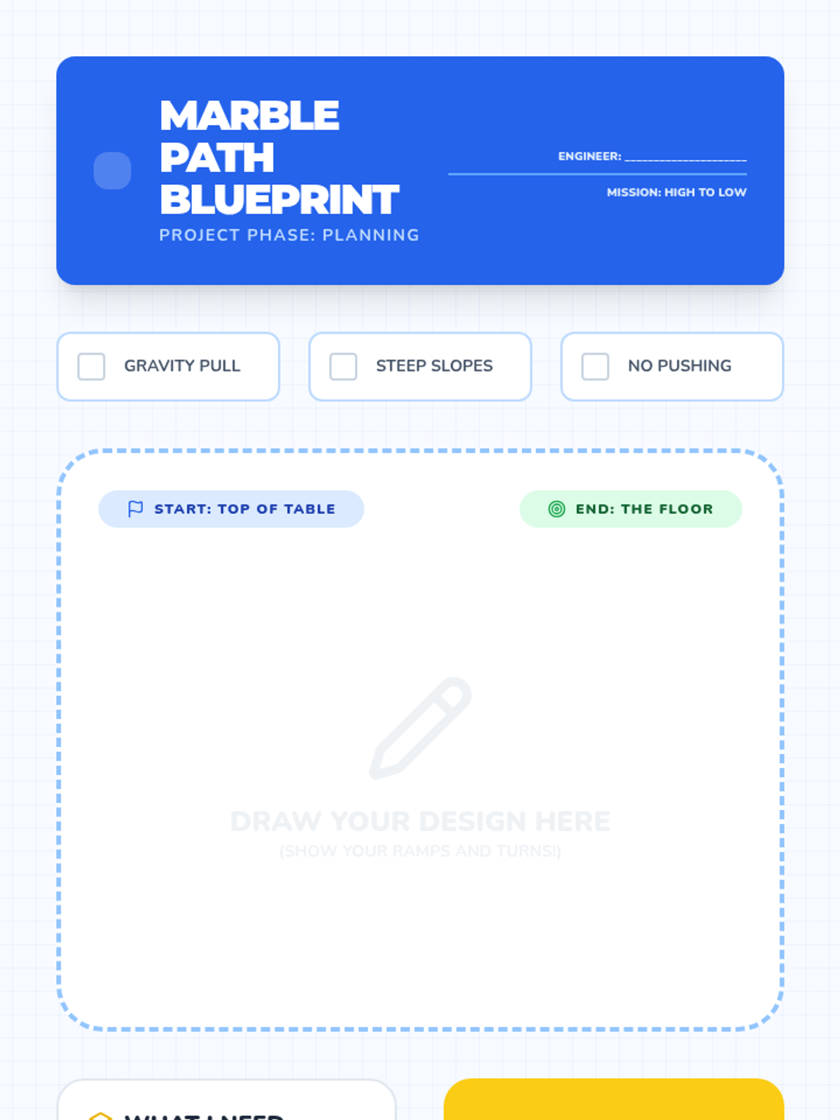 Students plan and sketch their own marble run design using the concepts of gravity and slope.