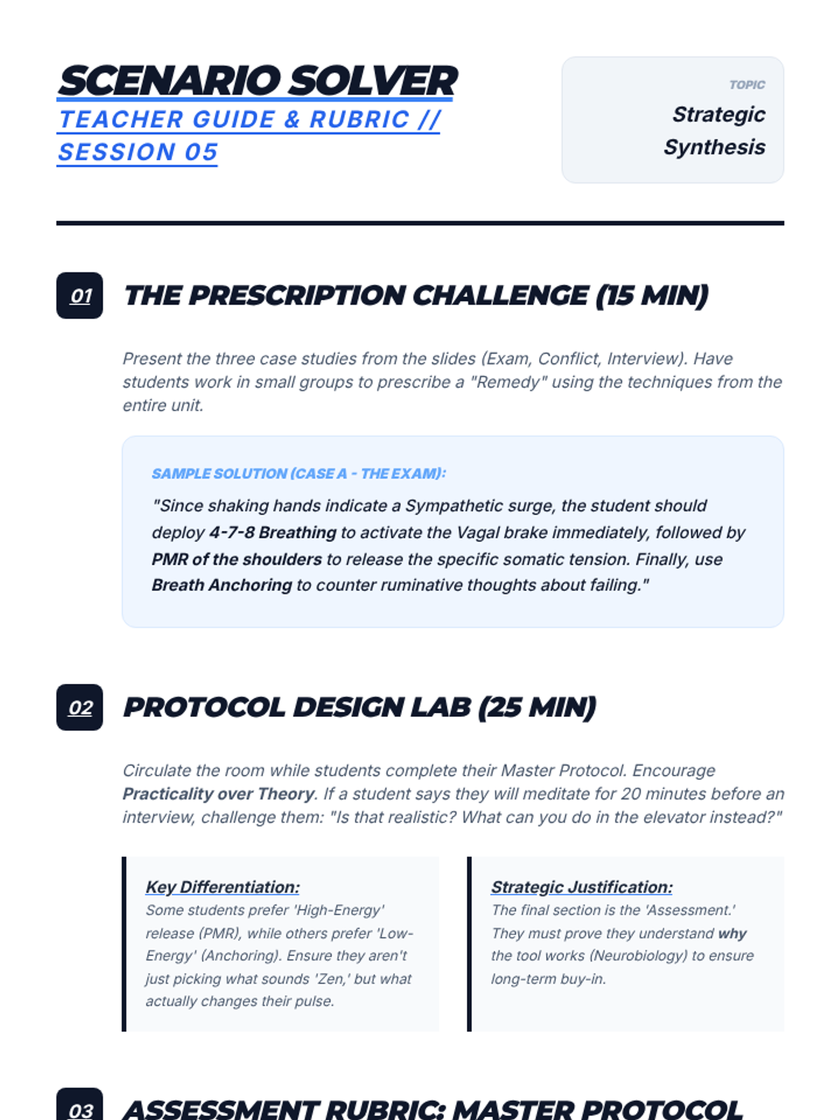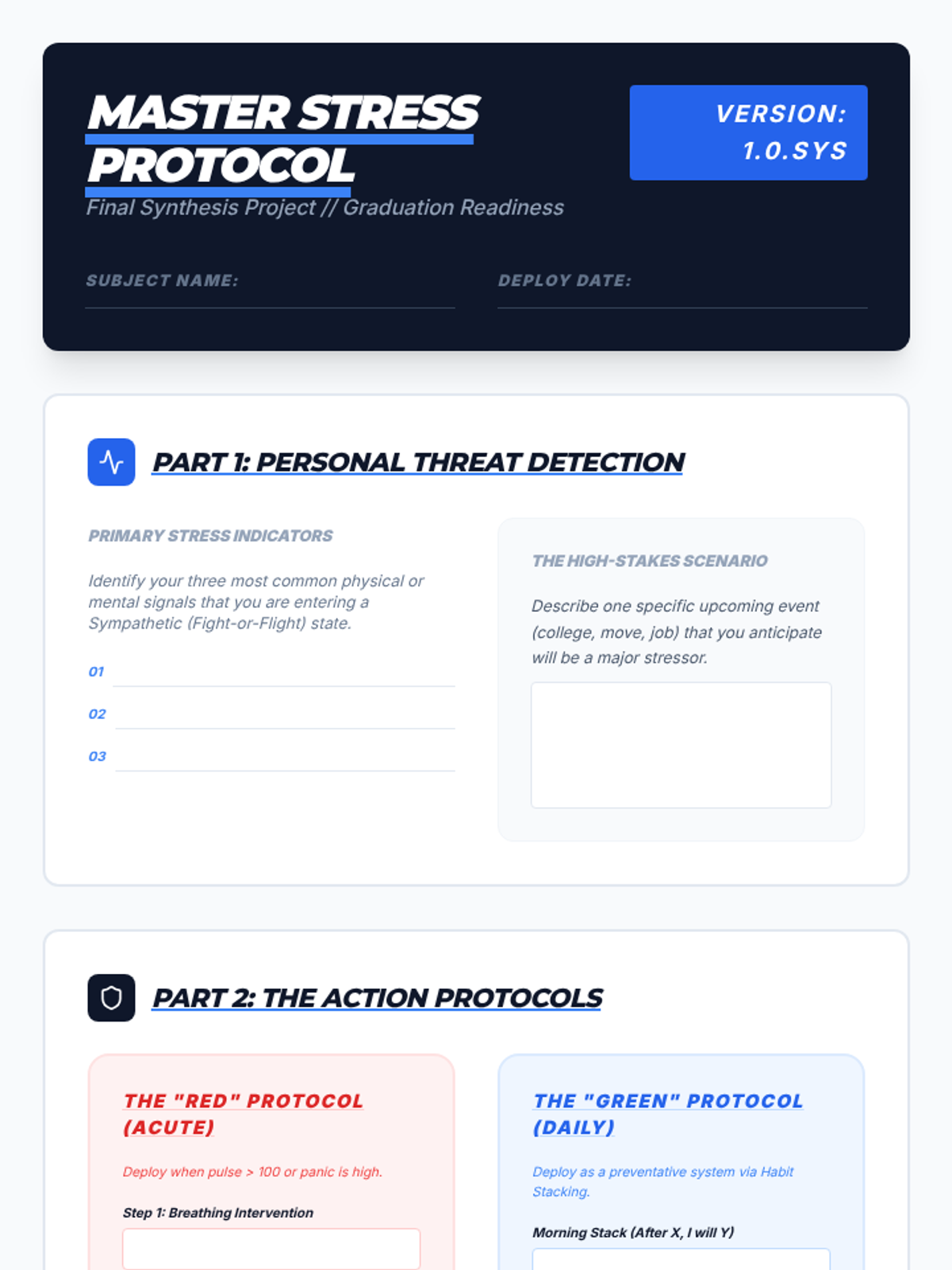 In this culminating workshop, students synthesize their learning to create a personalized stress-regulation protocol for future high-stakes scenarios.