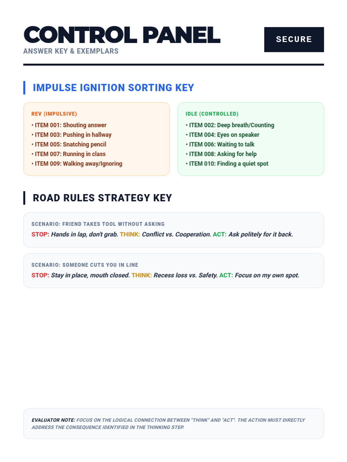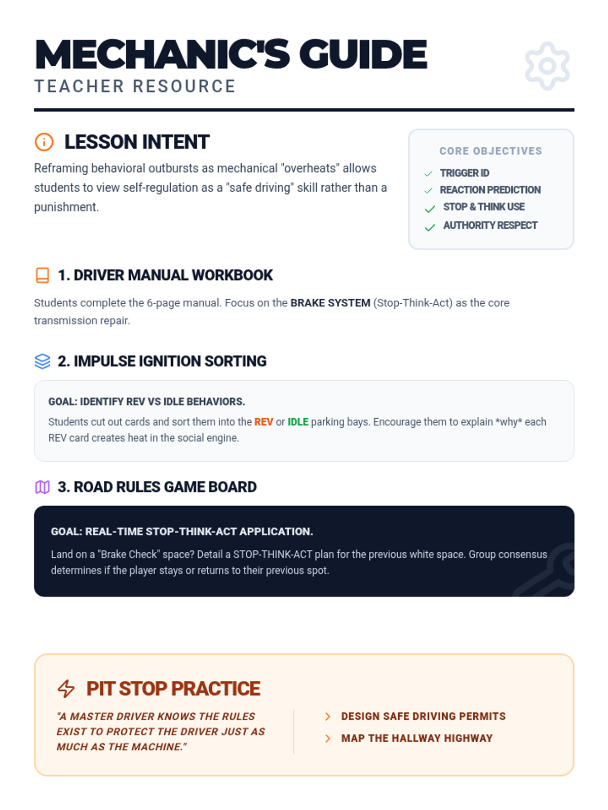 A lesson on impulse control using mechanical and automotive metaphors to teach identifying triggers, consequences, and self-regulation.