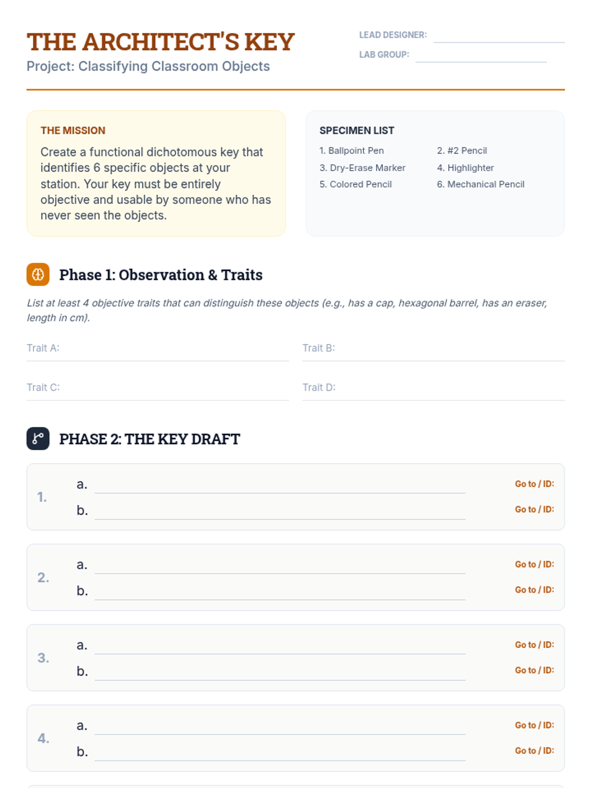 Groups create keys for classroom objects, learning to distinguish between subjective and objective traits.