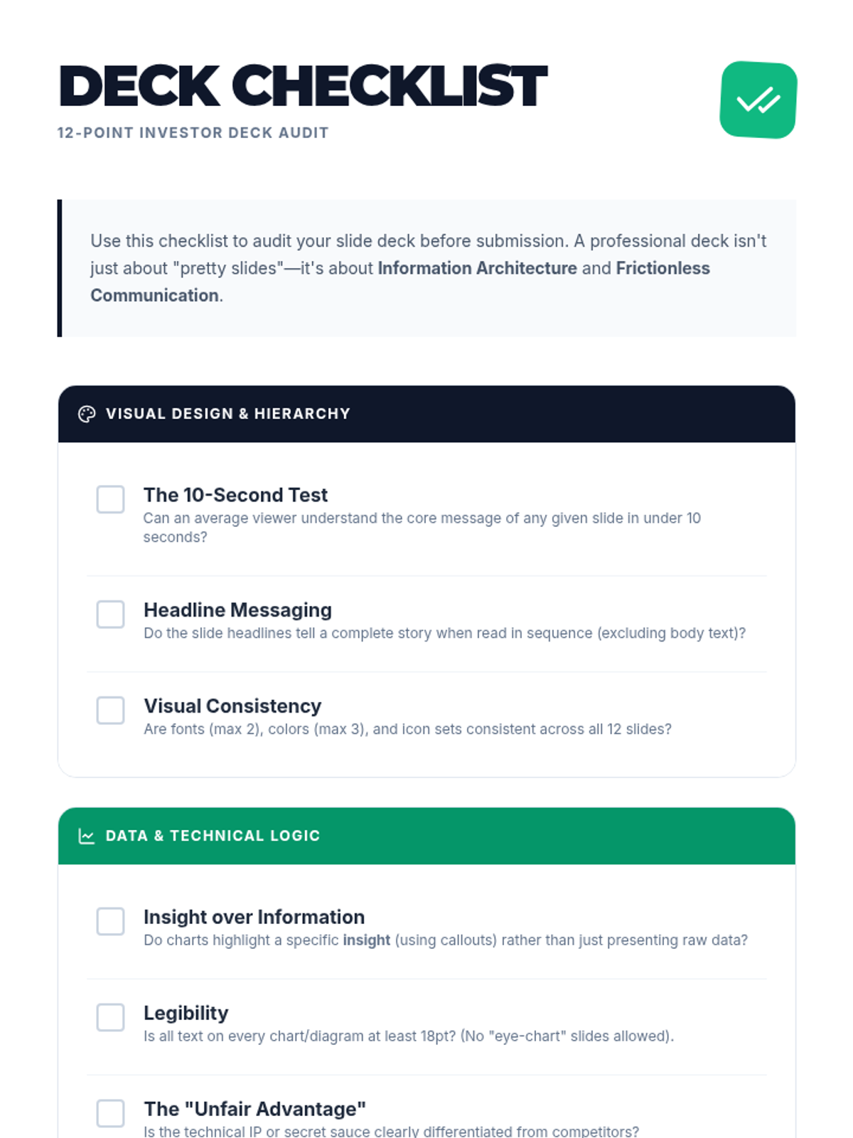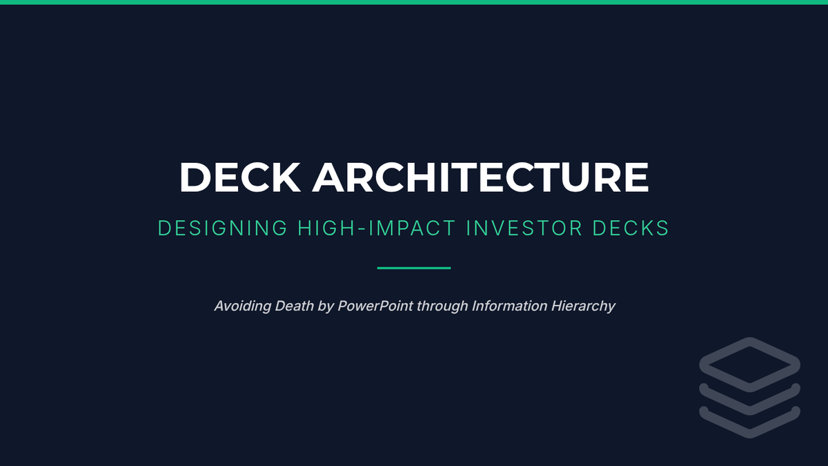 Application of design principles and content hierarchy to create professional 10-12 slide investor decks that avoid 'death by PowerPoint'.