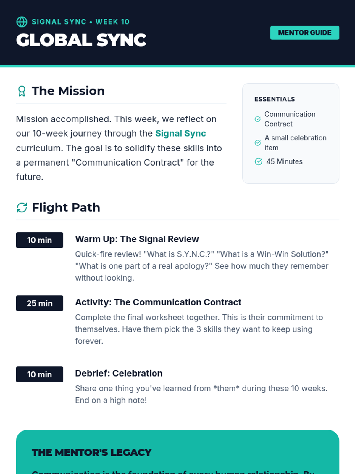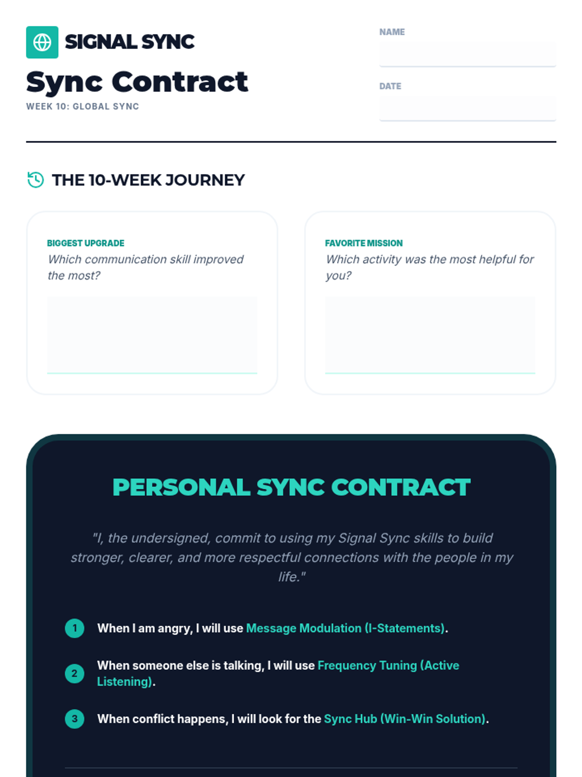 Reflecting on the 10-week journey and creating a personal communication contract for the future.