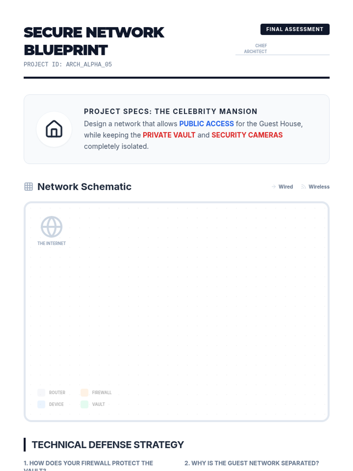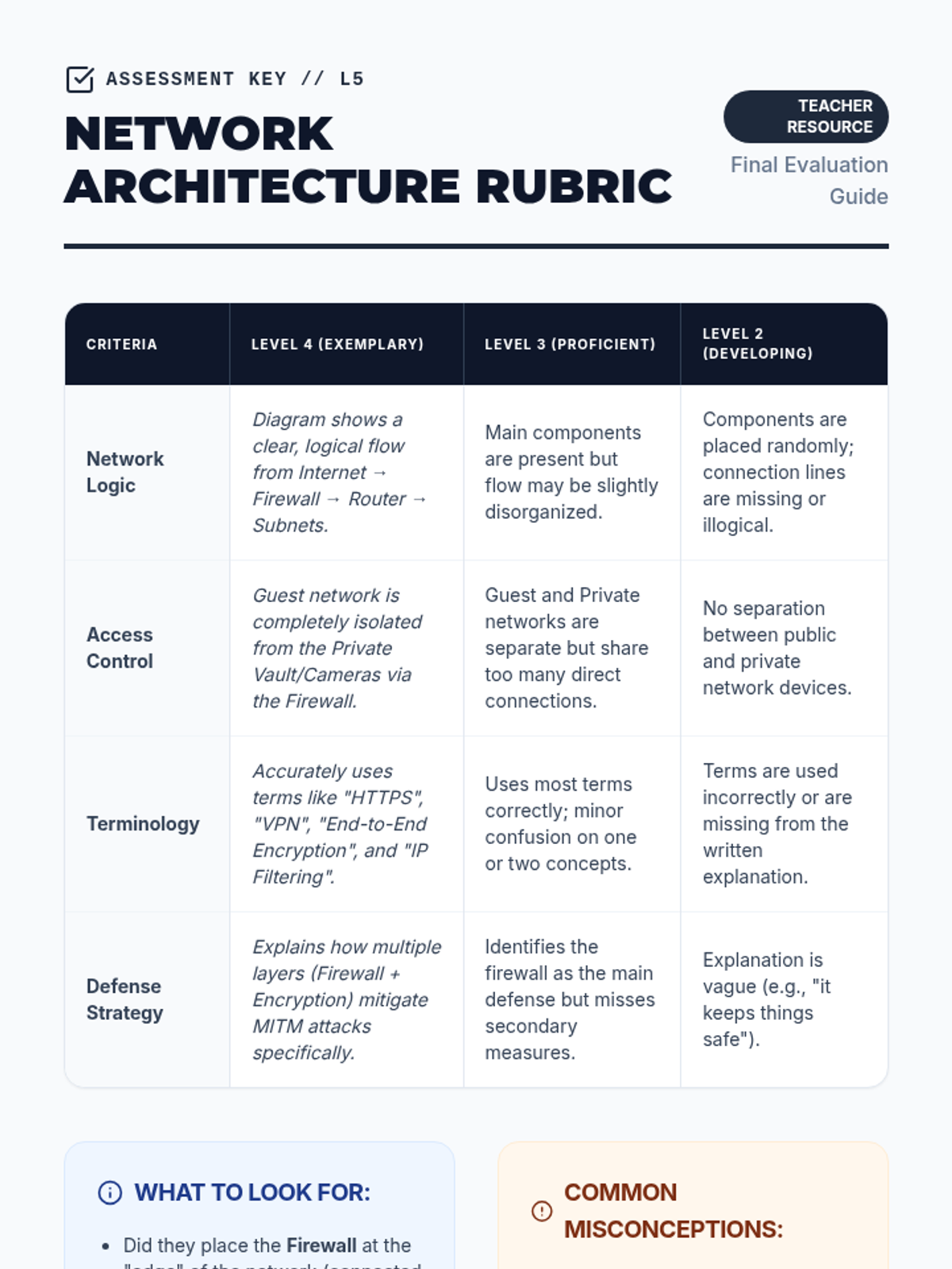 Students apply their knowledge to draw a diagram of a secure home or school network. They must place routers, firewalls, and devices correctly and explain how their design mitigates the attacks discussed in previous lessons.
