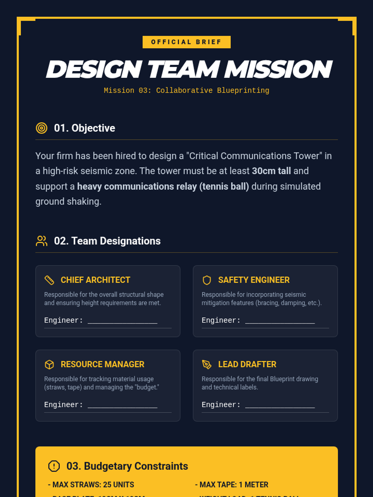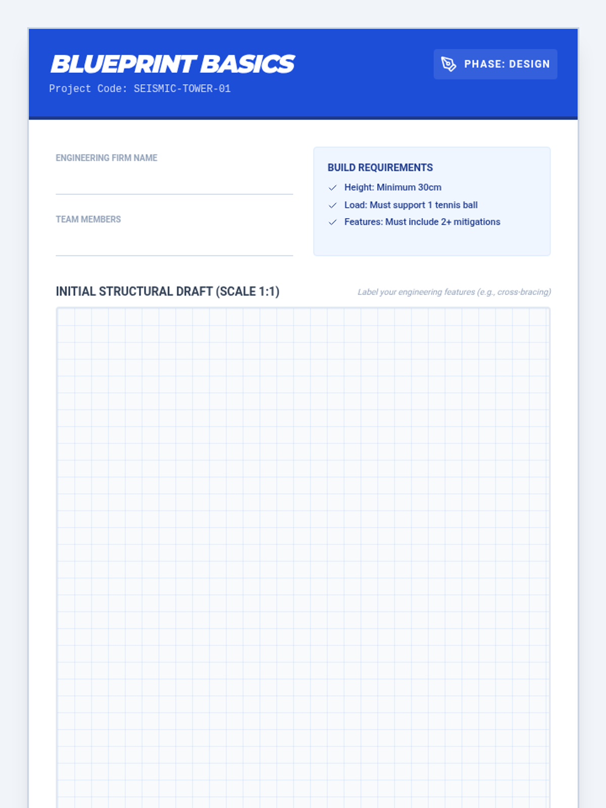 Working in teams, students draft a blueprint for a structure using limited materials (straws, tape, paper clips). They must incorporate specific engineering features discussed in the previous lesson.
