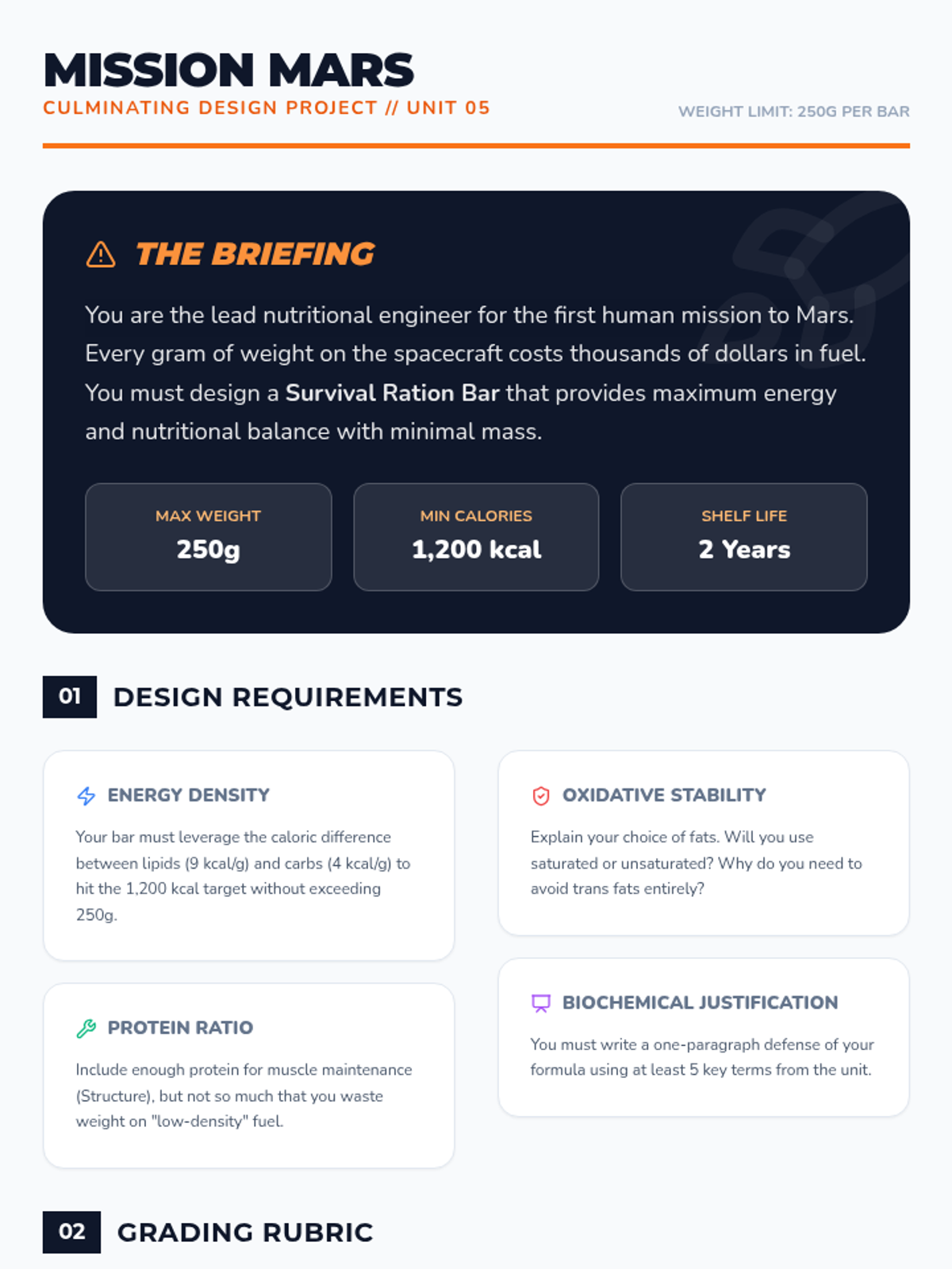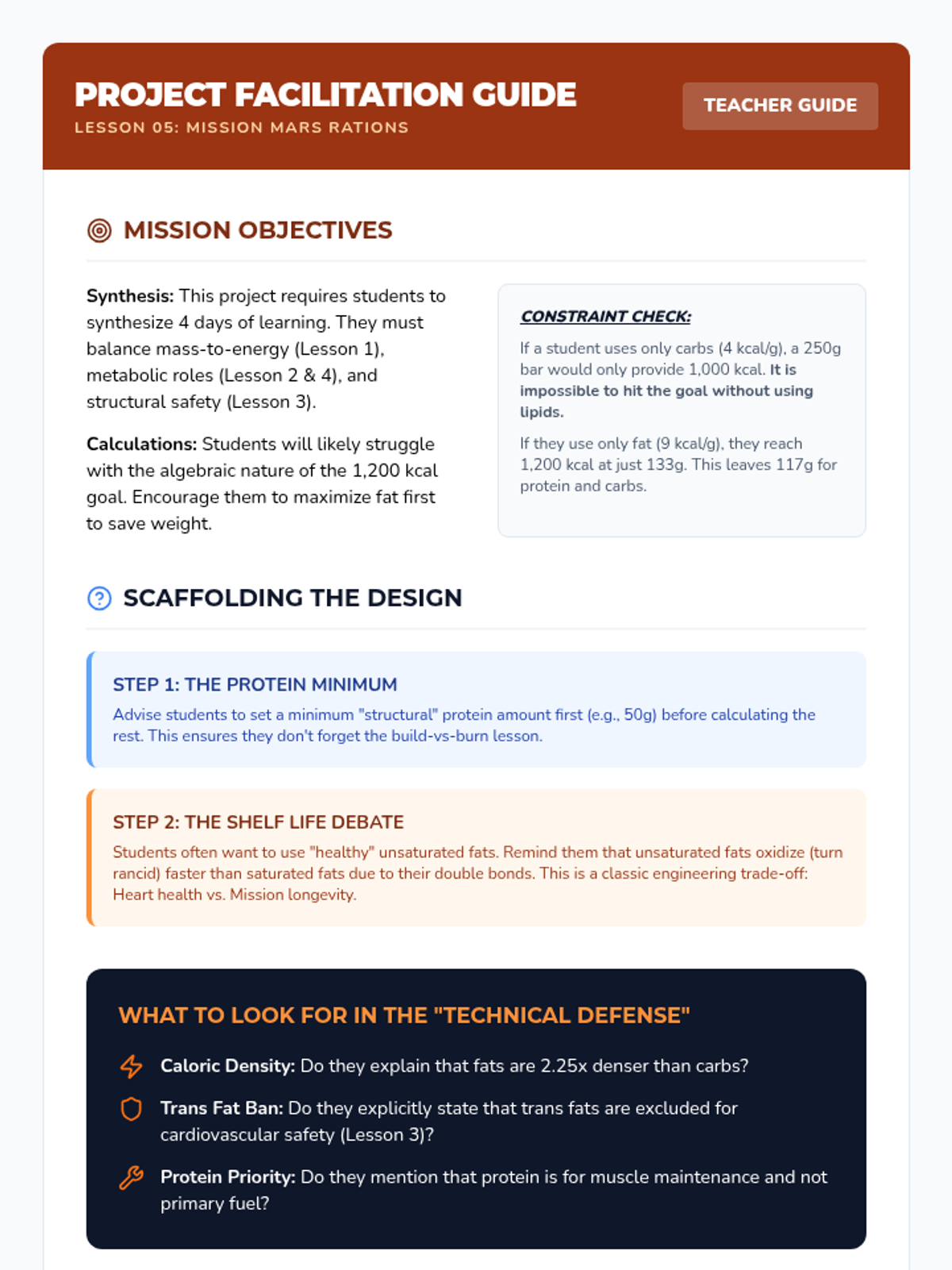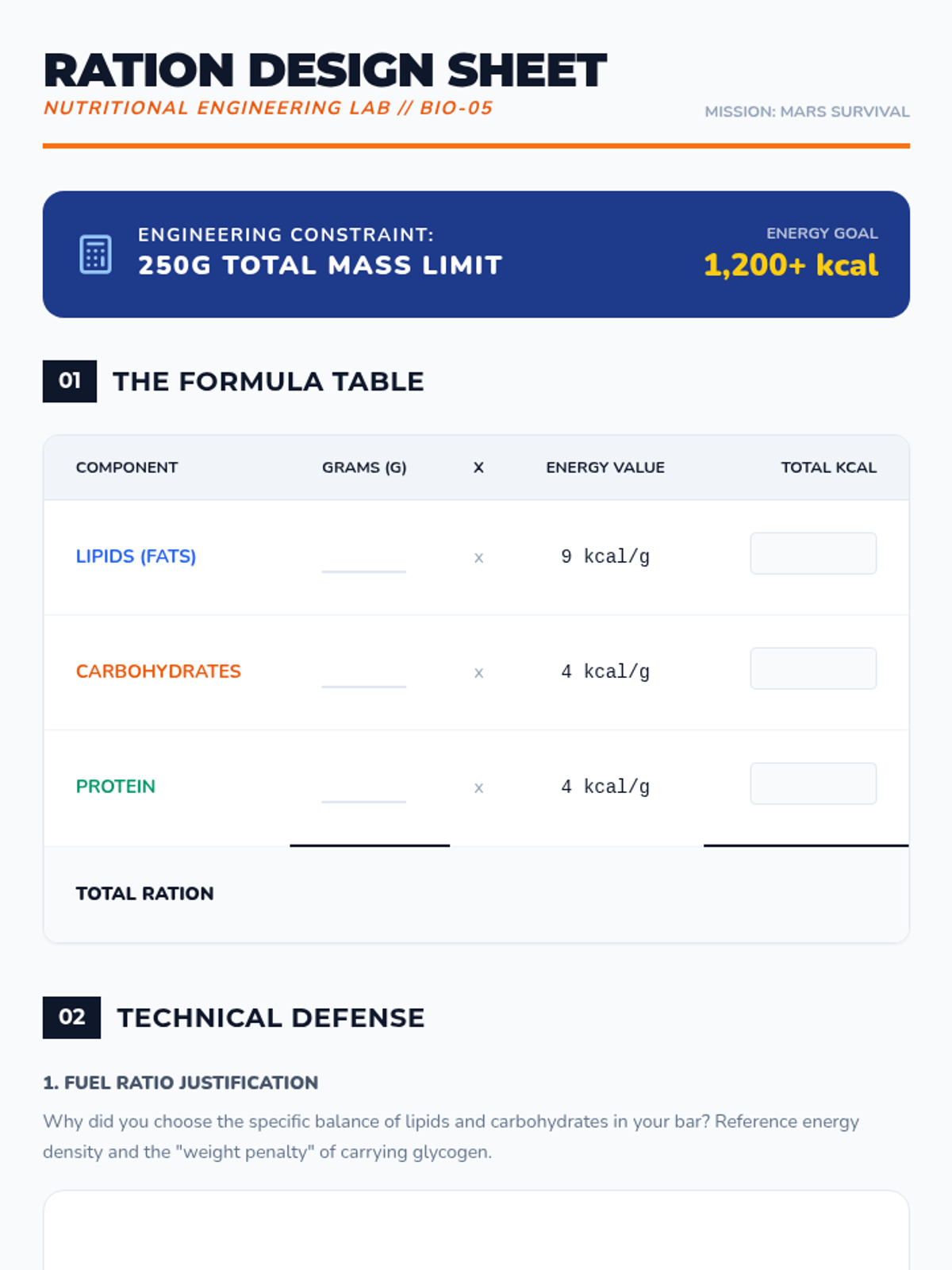 Students design a survival food bar for Mars astronauts, balancing mass, caloric density, and shelf stability based on biochemical knowledge.