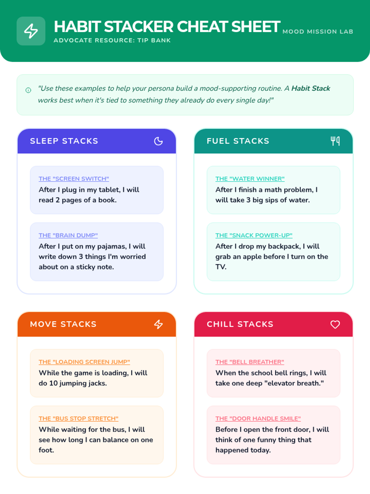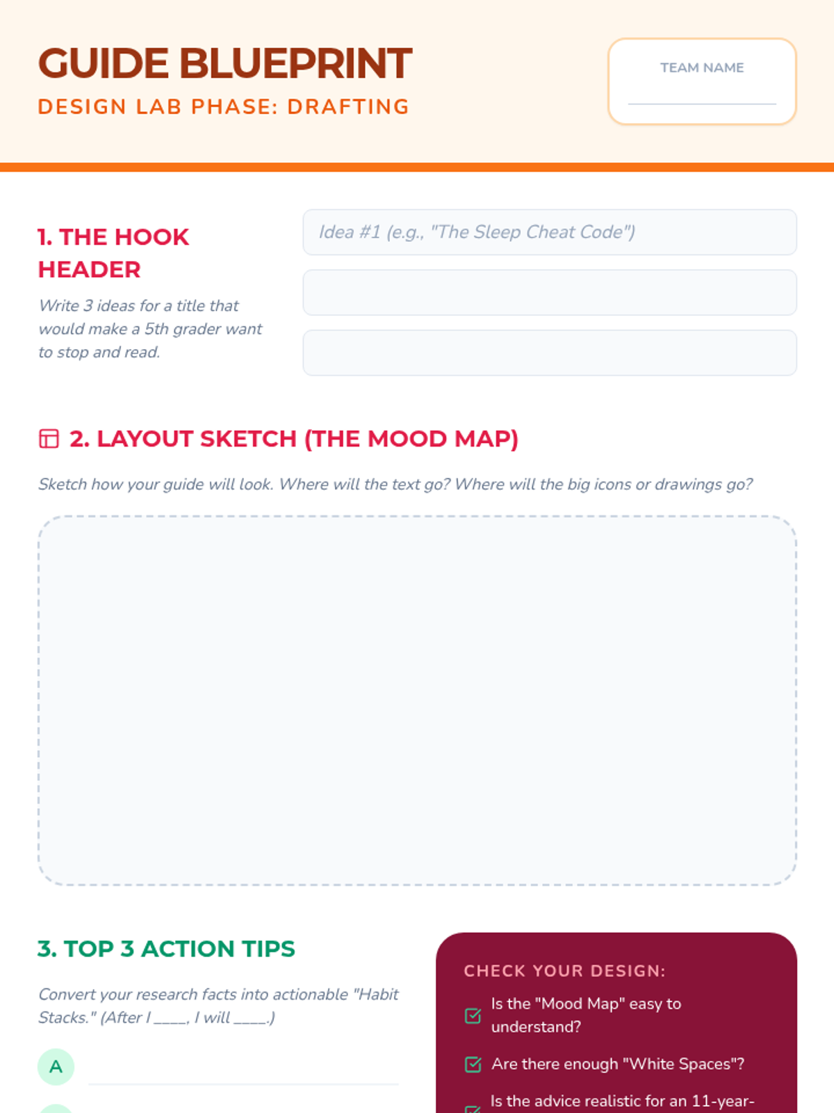 Students draft the layout and content of their resource guide. They focus on clear headings, actionable tips (habit stacking examples), and engaging visuals that explain the mood-body connection.