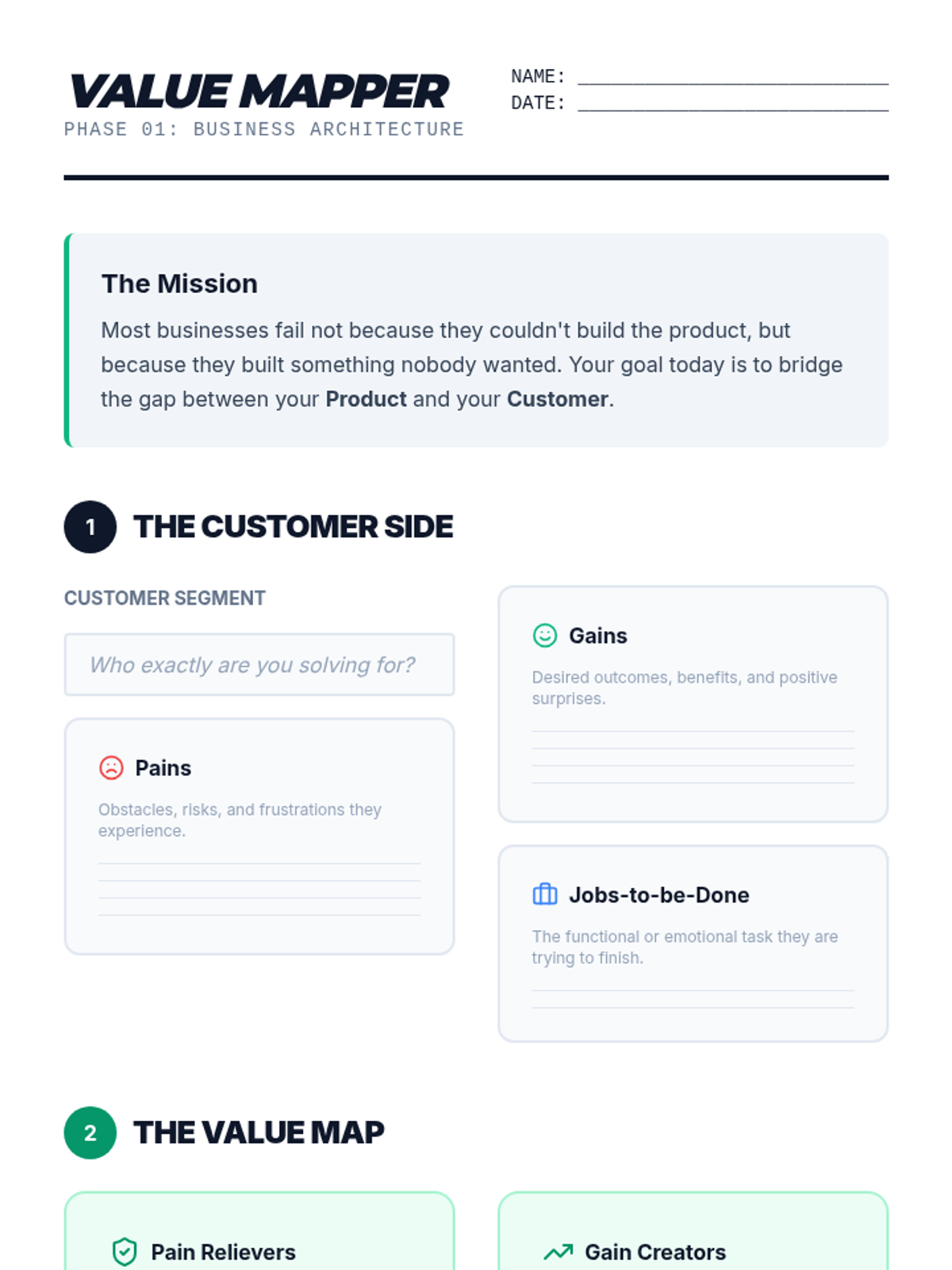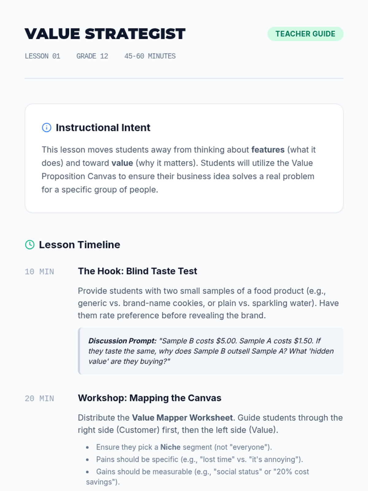 Students map product features to customer needs using the Value Proposition Canvas and define their Unique Value Proposition.