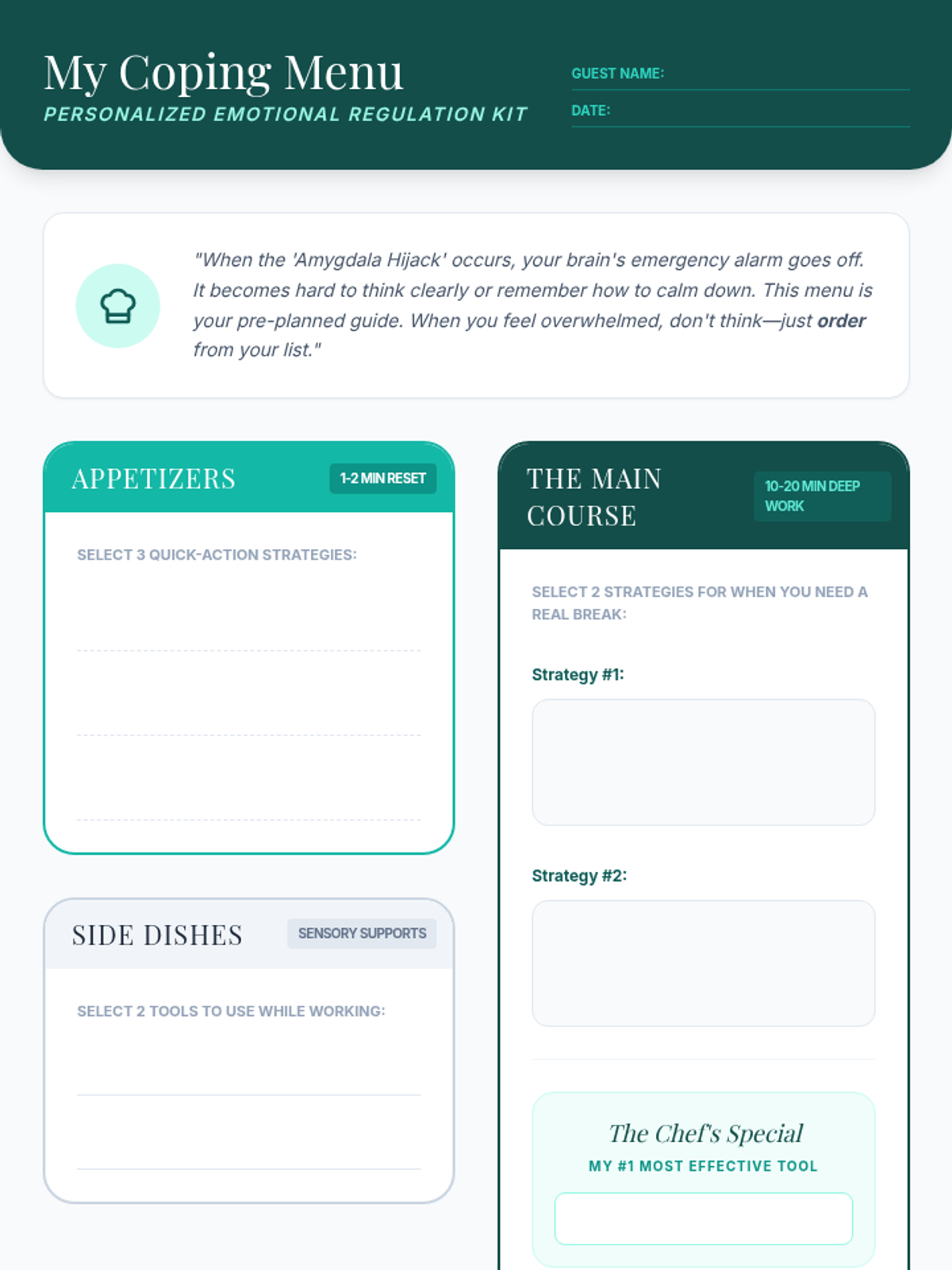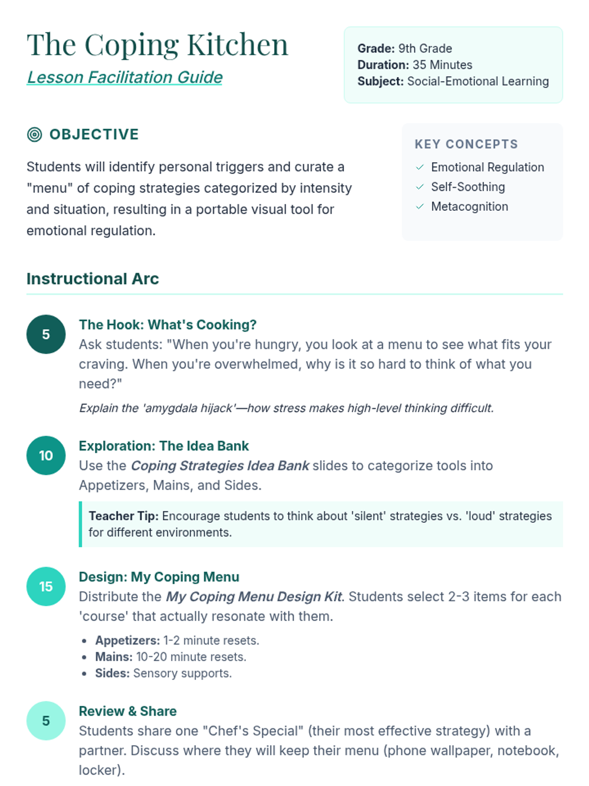 Students will explore various emotional regulation strategies and synthesize them into a personalized 'coping menu'—a visual tool designed to help them manage stress and dysregulation in real-time.