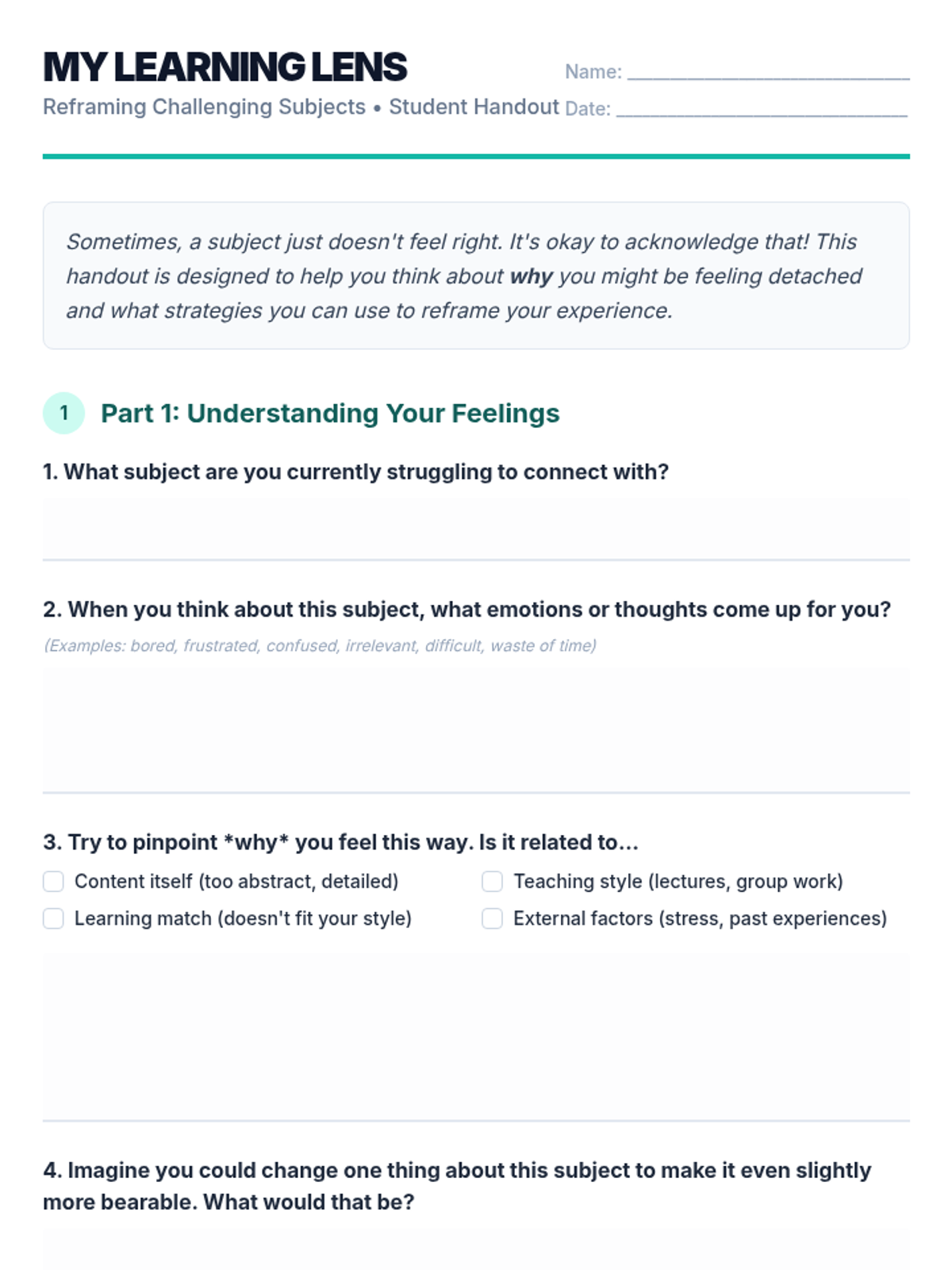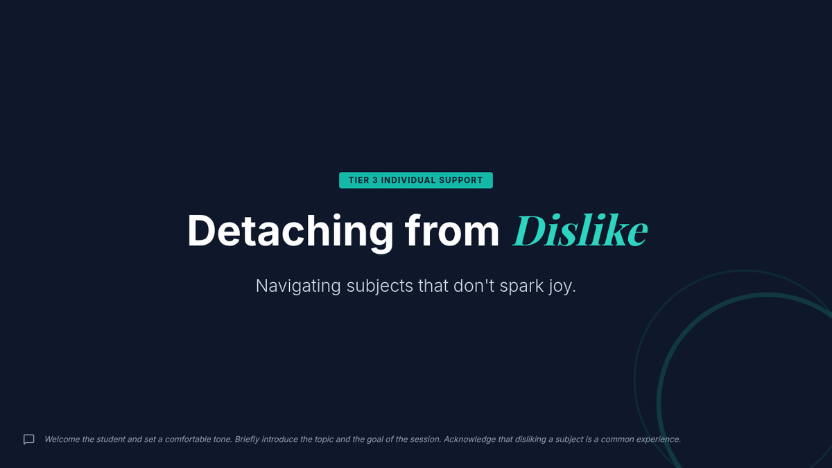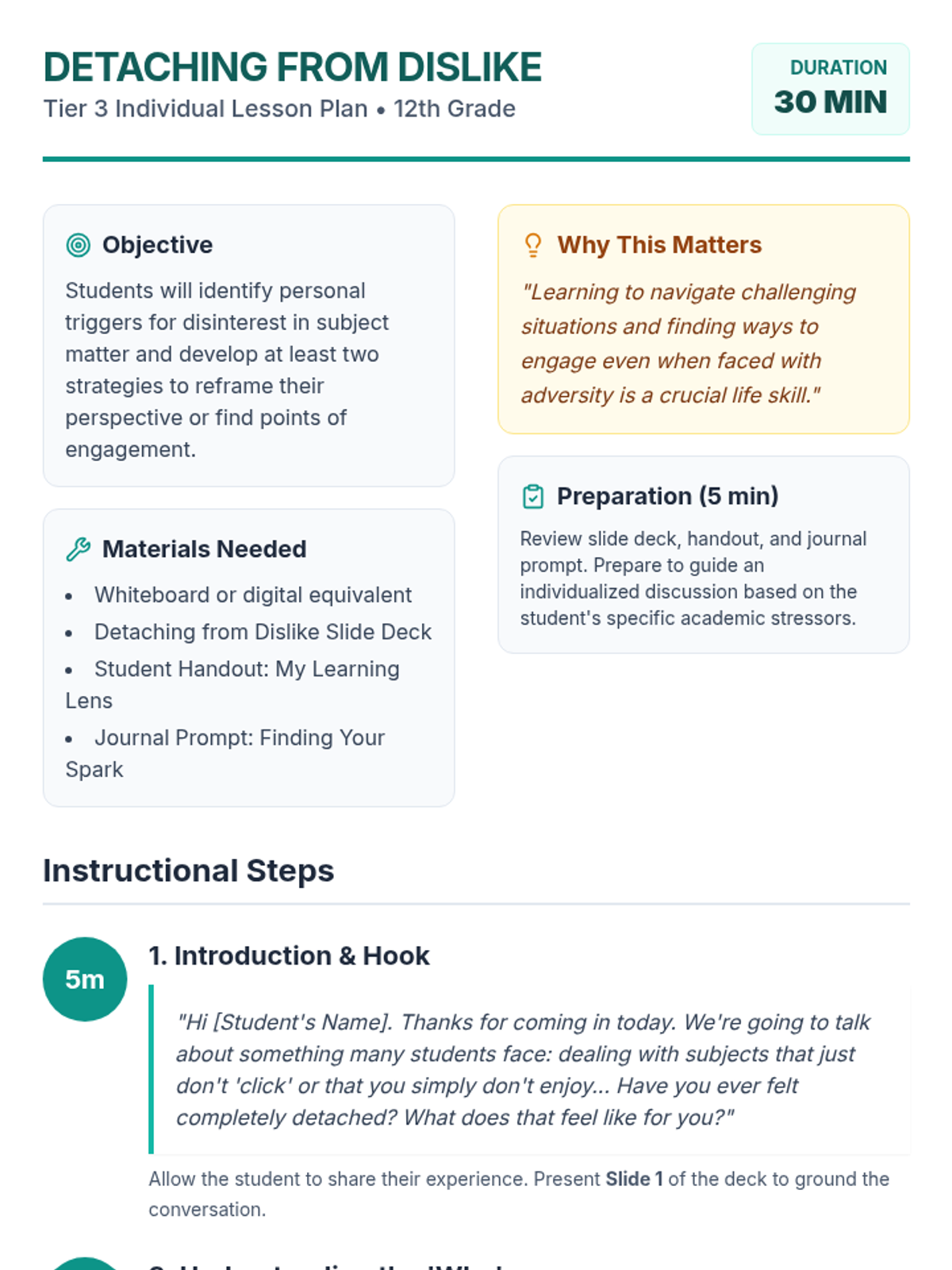 A 30-minute, Tier 3 individual lesson for 12th-grade students focused on developing strategies to handle disinterest in specific subject matter through reframing and perspective-shifting.