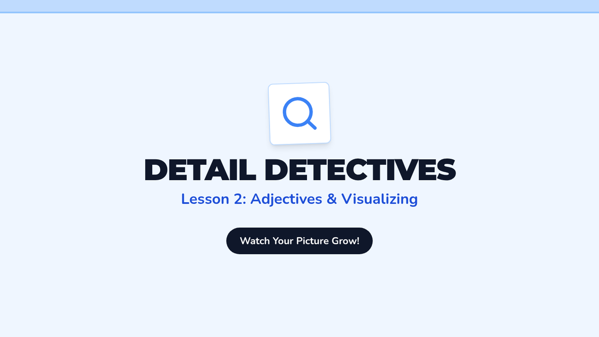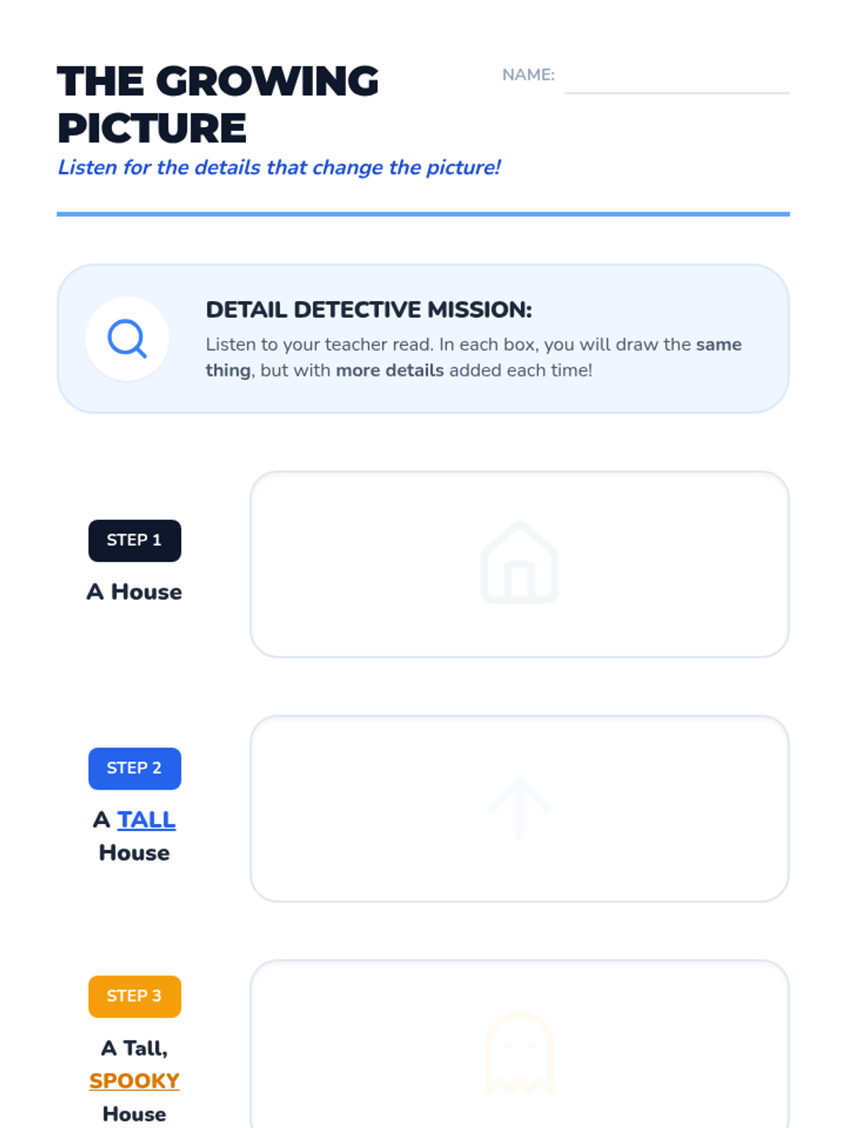 Students learn how descriptive adjectives change their mental images. By progressively adding details to a basic sentence, students modify their drawings to reflect more complex visualizations.