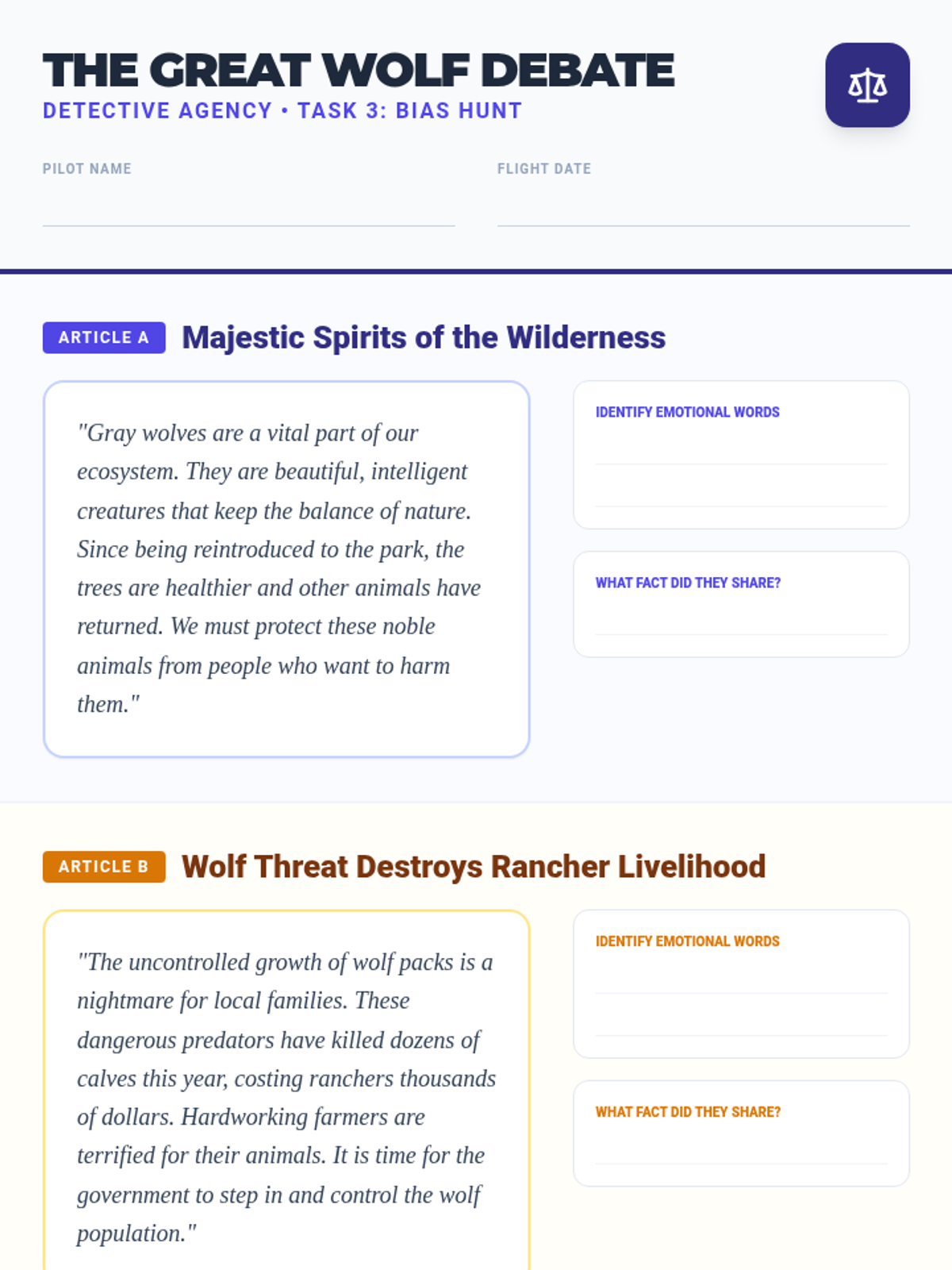 Students compare two articles about the same topic written from different perspectives. They identify how fact selection and emotional language influence the reader, introducing the concept of bias.