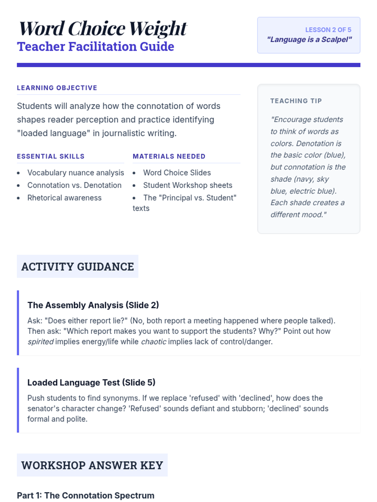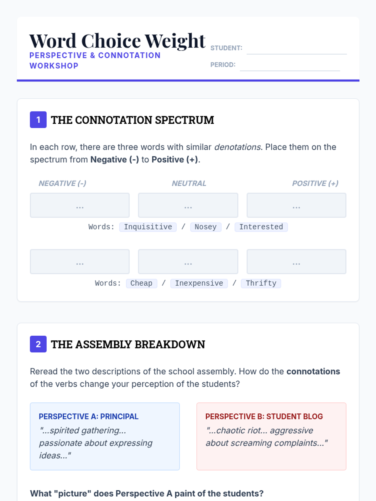 Students explore how positive and negative connotations in word choice alter public perception, analyzing rhetorical awareness in descriptions of the same event.