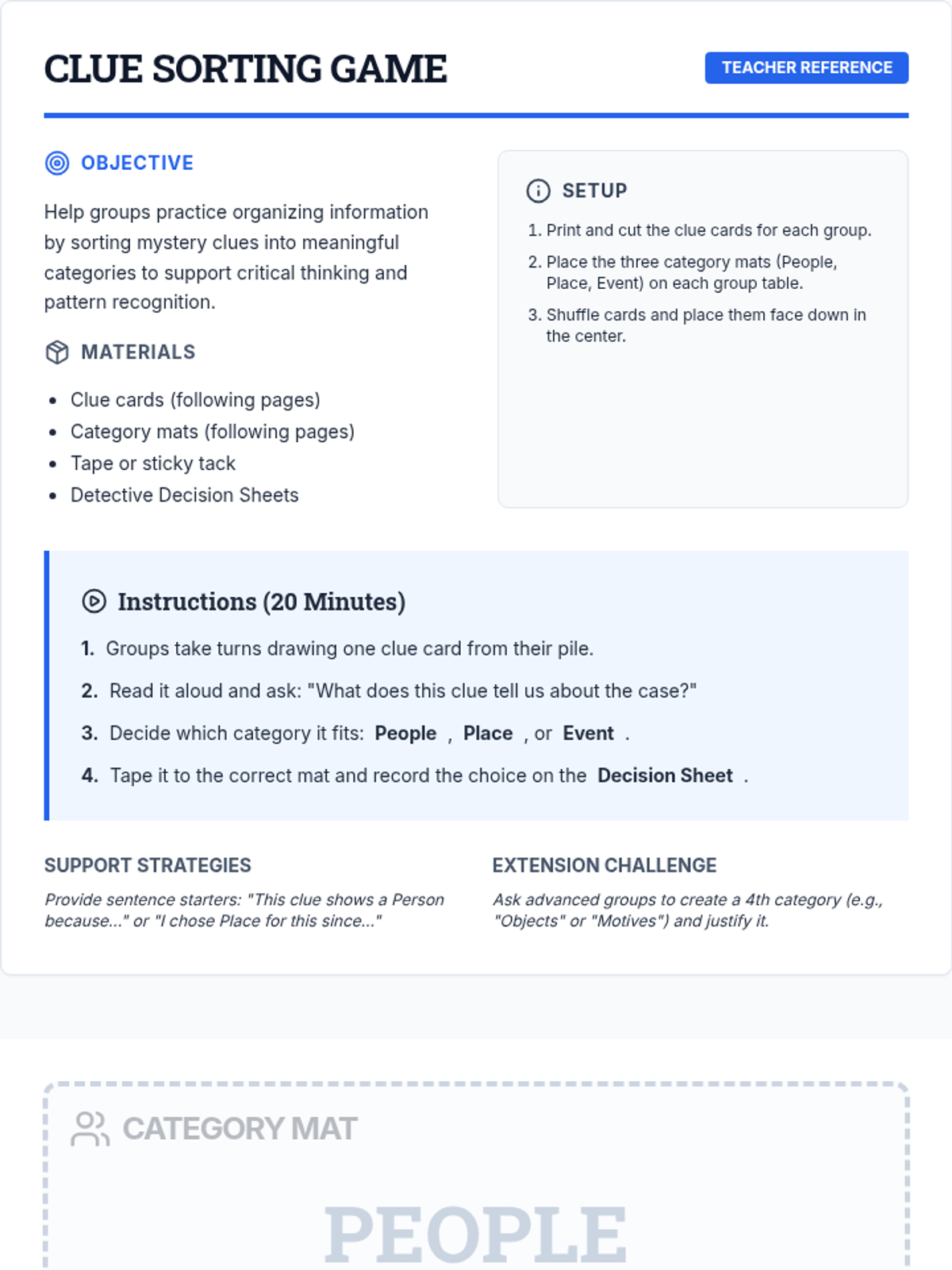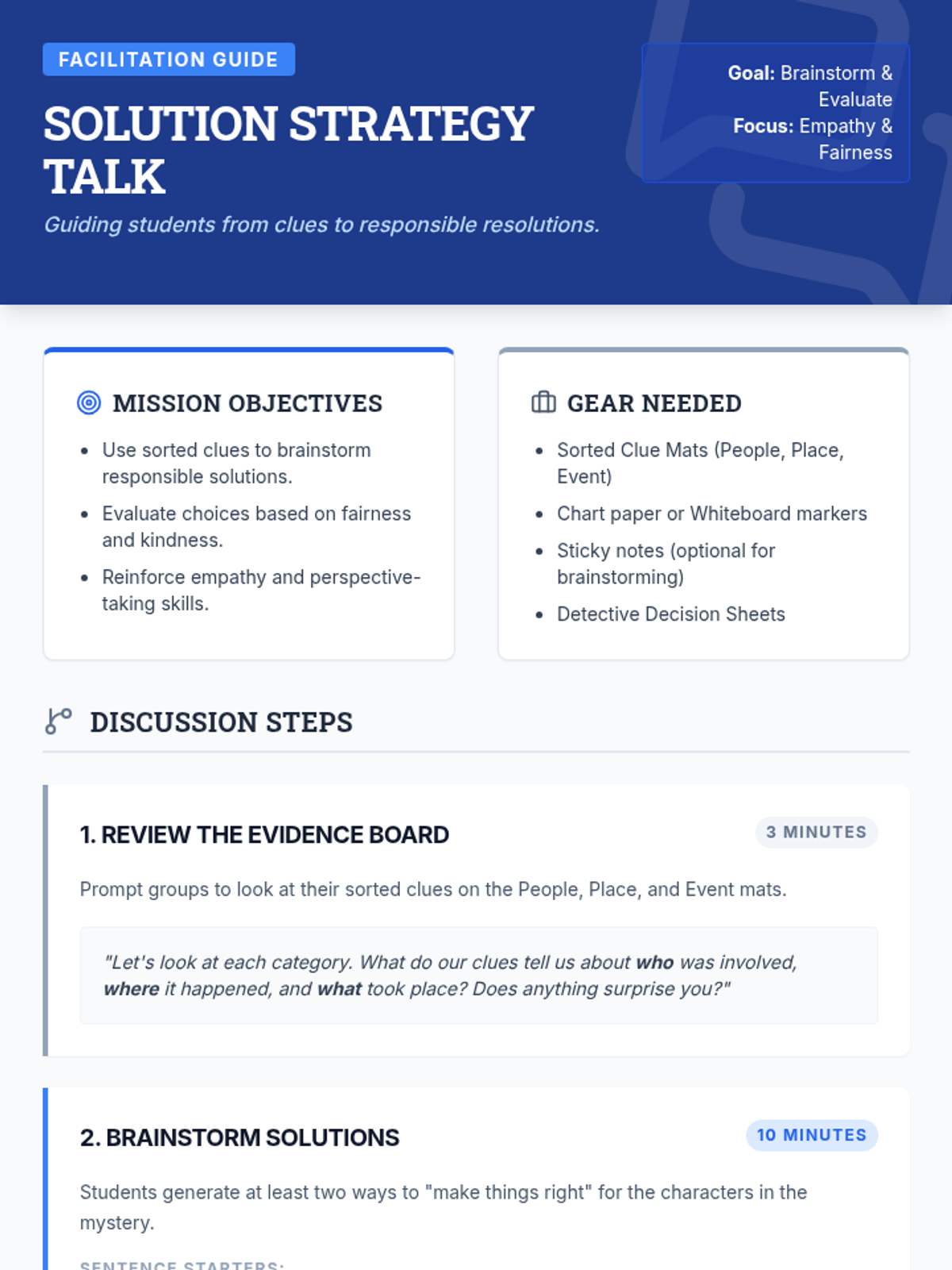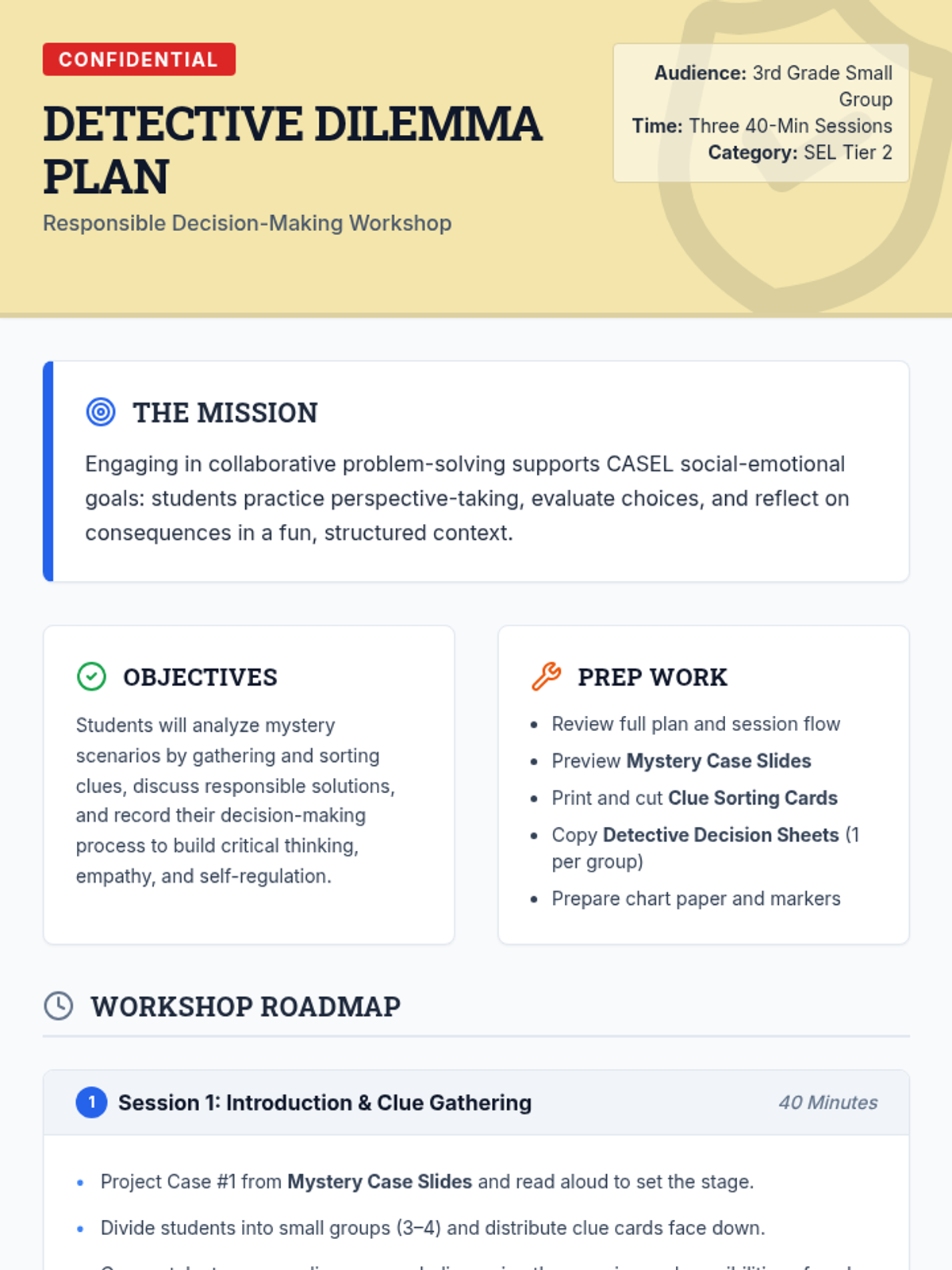 Students investigate mystery scenarios over three sessions, gathering clues, discussing solutions, and reflecting on the impact of their decisions.