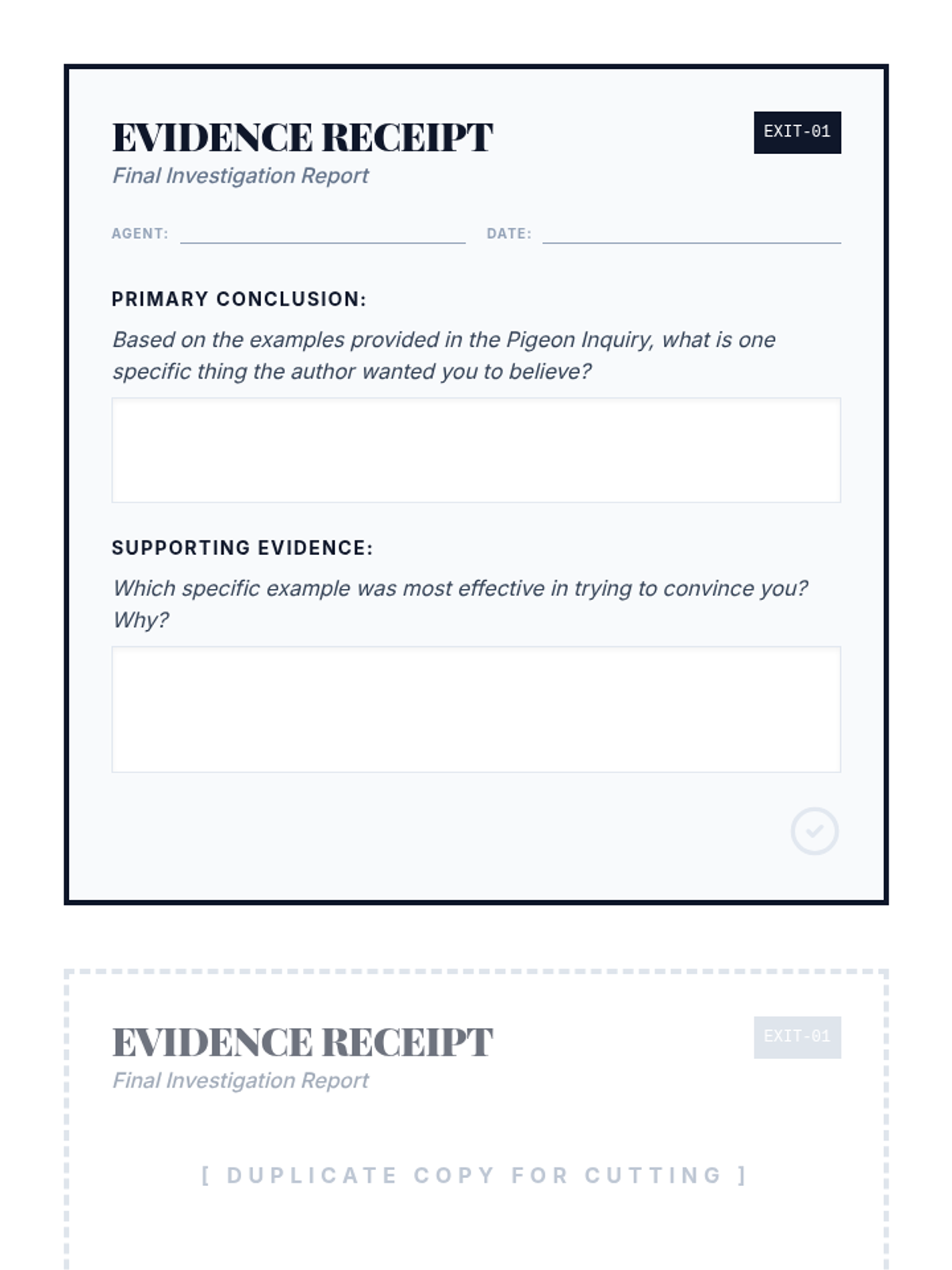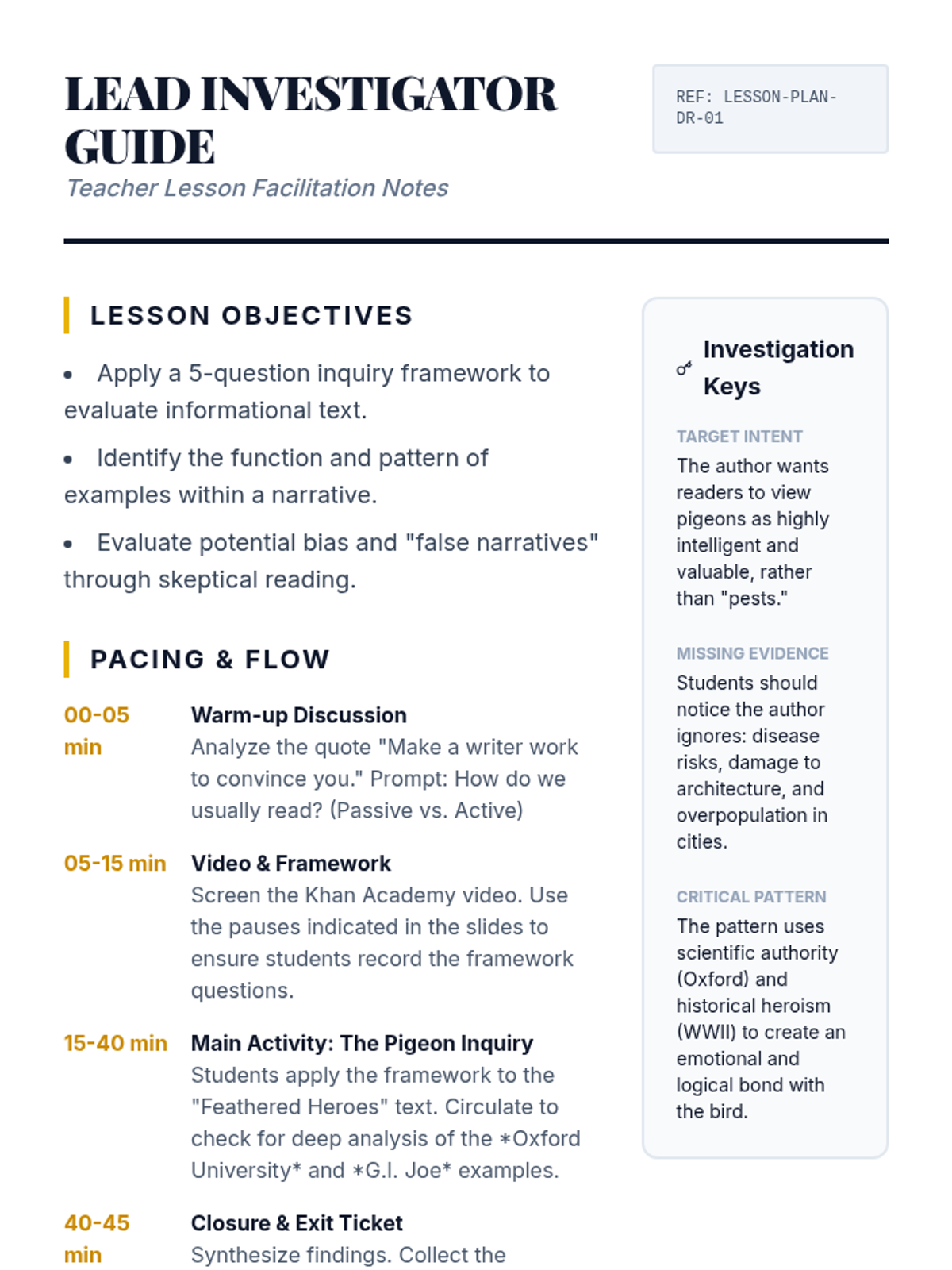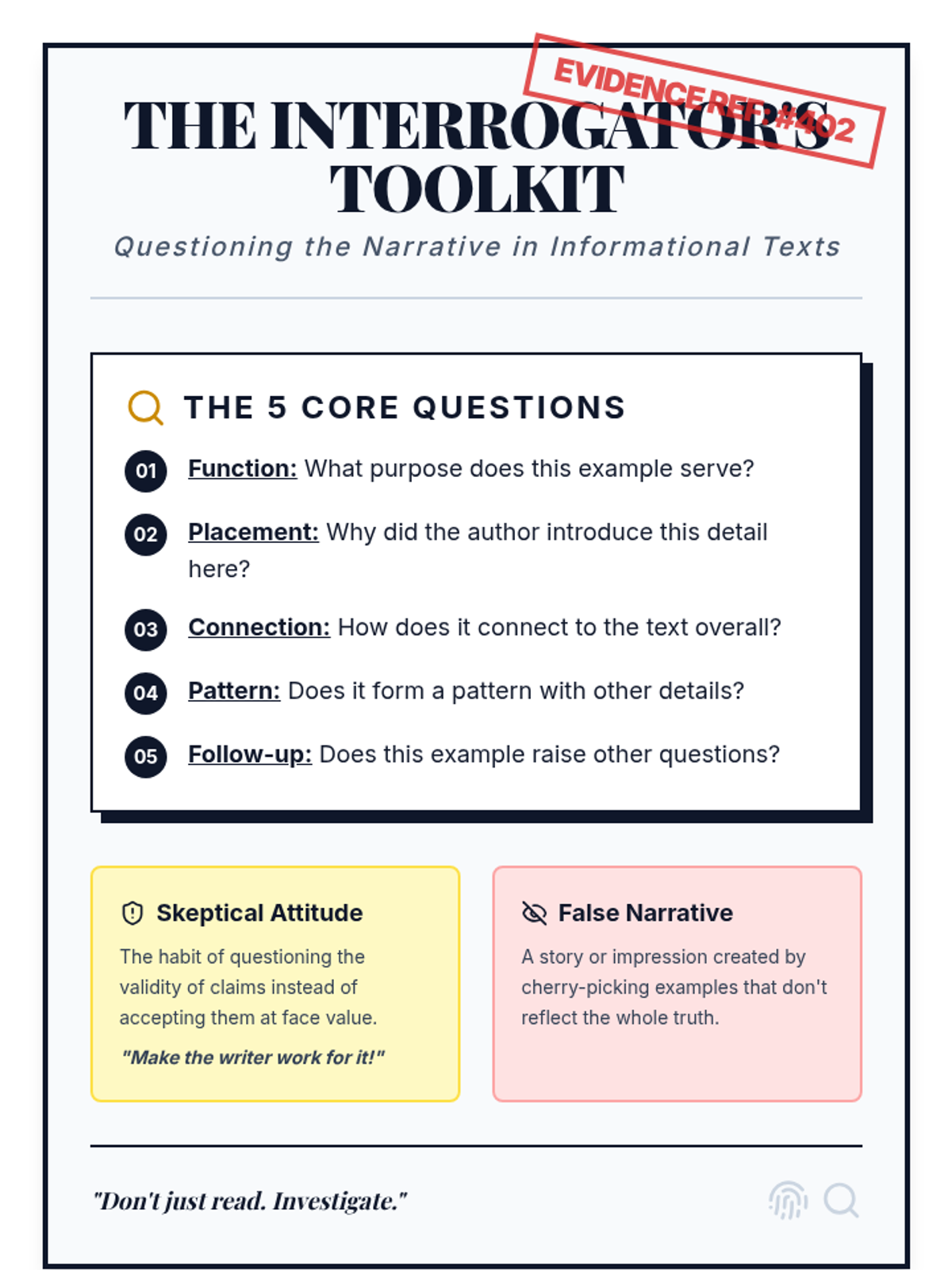Students will learn to interrogate informational texts by applying a questioning framework to examples, uncovering authorial intent and identifying potential false narratives through a 'detective' lens.