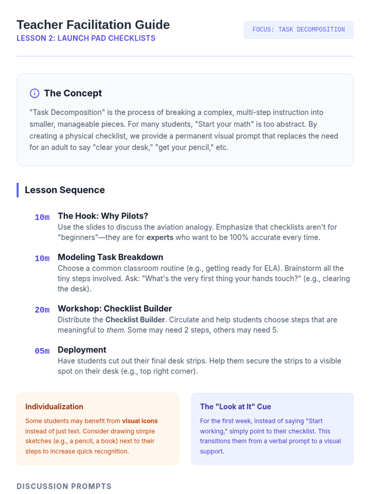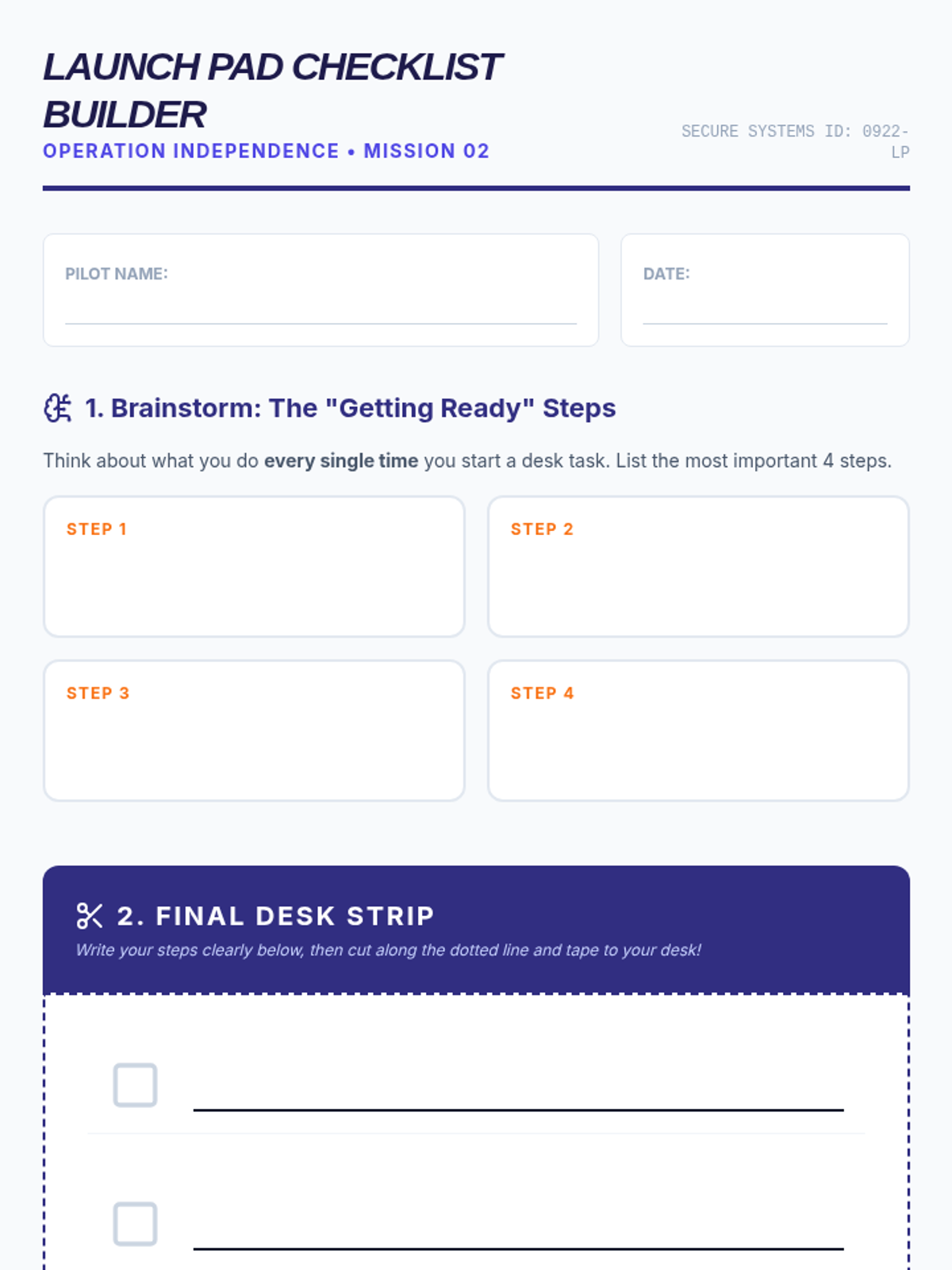 Students create personalized visual checklists that break down complex 'start' commands into manageable micro-steps to replace verbal reminders.