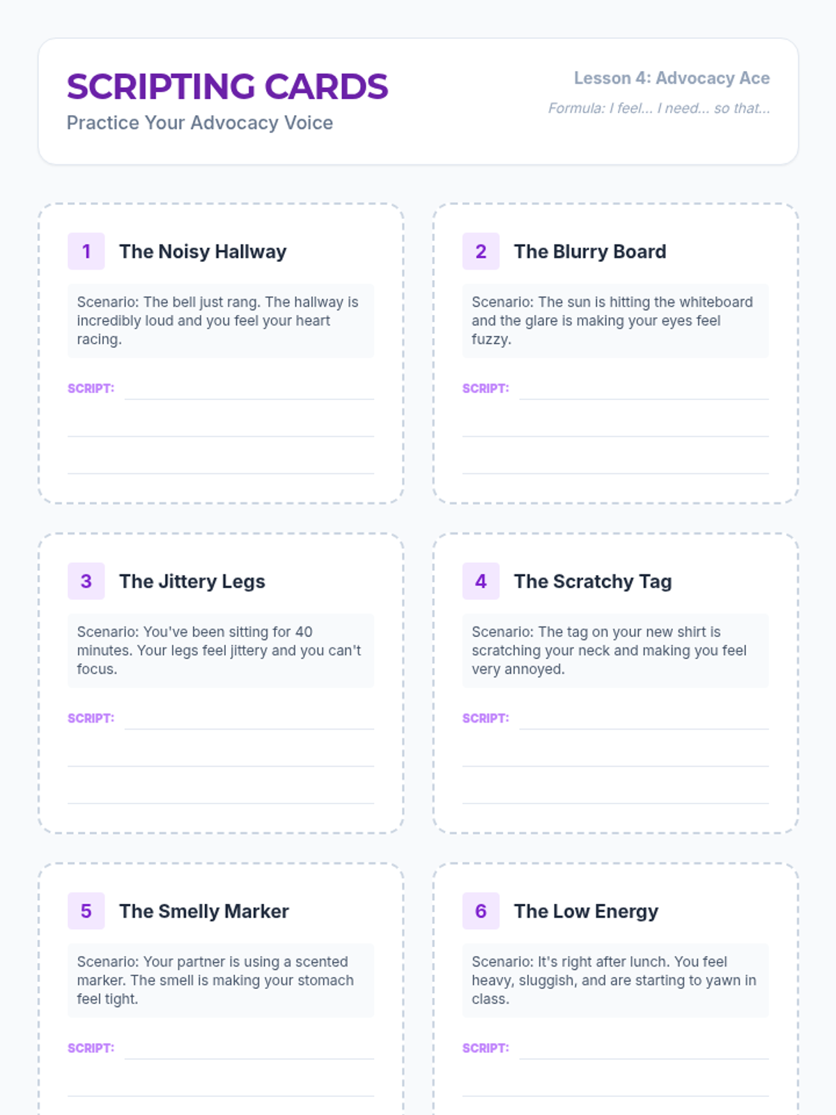 Students learn the difference between complaining and advocating, focusing on respectful communication with authority figures. They draft and practice scripts to ask for sensory accommodations.