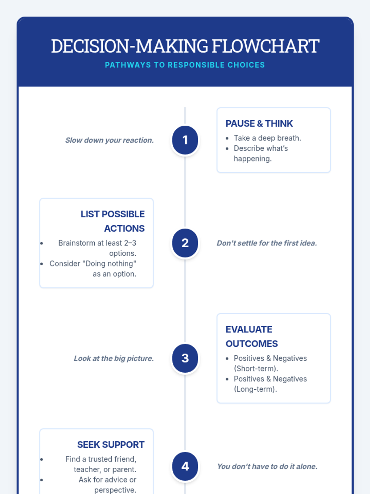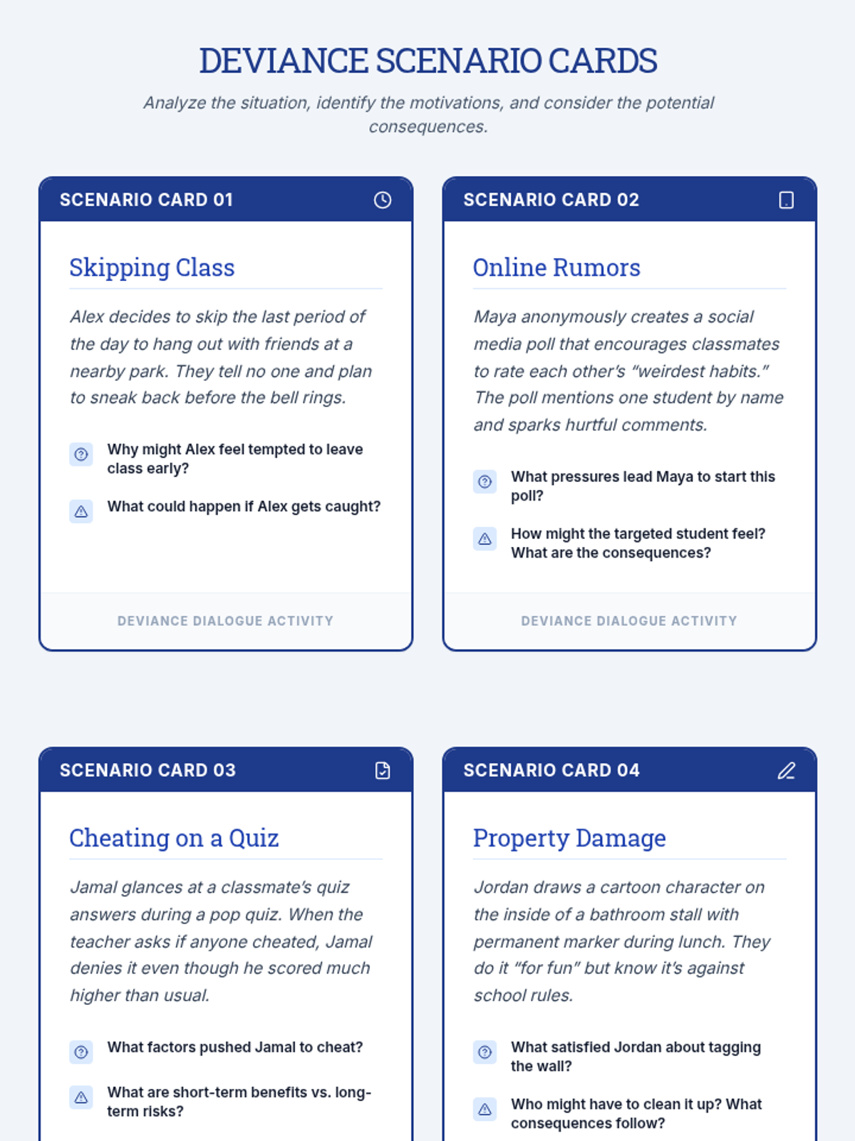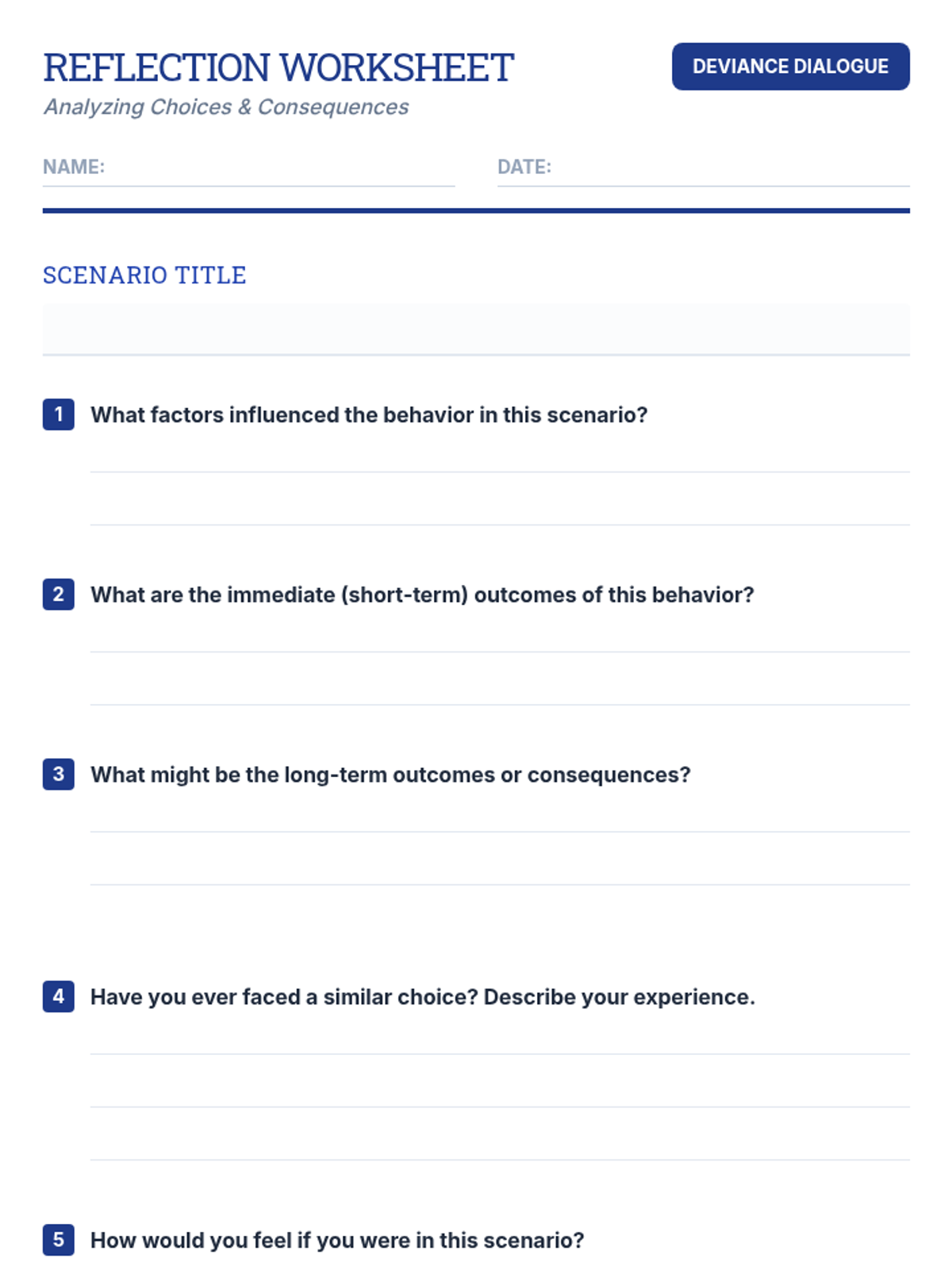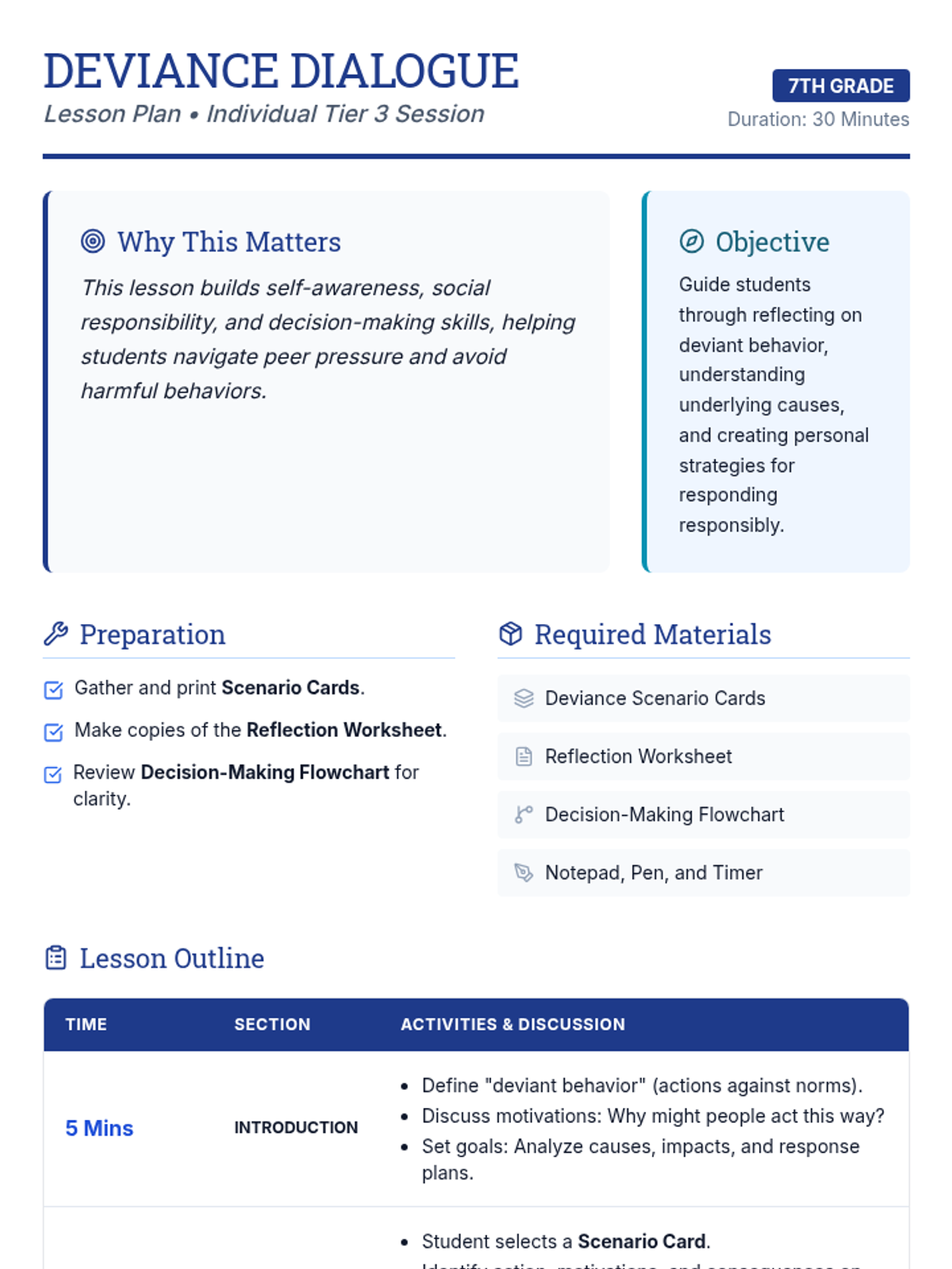 A 30-minute individual Tier 3 session helping 7th graders reflect on deviant behavior, its causes, and responsible decision-making strategies.