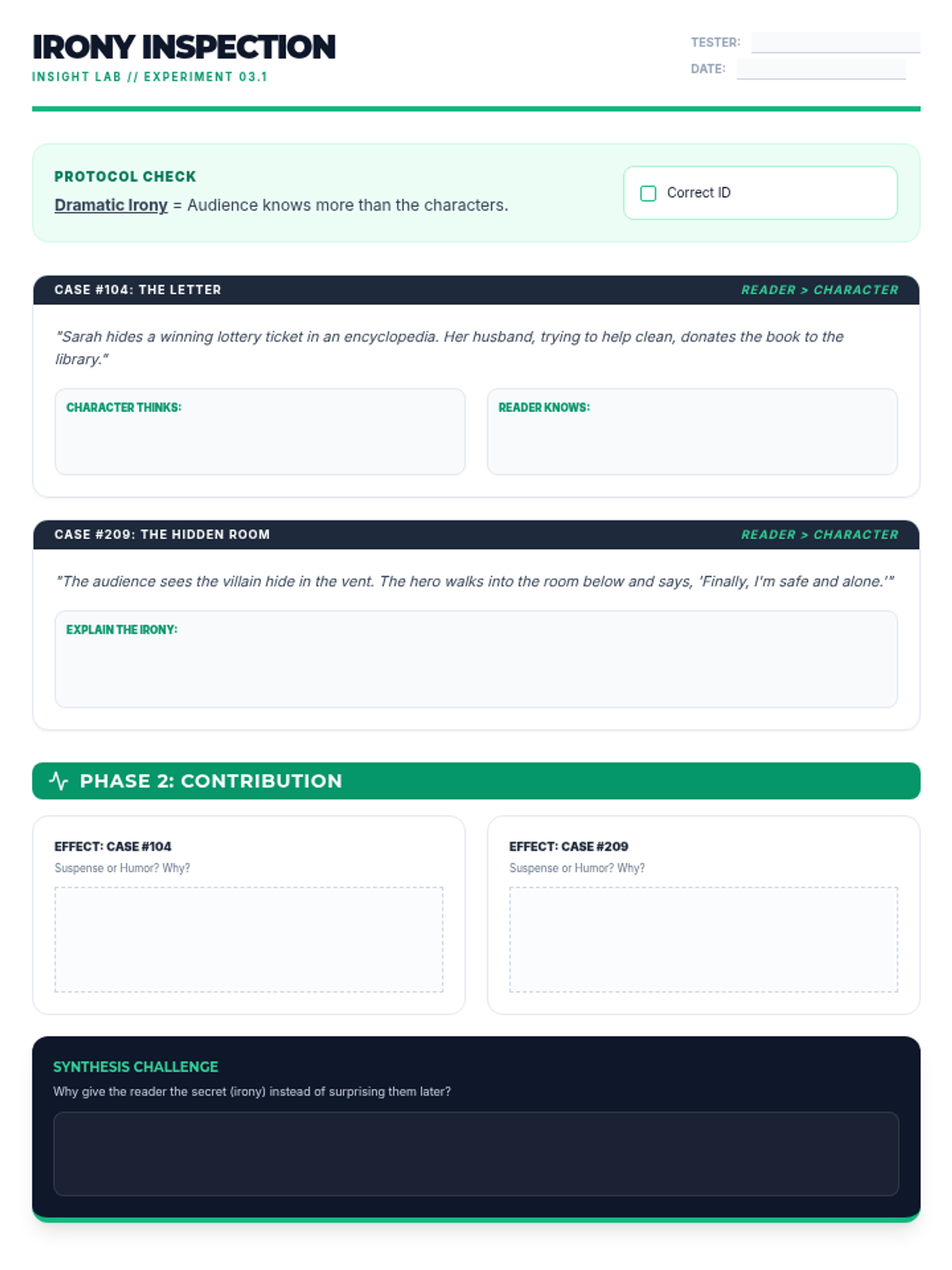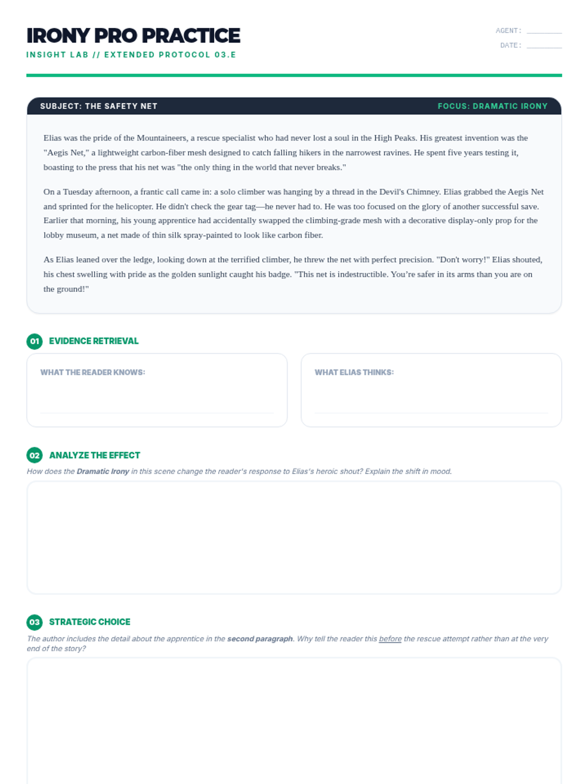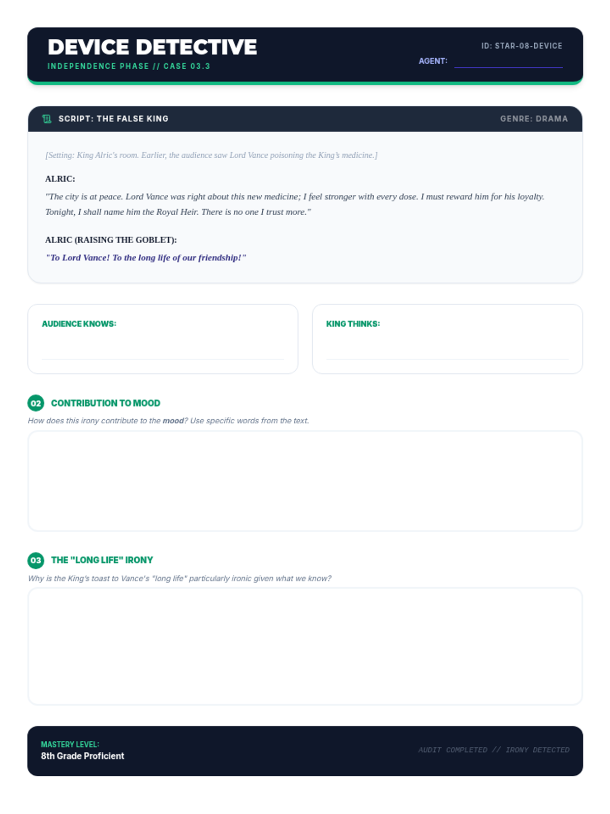 Focuses on identifying and explaining the contribution of literary devices, specifically dramatic irony and its effect on the reader.