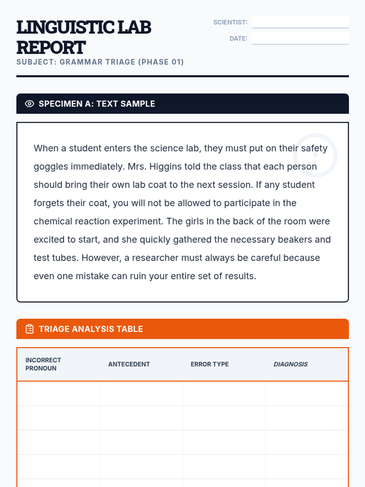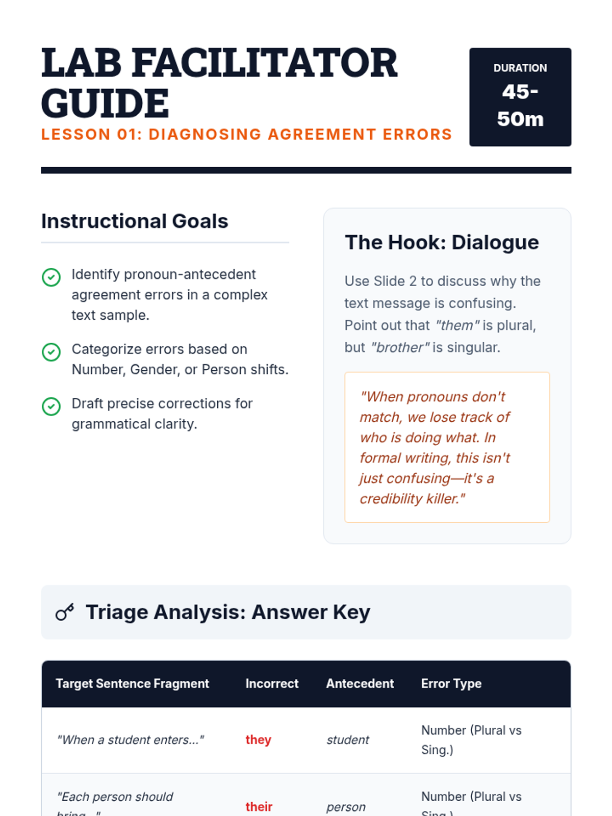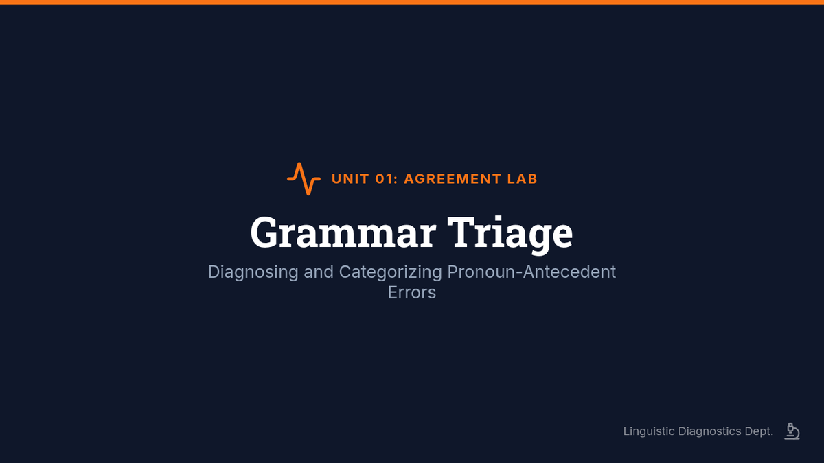 Students participate in a 'grammar triage' activity where they identify and categorize agreement errors in a provided text, establishing a baseline for grammatical precision.