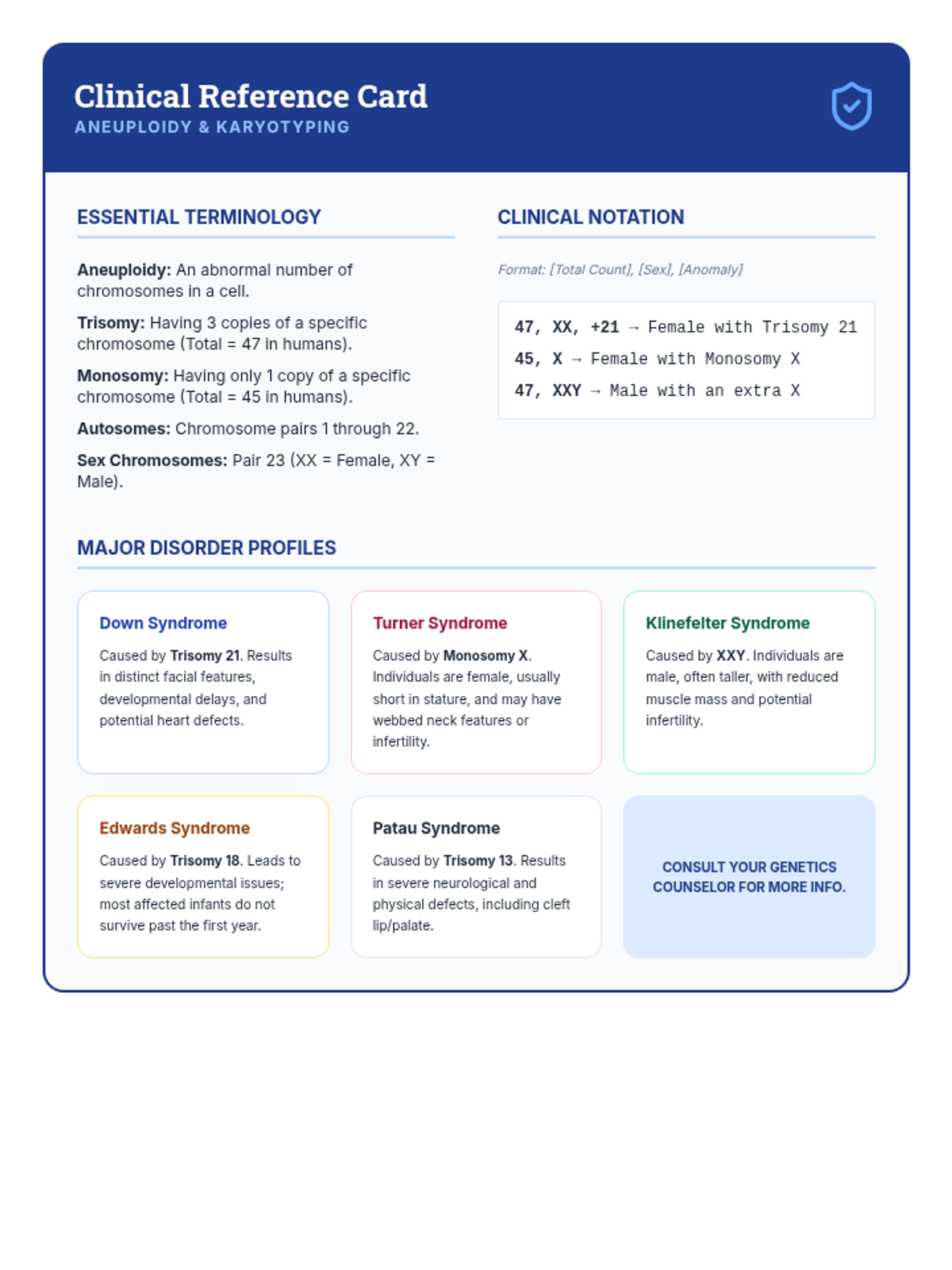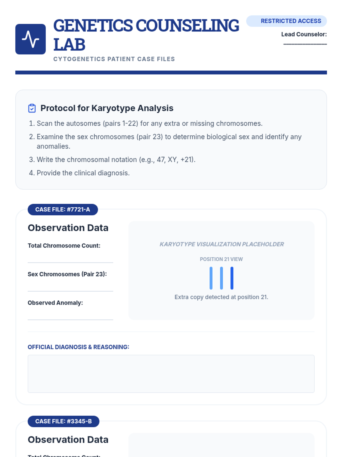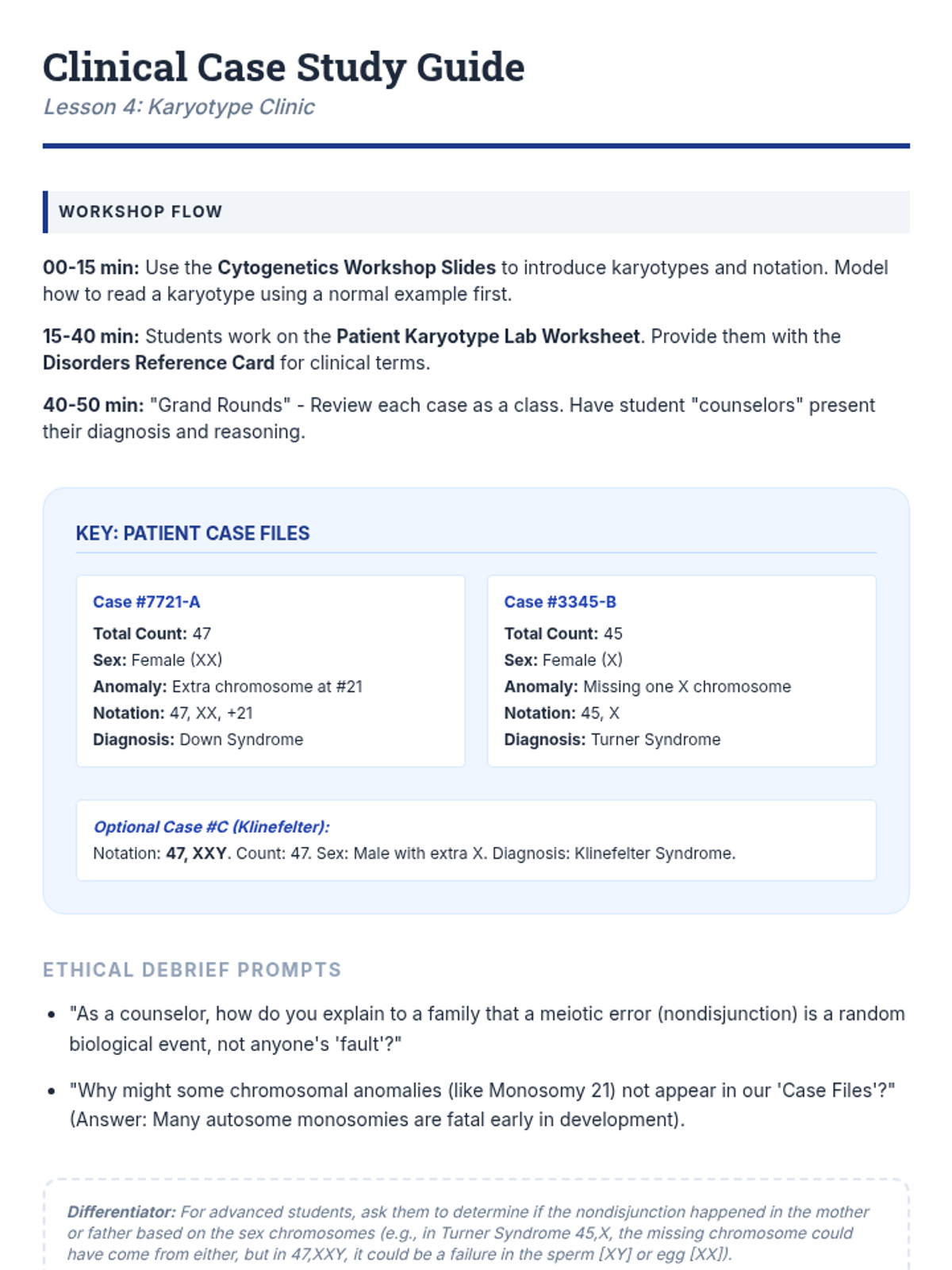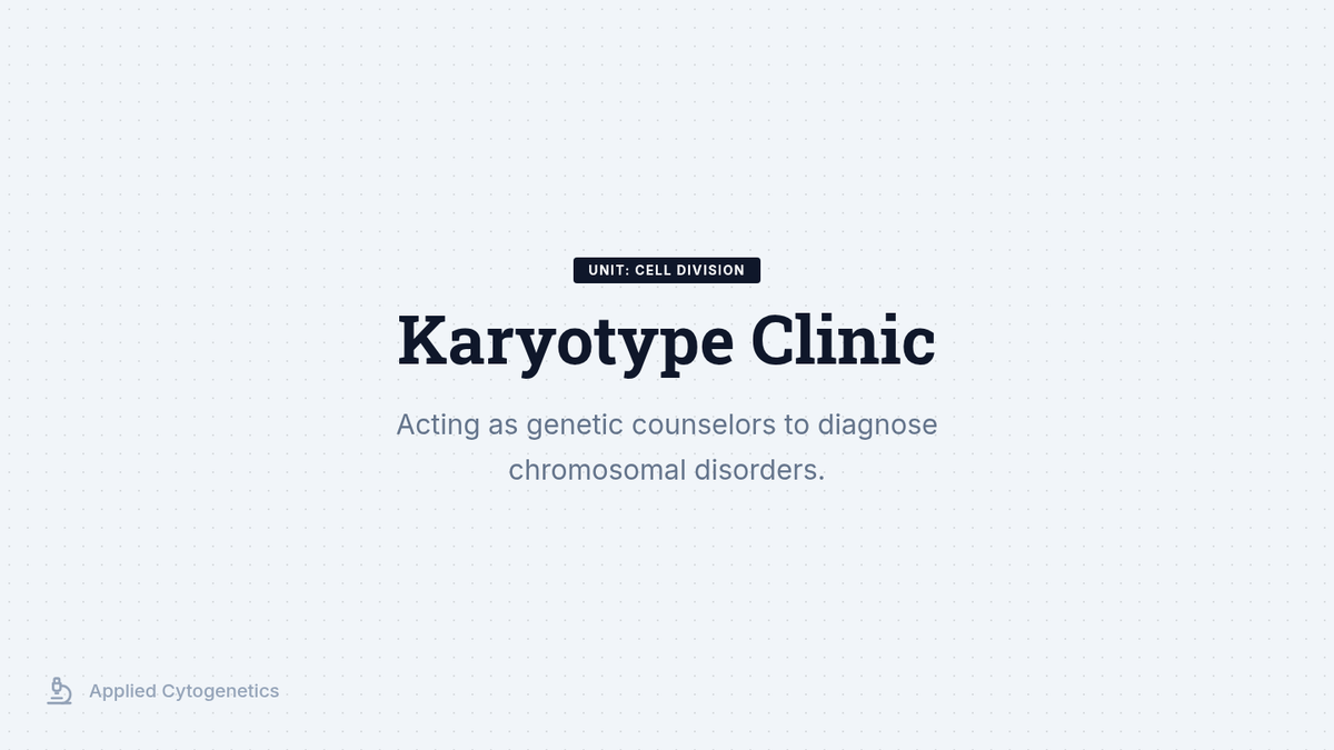 Using their knowledge of nondisjunction, students act as genetic counselors. They analyze patient karyotypes to identify disorders like Down Syndrome, Turner Syndrome, and Klinefelter Syndrome.