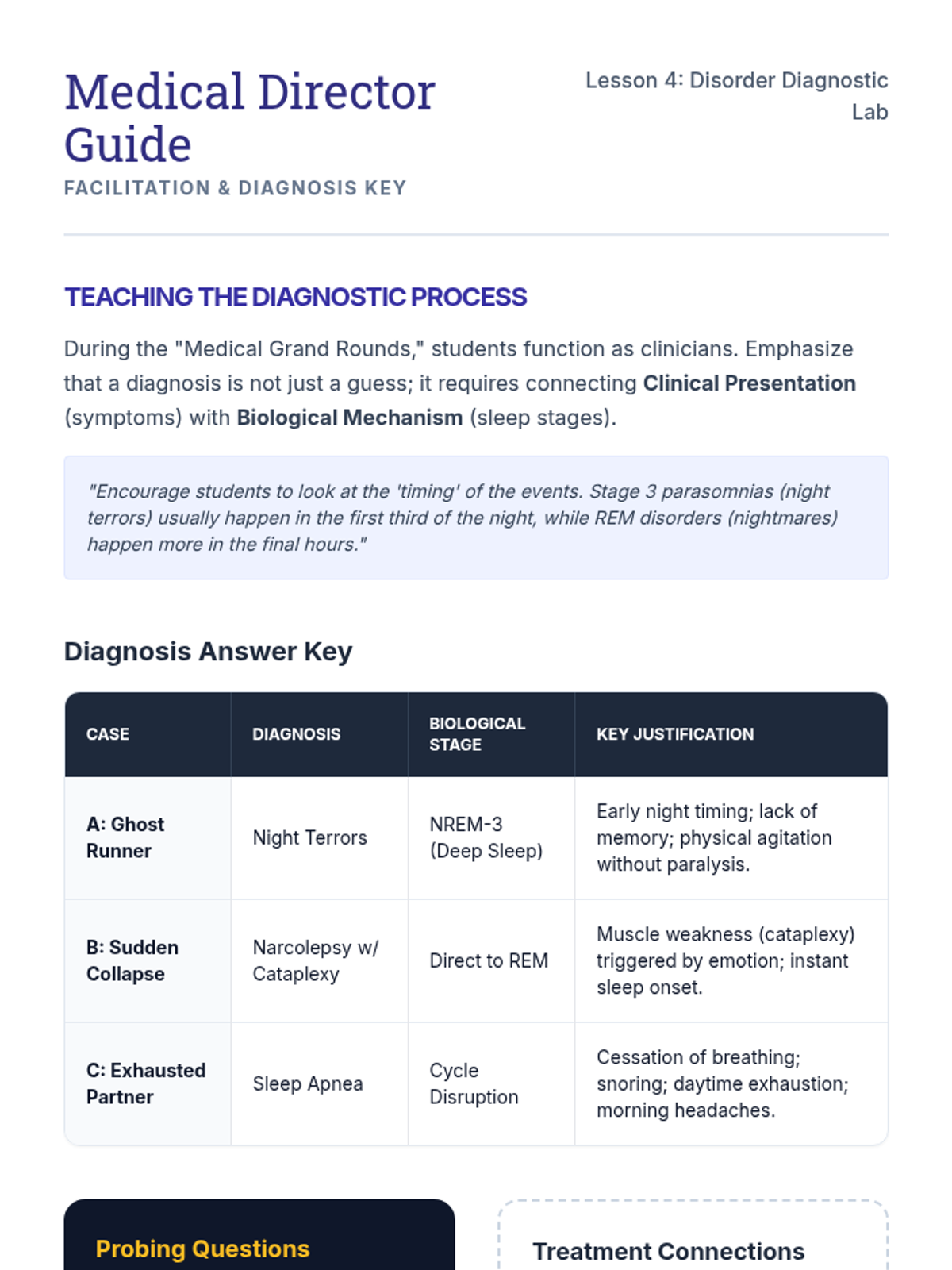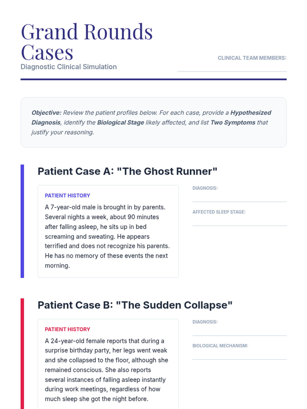 A clinical simulation where students apply their knowledge to diagnose common sleep disorders such as insomnia, sleep apnea, and narcolepsy.