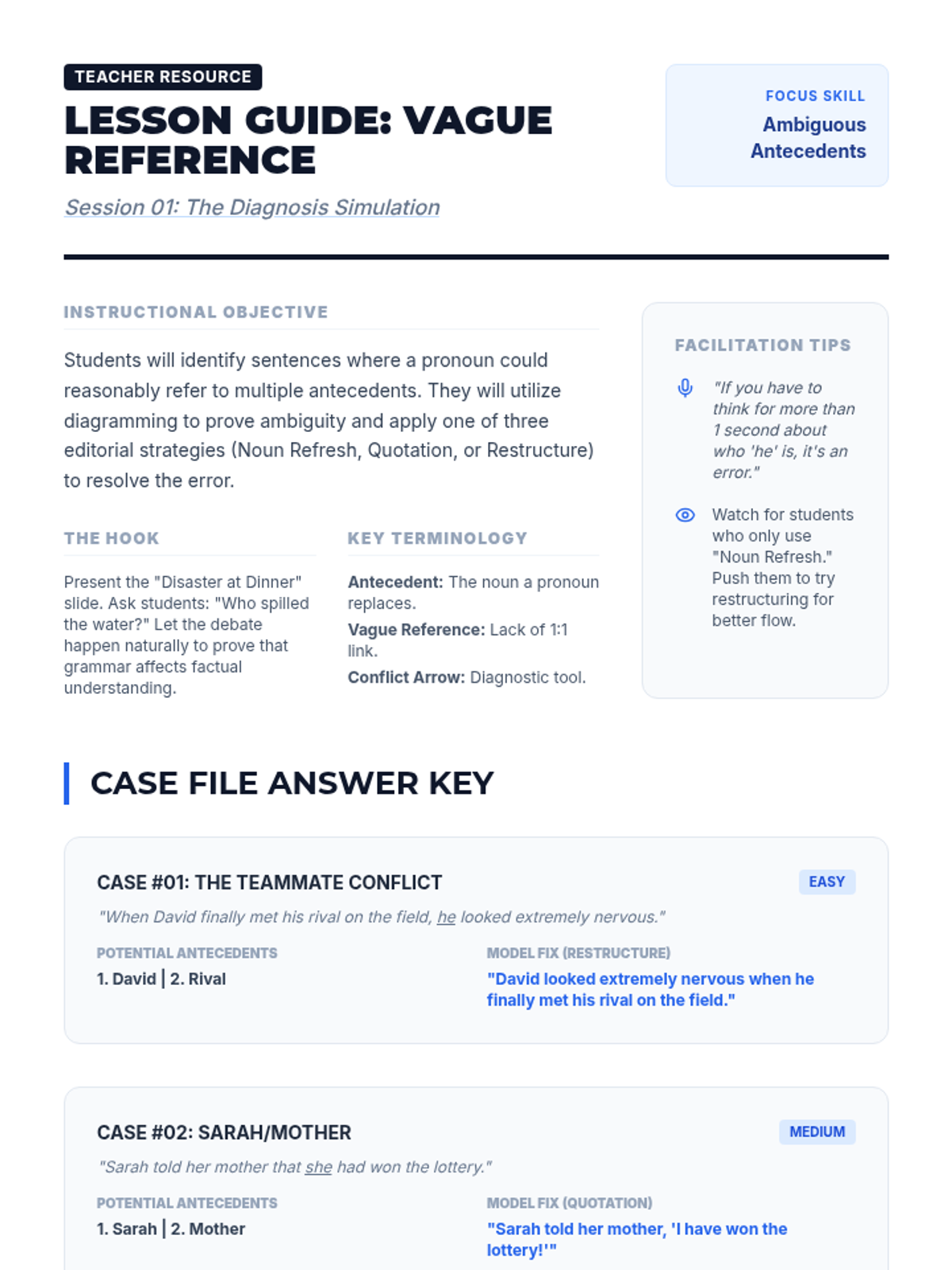 Students identify and correct ambiguous antecedents where a pronoun could refer to multiple nouns, using sentence diagramming to visualize the confusion.