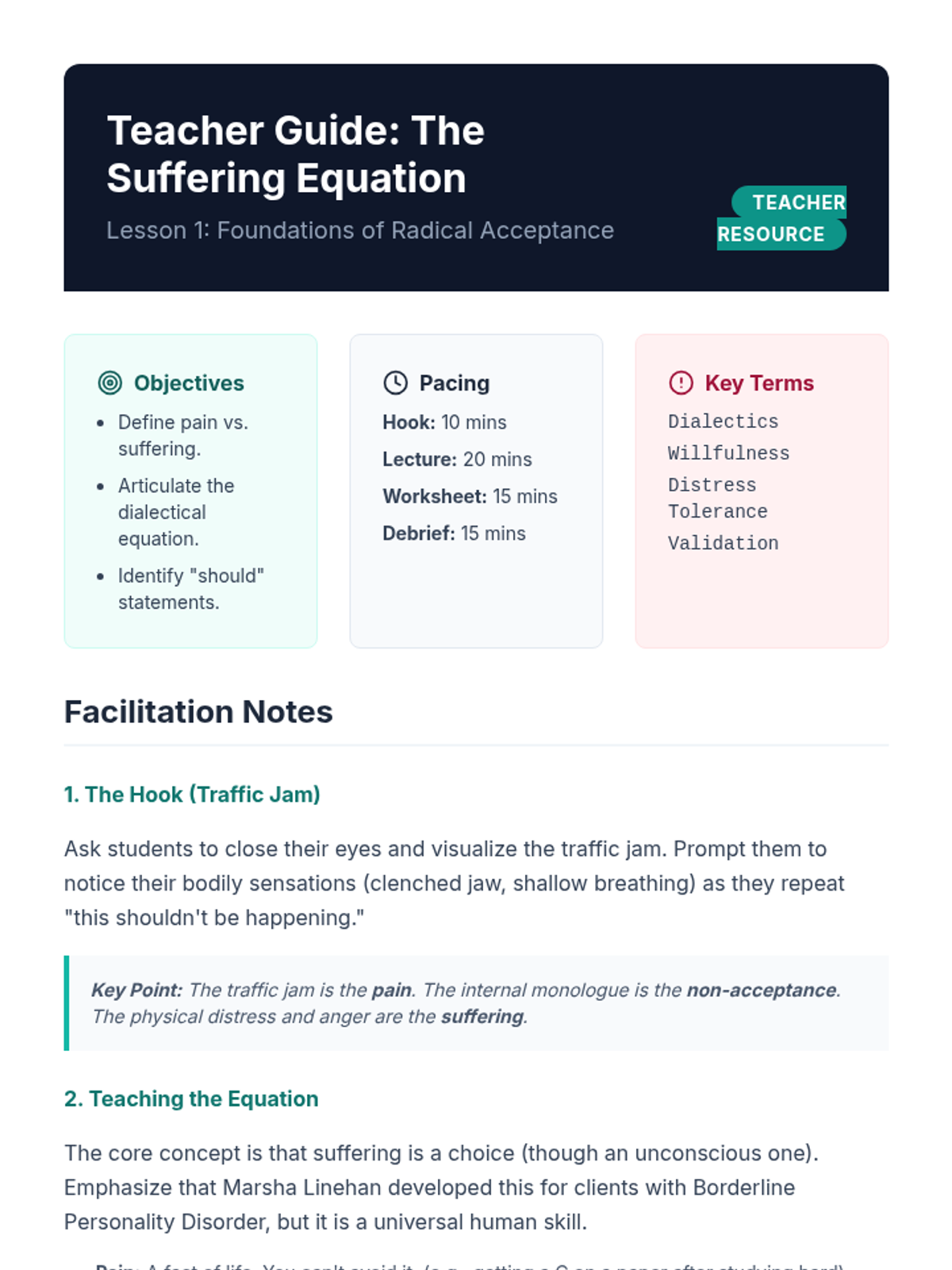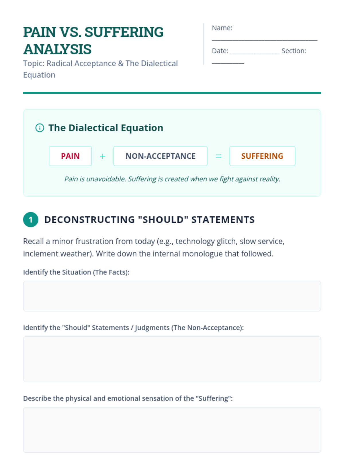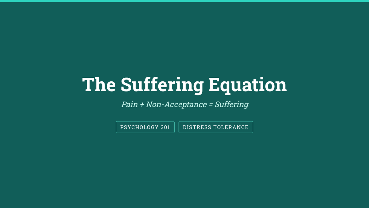 Analyze the foundational equation 'Pain + Non-Acceptance = Suffering' to understand the mechanism of emotional distress. Students distinguish between unavoidable pain and optional suffering created by fighting reality.