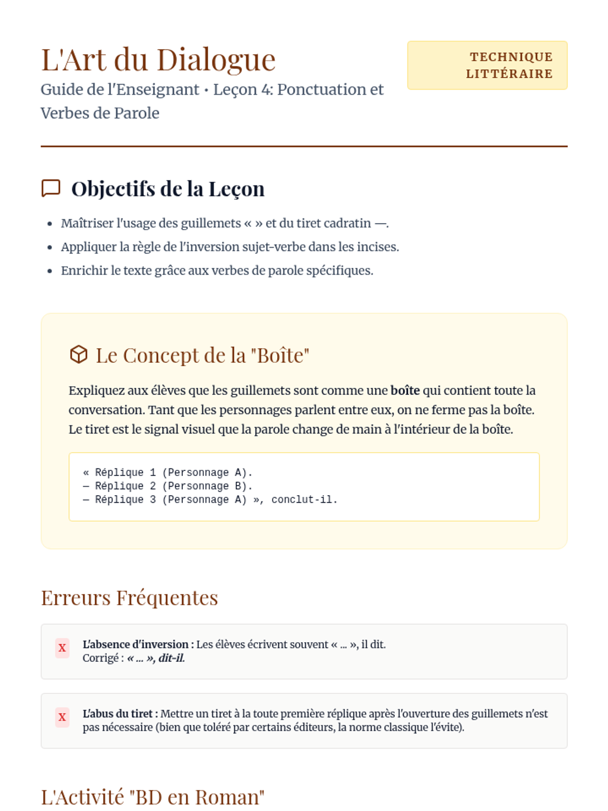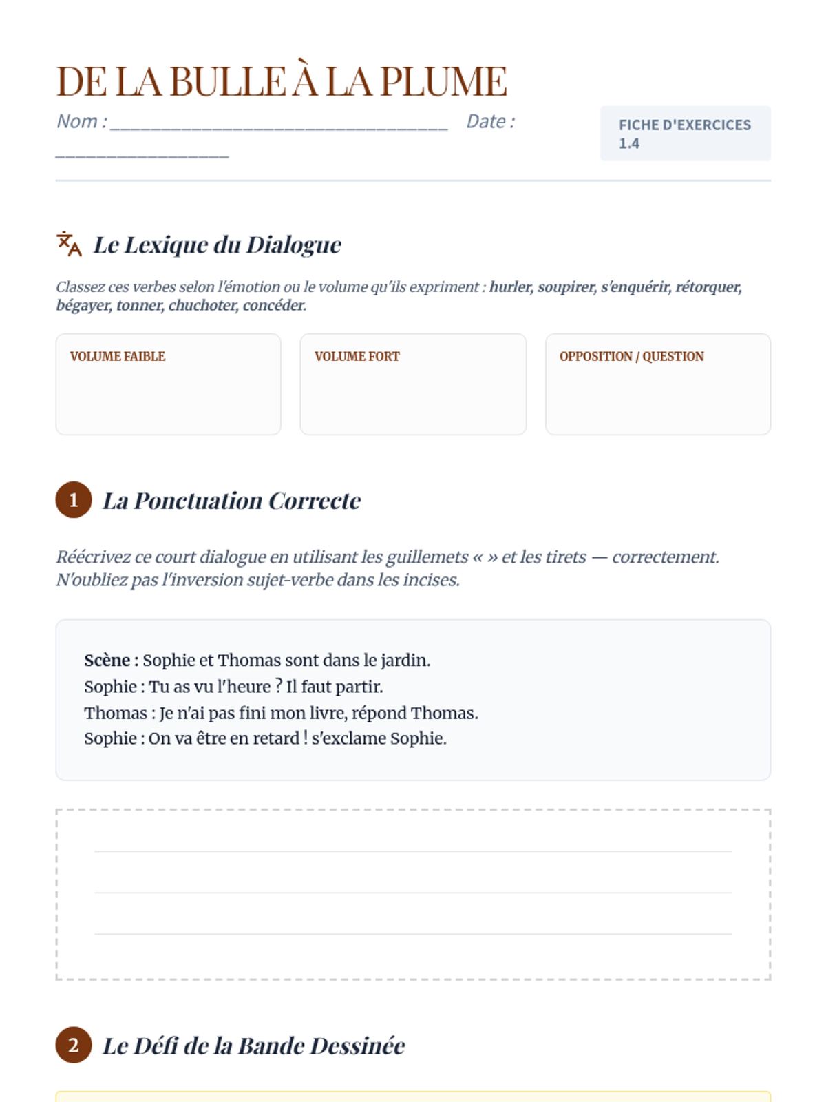 French dialogue punctuation differs from English (dashes vs. quotation marks). Students learn the rules of formatting dialogue and using varied speech tags (dit-il, s'exclama-t-elle).