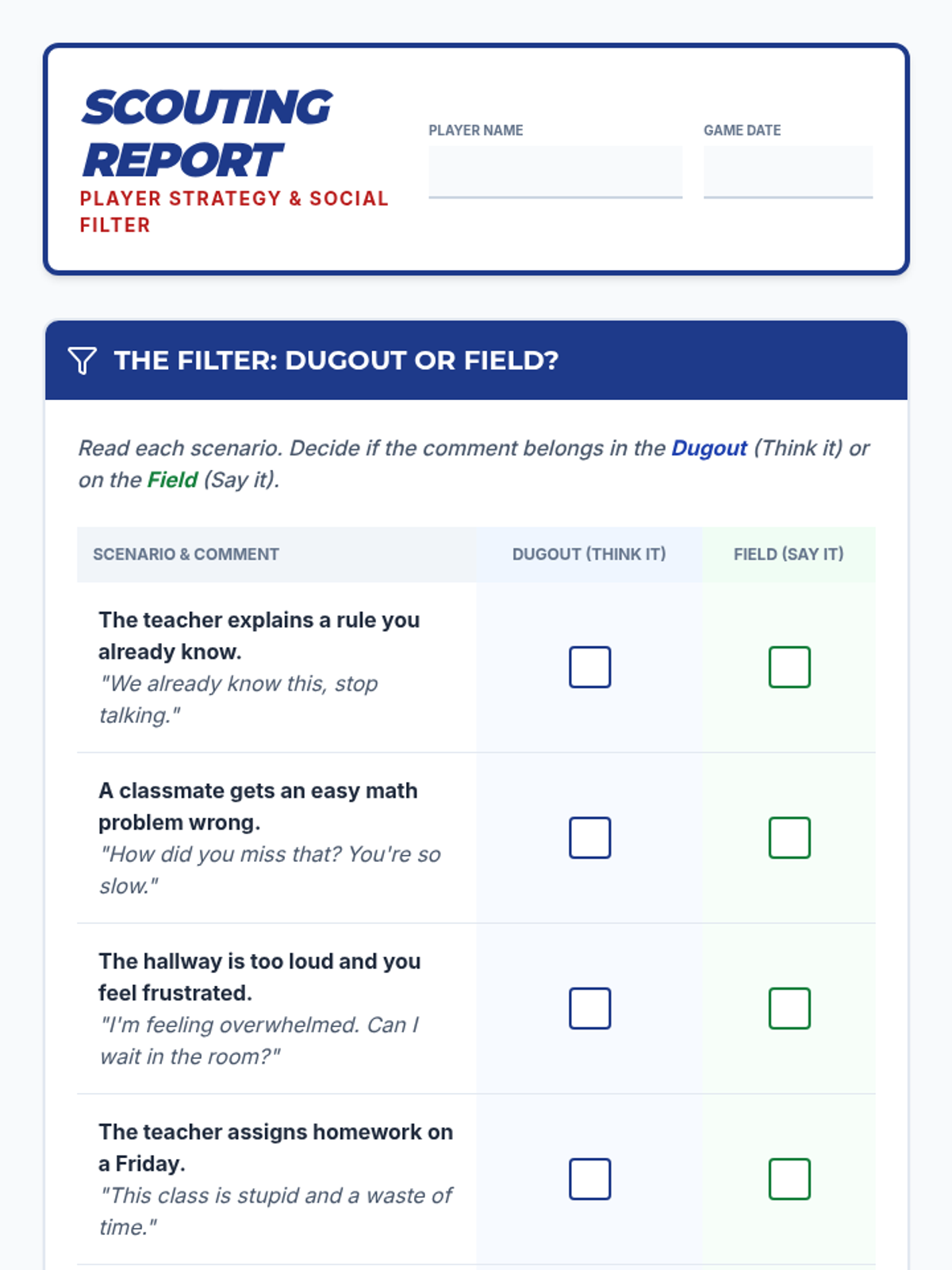 A baseball-themed social skills lesson for 6th graders focusing on the 'Think it vs. Say it' social filter, advocacy skills, and coping strategies. Students learn to navigate school challenges using sports analogies to improve communication and self-regulation.