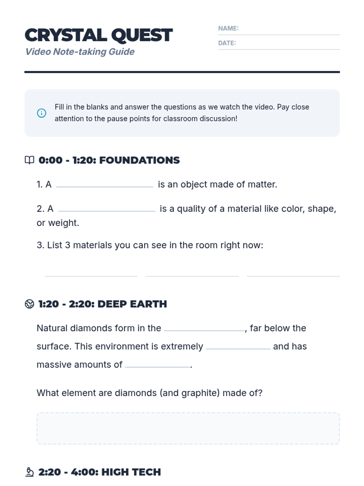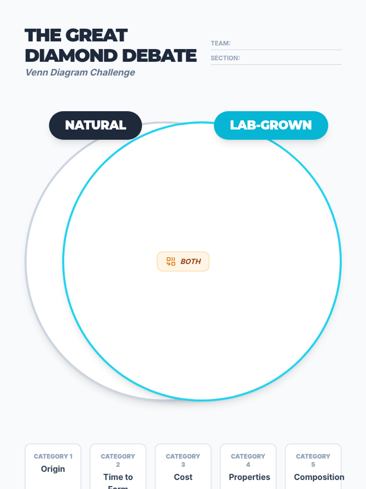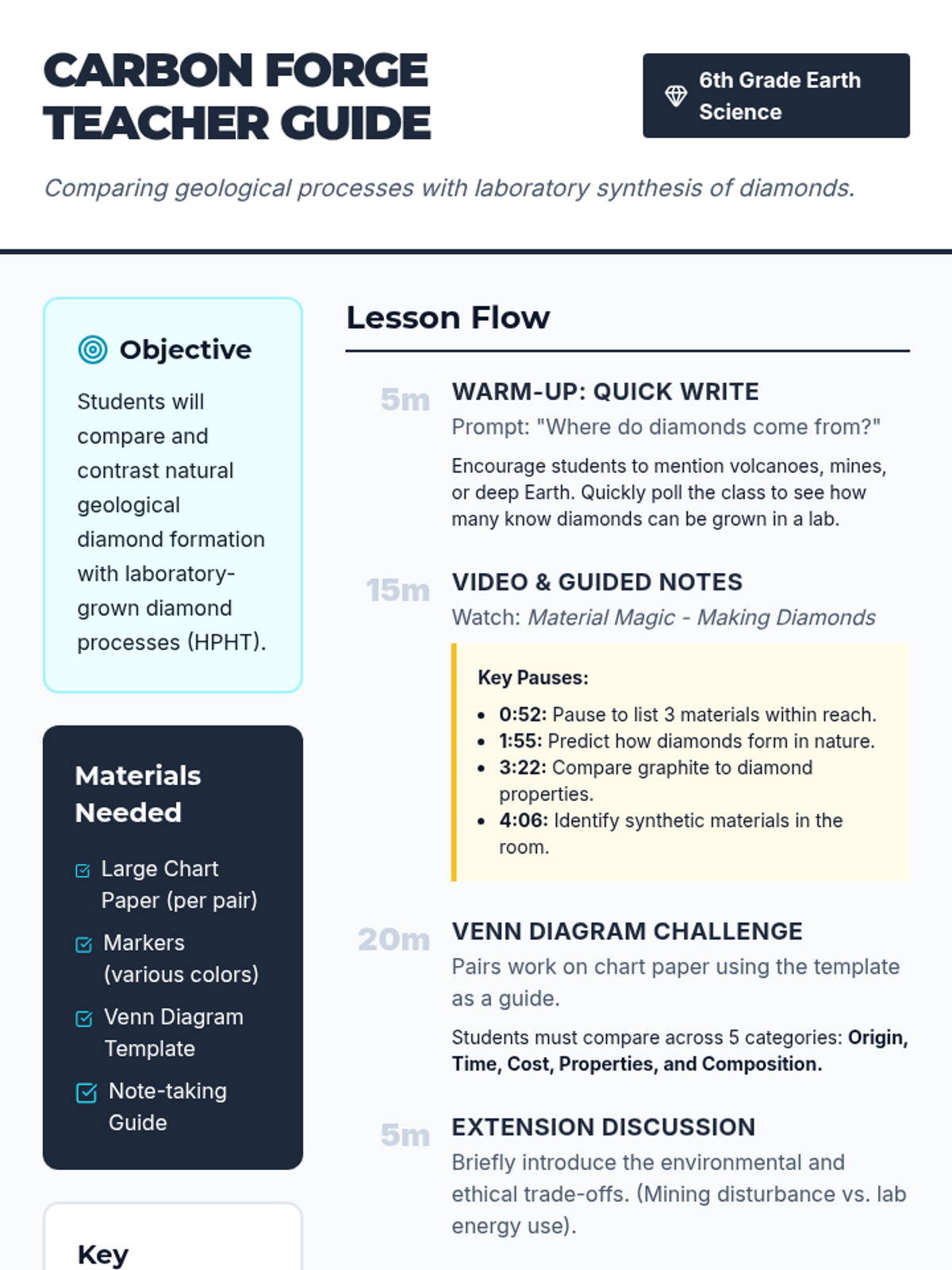 A lesson comparing natural geological diamond formation with laboratory HPHT processes, featuring a Crash Course Kids video and a collaborative Venn Diagram activity.
